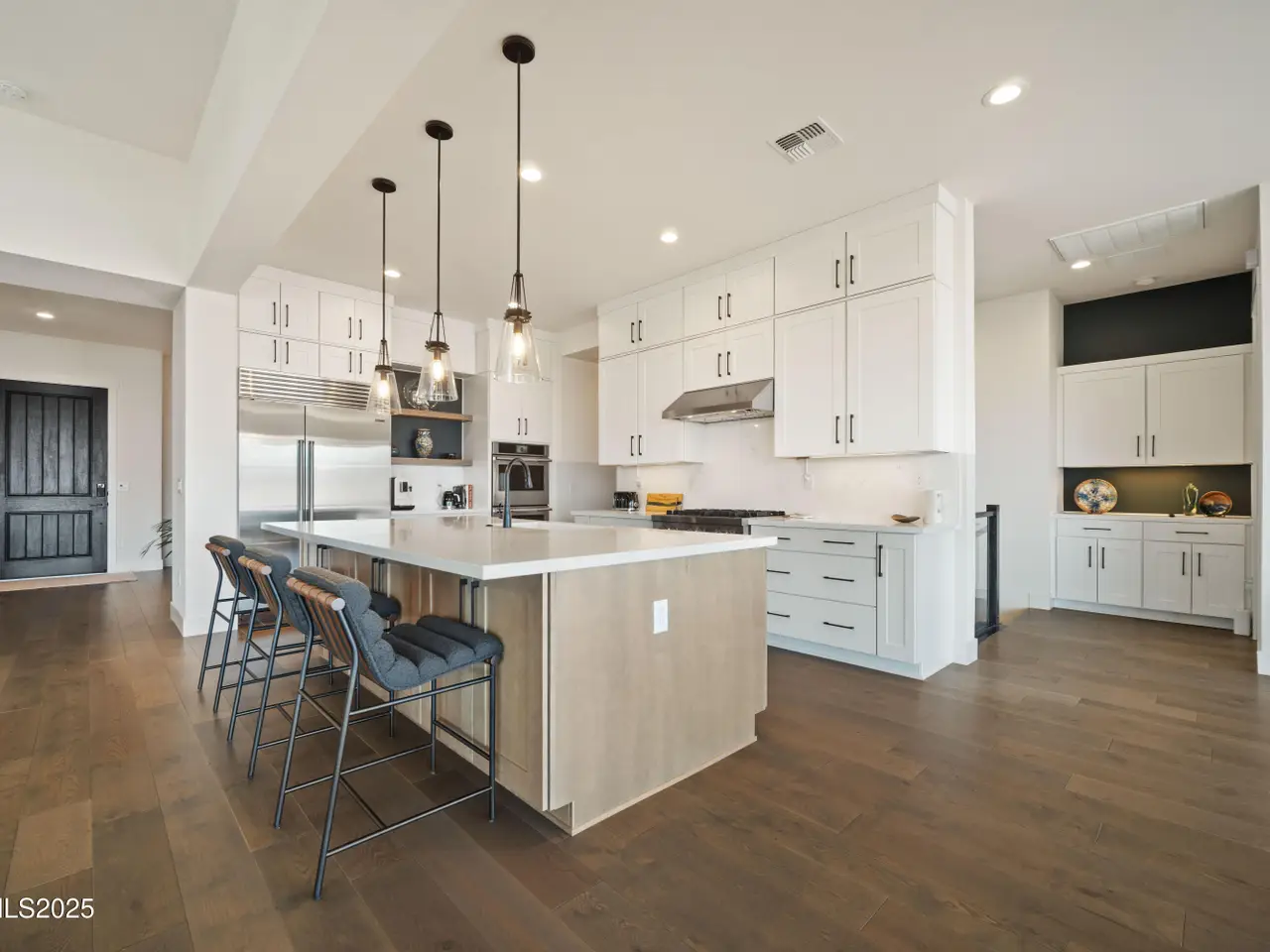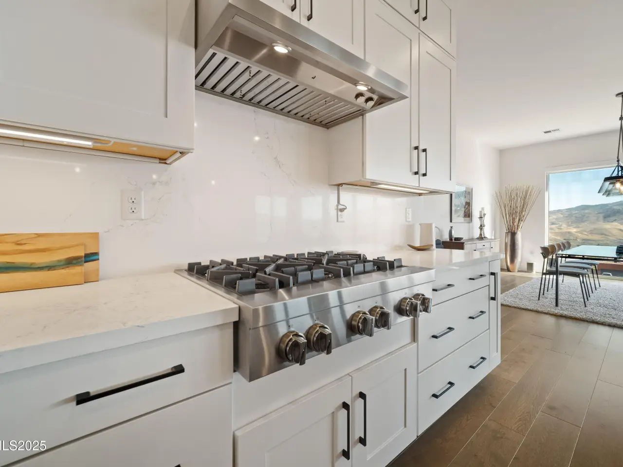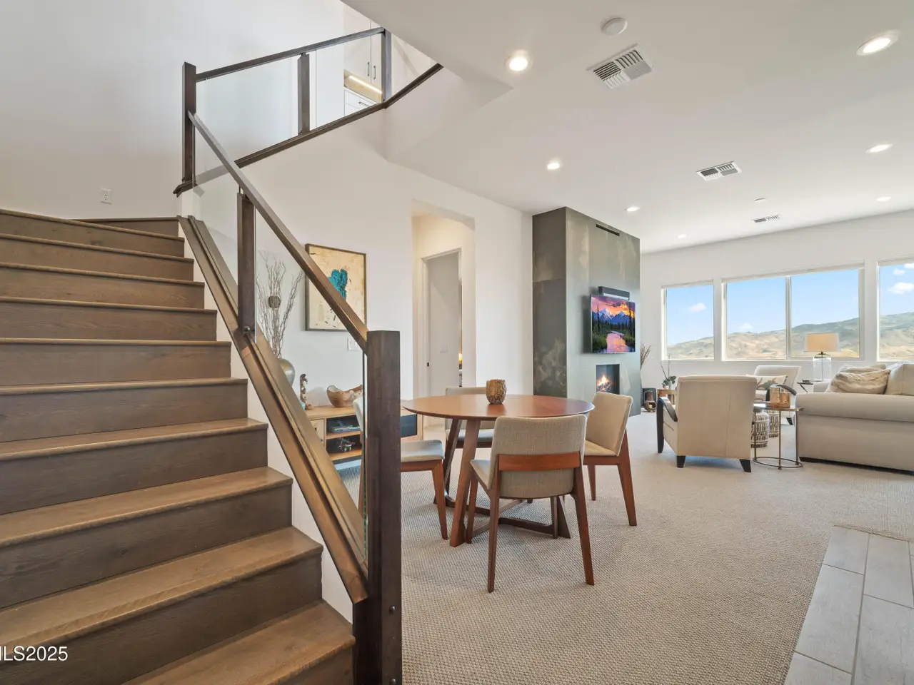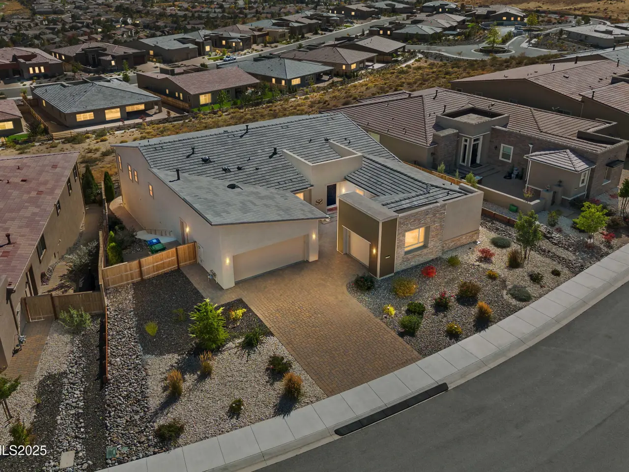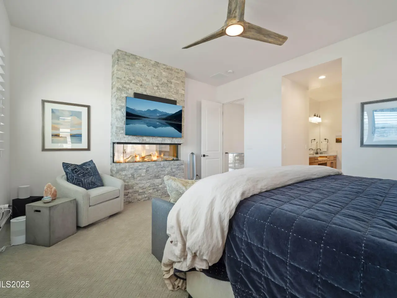 Stunning Modern Home in The Cliffs at Somersett. Discover luxury living in this exquisite 5-bedroom, 5.5-bathroom home located in the prestigious Cliffs community of Somersett. Perched on a premium 180-degree view lot, this meticulously designed residence boasts breathtaking mountain views, sophisticated architecture, and high-end finishes throughout. Enter through a private front courtyard into a spacious open floor plan highlighted by floor-to-ceiling picture windows, hand-troweled walls, and a striking rolled steel fireplace with I-beam detail. The custom glass and wood staircase sets a contemporary tone, while 7" white oak plank flooring adds warmth and elegance. The entertainer's kitchen is a showstopper, featuring a massive 9-foot quartz island, Sub-Zero refrigerator, JennAir appliances, double ovens, a walk-in pantry, and soft-close dovetail cabinetry. Designer light fixtures, black matte hardware, and Italian porcelain surfaces complete the sophisticated design. The walk-out basement includes a newly added fireplace with Italian tile surround, covered patio, and an in-ground hot tub overlooking stunning mountain vistas. Upstairs, enjoy seamless indoor-outdoor living with a multi-panel corner sliding door leading to a large deck—perfect for entertaining. The luxurious primary suite offers a cozy fireplace, spa-like walk-in shower, double vanities, and a spacious walk-in closet. Additional highlights include dual-zone HVAC with two furnaces and water heaters, smart home security, insulated interior walls for soundproofing, never-freeze roof de-icing system, TV/data smurf tubes, a pure water softener, and professionally designed WaterSense landscaping. With a 3-car garage, large laundry/mud room, and exceptional craftsmanship throughout, this home offers comfort, style, and functionality in one of Reno's most sought-after communities.