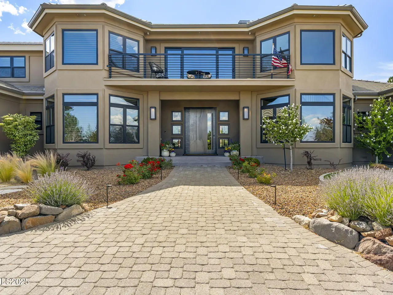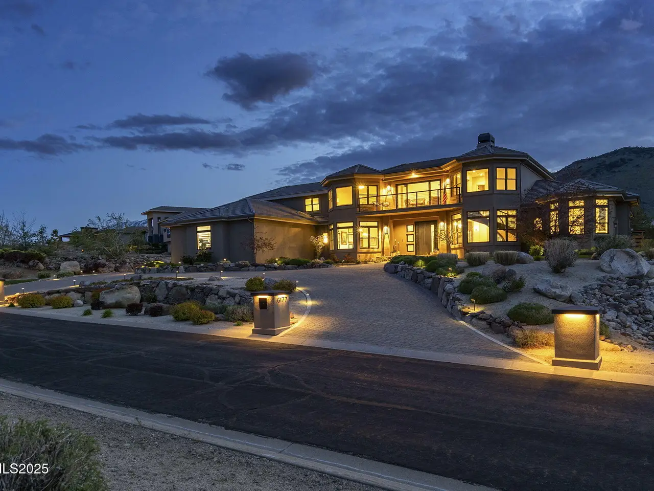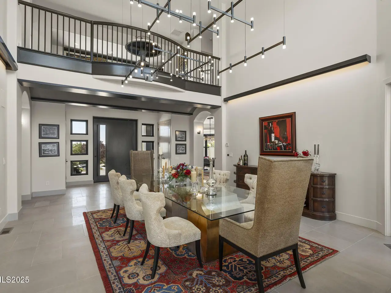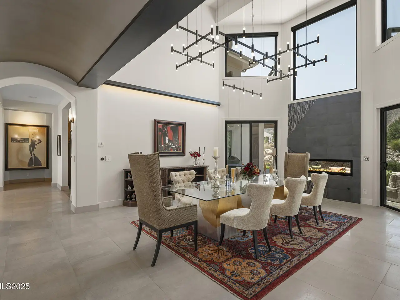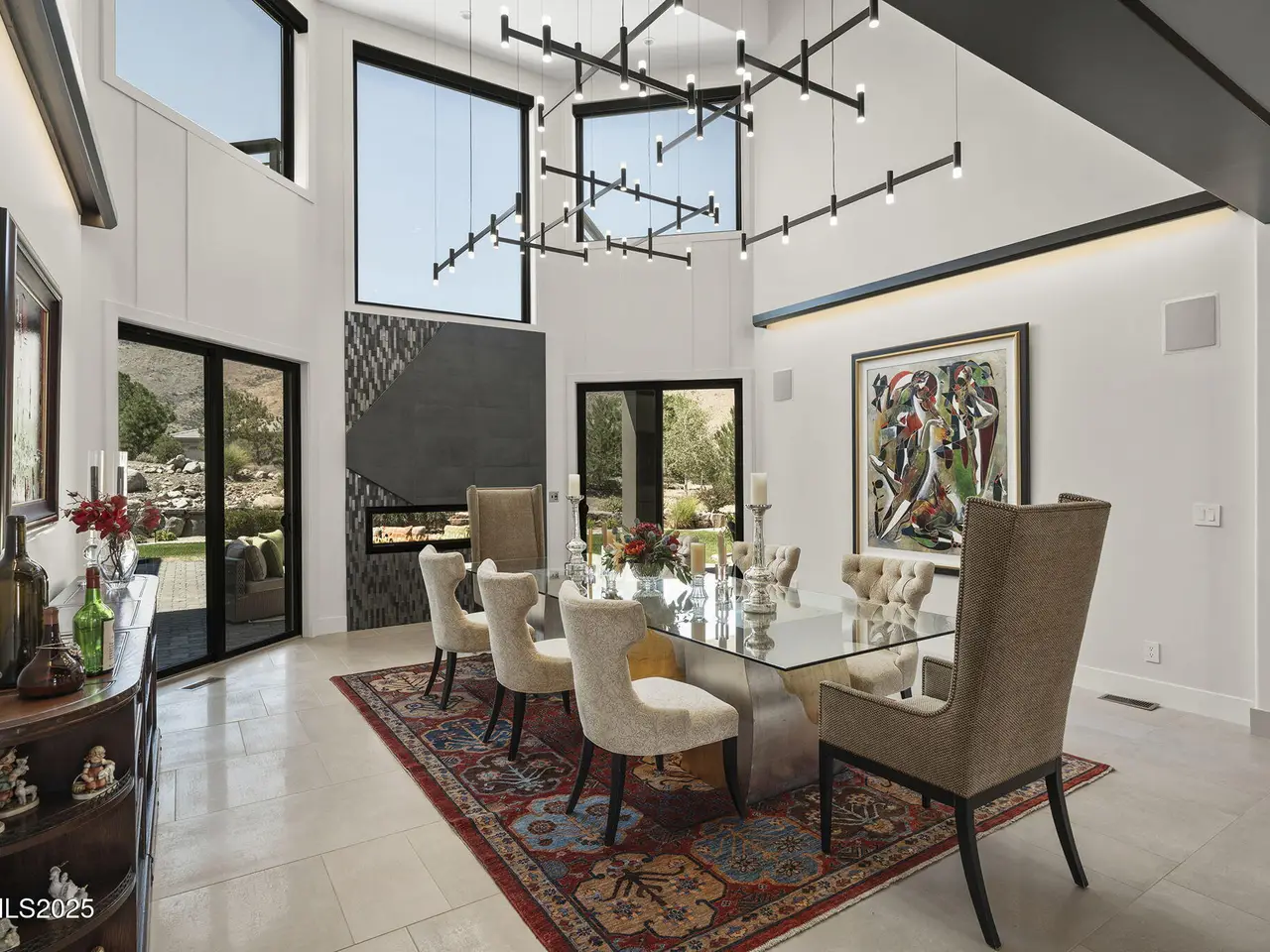 Step into 6177 North Featherstone, a residence reimagined from the ground up to embody the sophistication of design and the effortless grace of High Desert living. Nestled within the prestigious ArrowCreek community, this fully remodeled estate offers 5,586 square feet of inspired living on a full acre. With sweeping views across the Sierra Nevada and Mt. Rose mountains, lush golf fairways, and sparkling city lights, every angle of this home tells a story of elegance and connection to its surroundings. The owners began their remodel with purpose: to create a seamless flow, where form meets function and every detail enhances life, leisure, and entertaining. Walls were softened, pillars removed, and spaces reimagined to capture natural light and open sightlines. Modern finishes and thoughtful design balance grandeur with comfort. A finished basement and upstairs library added 312 square feet, expanding versatility without sacrificing intimacy. Arrival makes an unforgettable impression with a custom 9x6 steel pivot door by Modern Steel Doors of Arizona. Inside, a light-filled foyer leads to an expanded balcony, where sweeping golf course and city views set the stage for sunrise coffee or starlit evenings. At the heart of the home, the Dining Room has been elevated into a dramatic entertaining space with soaring two-story ceilings and a two-sided fireplace connecting indoors and outdoors. Andersen sliding doors open to patios and gardens, while striking Sonneman fixtures and art lighting create ambiance. Whether hosting holidays or intimate dinners, the space adapts with ease. The Main En Suite is a private retreat, complete with custom California Closets, cove lighting, and remote-controlled Hunter Douglas shades. The spa-inspired bath showcases a freestanding soaking tub beneath chandeliers, a dual-entry steam shower with rain head and sprayers, natural stone floors, shimmering glass tile, and custom cabinetry with quartz counters and lighted mirrors. The Great Room centers on a custom travertine fireplace with black quartz mantel, complemented by wood-grain tile floors, a Minka Aire fan, and integrated Sonos audio. The Kitchen and Nook feature a Wolf 48" range, Sub-Zero refrigerator, and a central island with seating. The Games Room delights with Hubbardton Forge lighting, speakers, and motorized shades. A dramatic staircase of black-stained oak and iron railings rises beneath a cascading Sonneman chandelier. Upstairs, the new Library offers custom bookcases, club seating, and a 12-foot Andersen glass wall opening to a balcony with panoramic views. Four additional en suite bedrooms provide privacy, storage, and character. Outdoors, multiple patios, a two-sided fireplace, and landscaped grounds enhanced with solar lighting create serene gathering spaces. Modern systems include central HVAC with three units, radiant heated floors, Tesla solar panels, Cat-6 wiring, Sonos audio, and a four-car garage with EV charger. This estate is more than a home—it is a lifestyle. From morning coffee on the balcony to wine in the library at dusk, from quiet family nights to grand celebrations, this residence harmonizes elegance, comfort, and versatility. Every space has been thoughtfully crafted, every view a reminder of Reno's beauty. This is a rare opportunity to own a fully realized vision of home, where luxury and ease coexist seamlessly.
