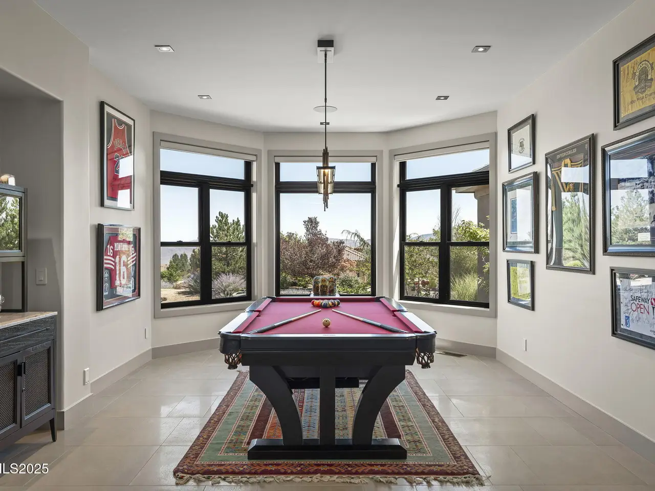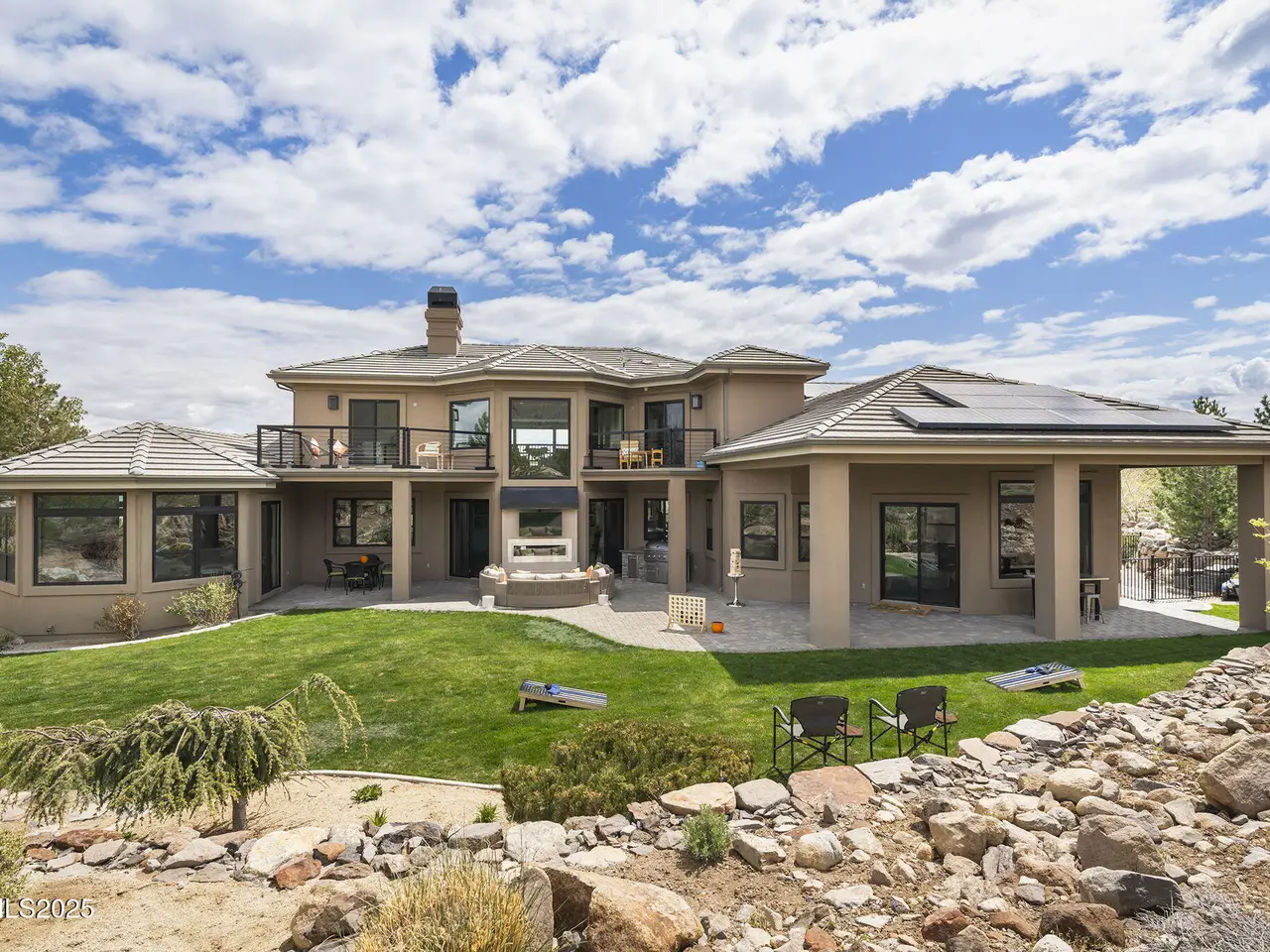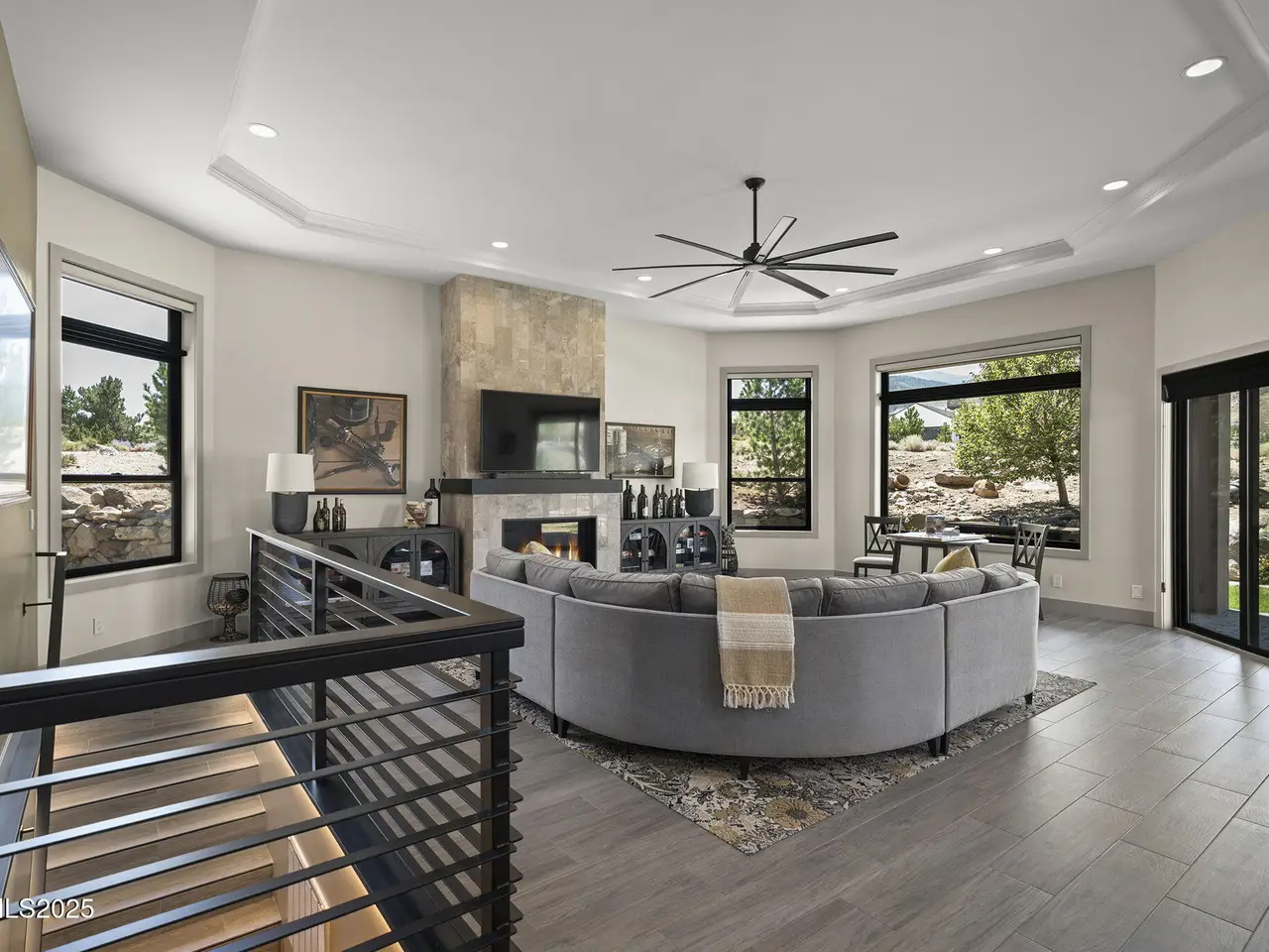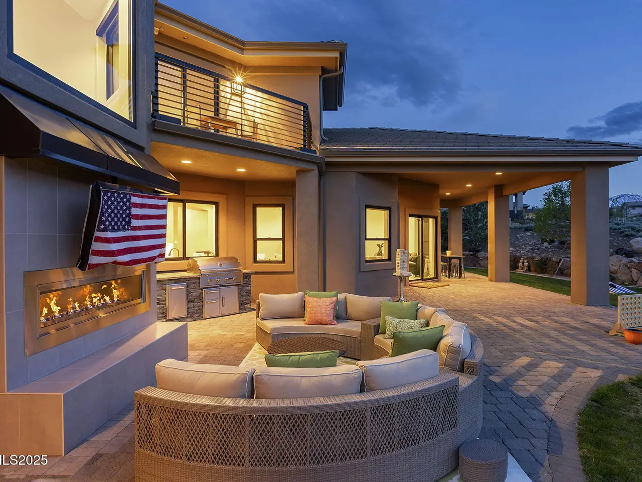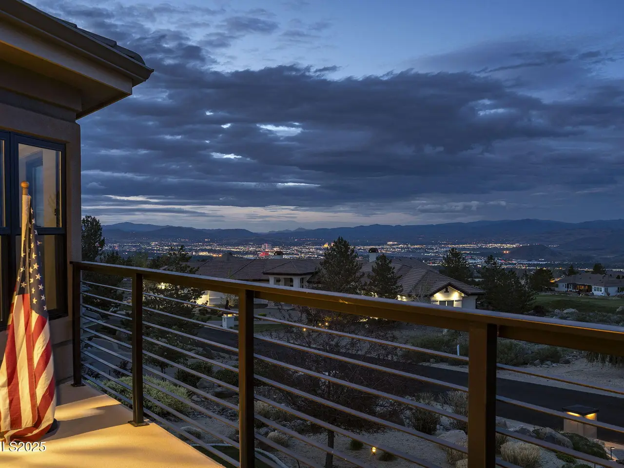 Step into 6177 North Featherstone, a residence reimagined from the ground up to embody the sophistication of design and the effortless grace of High Desert living. Nestled within the prestigious ArrowCreek community, this fully remodeled estate offers 5,586 square feet of inspired living on a full acre. With sweeping views across the Sierra Nevada and Mt. Rose mountains, lush golf fairways, and sparkling city lights, every angle of this home tells a story of elegance and connection to its surroundings. The owners began their remodel with purpose: to create a seamless flow, where form meets function and every detail enhances life, leisure, and entertaining. Walls were softened, pillars removed, and spaces reimagined to capture natural light and open sightlines. Modern finishes and thoughtful design balance grandeur with comfort. A finished basement and upstairs library added 312 square feet, expanding versatility without sacrificing intimacy. Arrival makes an unforgettable impression with a custom 9x6 steel pivot door by Modern Steel Doors of Arizona. Inside, a light-filled foyer leads to an expanded balcony, where sweeping golf course and city views set the stage for sunrise coffee or starlit evenings. At the heart of the home, the Dining Room has been elevated into a dramatic entertaining space with soaring two-story ceilings and a two-sided fireplace connecting indoors and outdoors. Andersen sliding doors open to patios and gardens, while striking Sonneman fixtures and art lighting create ambiance. Whether hosting holidays or intimate dinners, the space adapts with ease. The Main En Suite is a private retreat, complete with custom California Closets, cove lighting, and remote-controlled Hunter Douglas shades. The spa-inspired bath showcases a freestanding soaking tub beneath chandeliers, a dual-entry steam shower with rain head and sprayers, natural stone floors, shimmering glass tile, and custom cabinetry with quartz counters and lighted mirrors. The Great Room centers on a custom travertine fireplace with black quartz mantel, complemented by wood-grain tile floors, a Minka Aire fan, and integrated Sonos audio. The Kitchen and Nook feature a Wolf 48" range, Sub-Zero refrigerator, and a central island with seating. The Games Room delights with Hubbardton Forge lighting, speakers, and motorized shades. A dramatic staircase of black-stained oak and iron railings rises beneath a cascading Sonneman chandelier. Upstairs, the new Library offers custom bookcases, club seating, and a 12-foot Andersen glass wall opening to a balcony with panoramic views. Four additional en suite bedrooms provide privacy, storage, and character. Outdoors, multiple patios, a two-sided fireplace, and landscaped grounds enhanced with solar lighting create serene gathering spaces. Modern systems include central HVAC with three units, radiant heated floors, Tesla solar panels, Cat-6 wiring, Sonos audio, and a four-car garage with EV charger. This estate is more than a home—it is a lifestyle. From morning coffee on the balcony to wine in the library at dusk, from quiet family nights to grand celebrations, this residence harmonizes elegance, comfort, and versatility. Every space has been thoughtfully crafted, every view a reminder of Reno's beauty. This is a rare opportunity to own a fully realized vision of home, where luxury and ease coexist seamlessly.