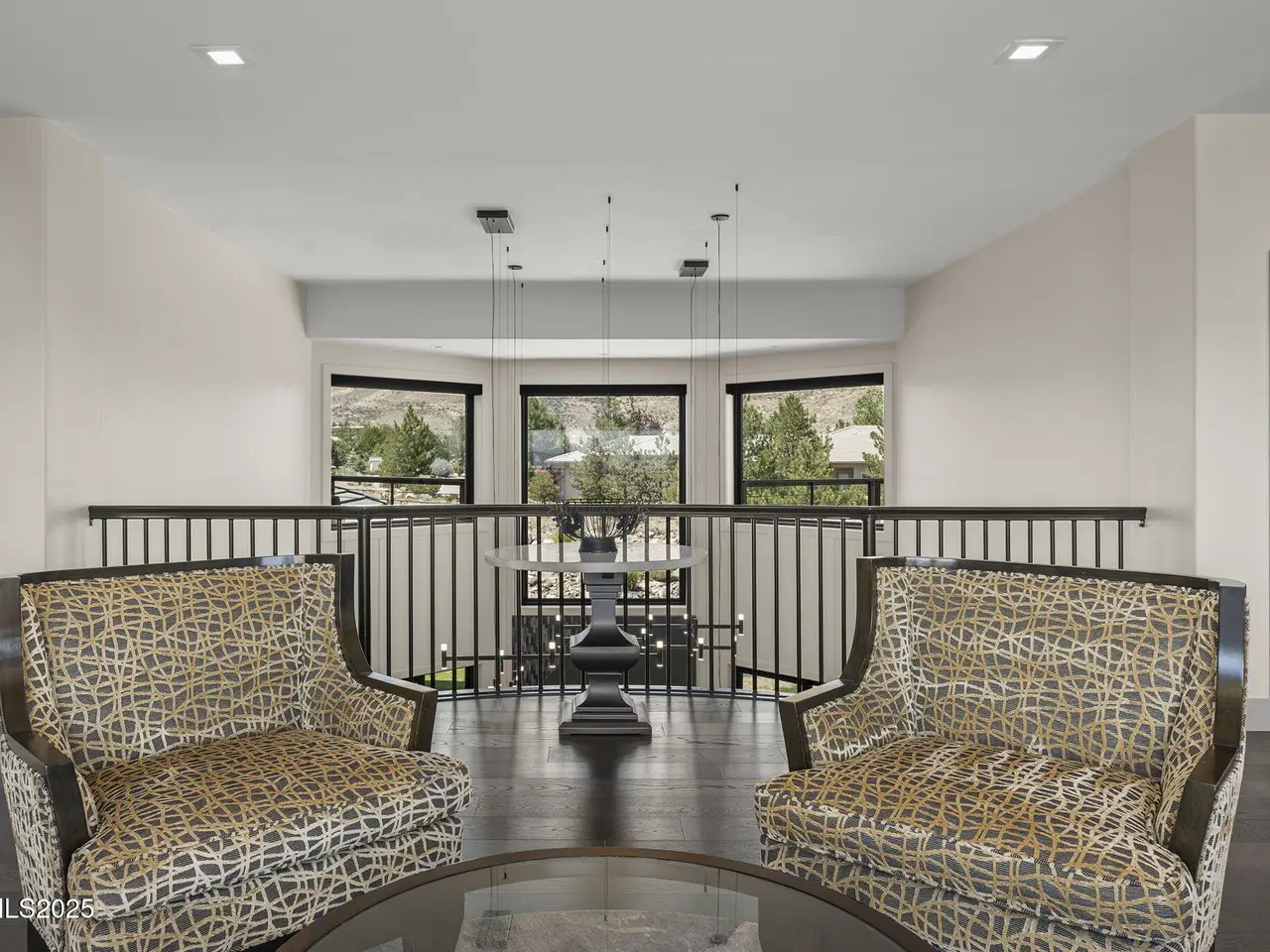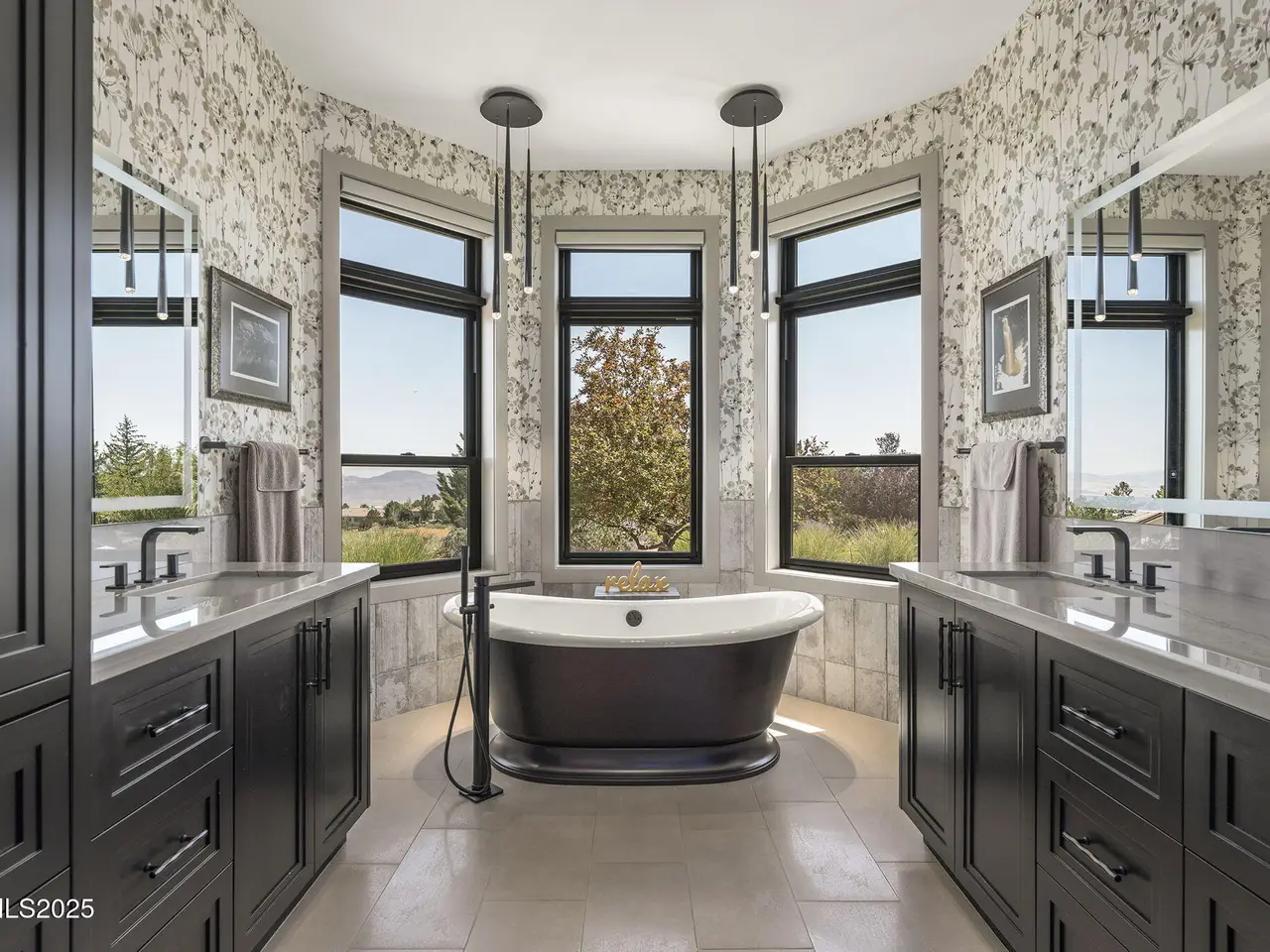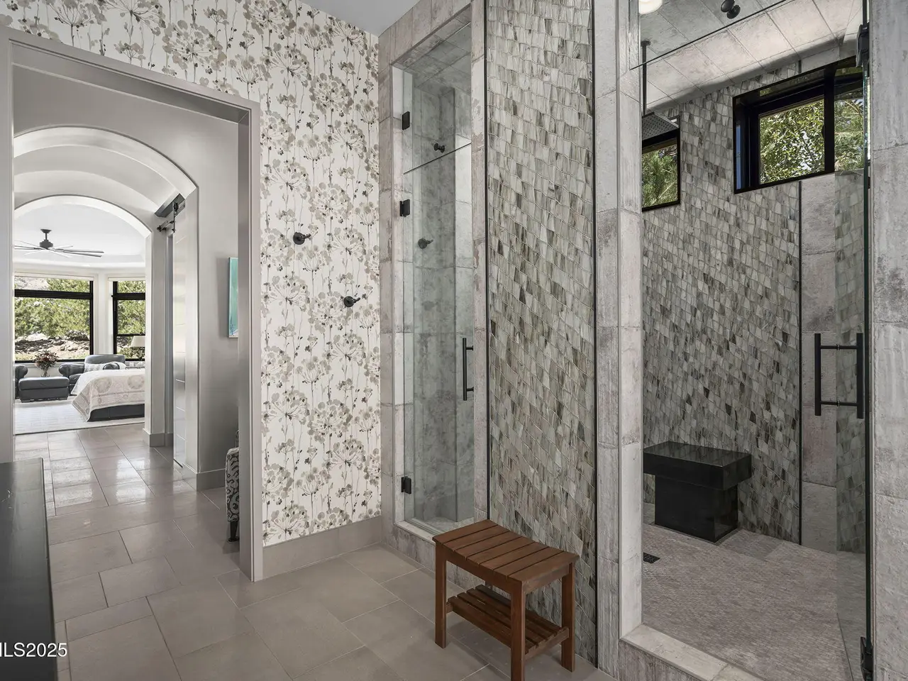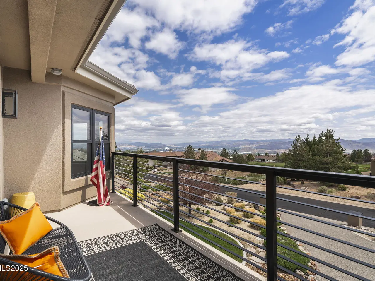 Step into 6177 North Featherstone, a residence reimagined from the ground up to embody the sophistication of design and the effortless grace of High Desert living. Nestled within the prestigious ArrowCreek community, this fully remodeled estate offers 5,586 square feet of inspired living on a full acre. With sweeping views across the Sierra Nevada and Mt. Rose mountains, lush golf fairways, and sparkling city lights, every angle of this home tells a story of elegance and connection to its surroundings. The owners began their remodel with purpose: to create a seamless flow, where form meets function and every detail enhances life, leisure, and entertaining. Walls were softened, pillars removed, and spaces reimagined to capture natural light and open sightlines. Modern finishes and thoughtful design balance grandeur with comfort. A finished basement and upstairs library added 312 square feet, expanding versatility without sacrificing intimacy. Arrival makes an unforgettable impression with a custom 9x6 steel pivot door by Modern Steel Doors of Arizona. Inside, a light-filled foyer leads to an expanded balcony, where sweeping golf course and city views set the stage for sunrise coffee or starlit evenings. At the heart of the home, the Dining Room has been elevated into a dramatic entertaining space with soaring two-story ceilings and a two-sided fireplace connecting indoors and outdoors. Andersen sliding doors open to patios and gardens, while striking Sonneman fixtures and art lighting create ambiance. Whether hosting holidays or intimate dinners, the space adapts with ease. The Main En Suite is a private retreat, complete with custom California Closets, cove lighting, and remote-controlled Hunter Douglas shades. The spa-inspired bath showcases a freestanding soaking tub beneath chandeliers, a dual-entry steam shower with rain head and sprayers, natural stone floors, shimmering glass tile, and custom cabinetry with quartz counters and lighted mirrors. The Great Room centers on a custom travertine fireplace with black quartz mantel, complemented by wood-grain tile floors, a Minka Aire fan, and integrated Sonos audio. The Kitchen and Nook feature a Wolf 48" range, Sub-Zero refrigerator, and a central island with seating. The Games Room delights with Hubbardton Forge lighting, speakers, and motorized shades. A dramatic staircase of black-stained oak and iron railings rises beneath a cascading Sonneman chandelier. Upstairs, the new Library offers custom bookcases, club seating, and a 12-foot Andersen glass wall opening to a balcony with panoramic views. Four additional en suite bedrooms provide privacy, storage, and character. Outdoors, multiple patios, a two-sided fireplace, and landscaped grounds enhanced with solar lighting create serene gathering spaces. Modern systems include central HVAC with three units, radiant heated floors, Tesla solar panels, Cat-6 wiring, Sonos audio, and a four-car garage with EV charger. This estate is more than a home—it is a lifestyle. From morning coffee on the balcony to wine in the library at dusk, from quiet family nights to grand celebrations, this residence harmonizes elegance, comfort, and versatility. Every space has been thoughtfully crafted, every view a reminder of Reno's beauty. This is a rare opportunity to own a fully realized vision of home, where luxury and ease coexist seamlessly.