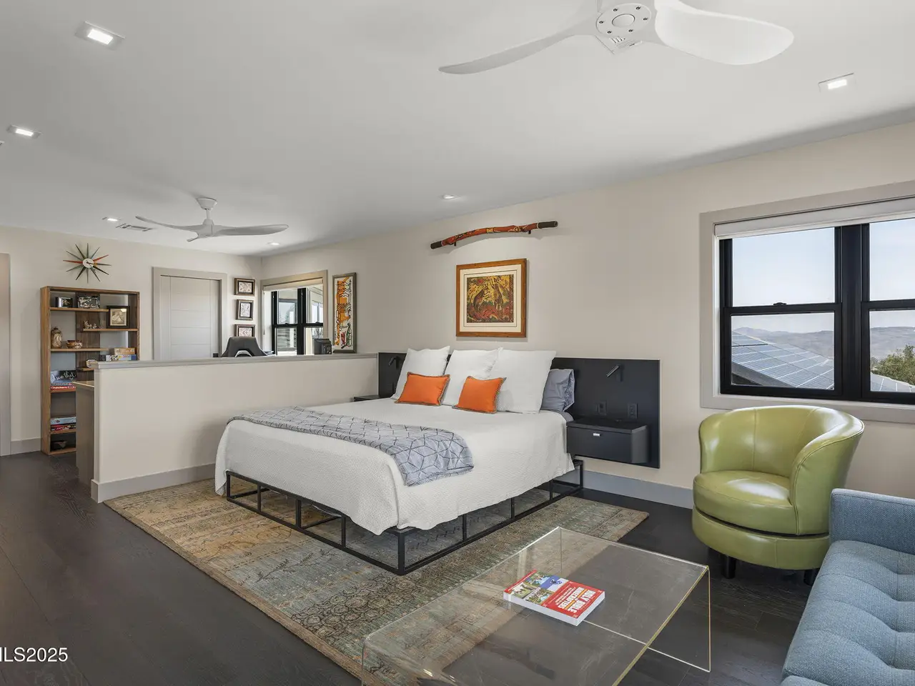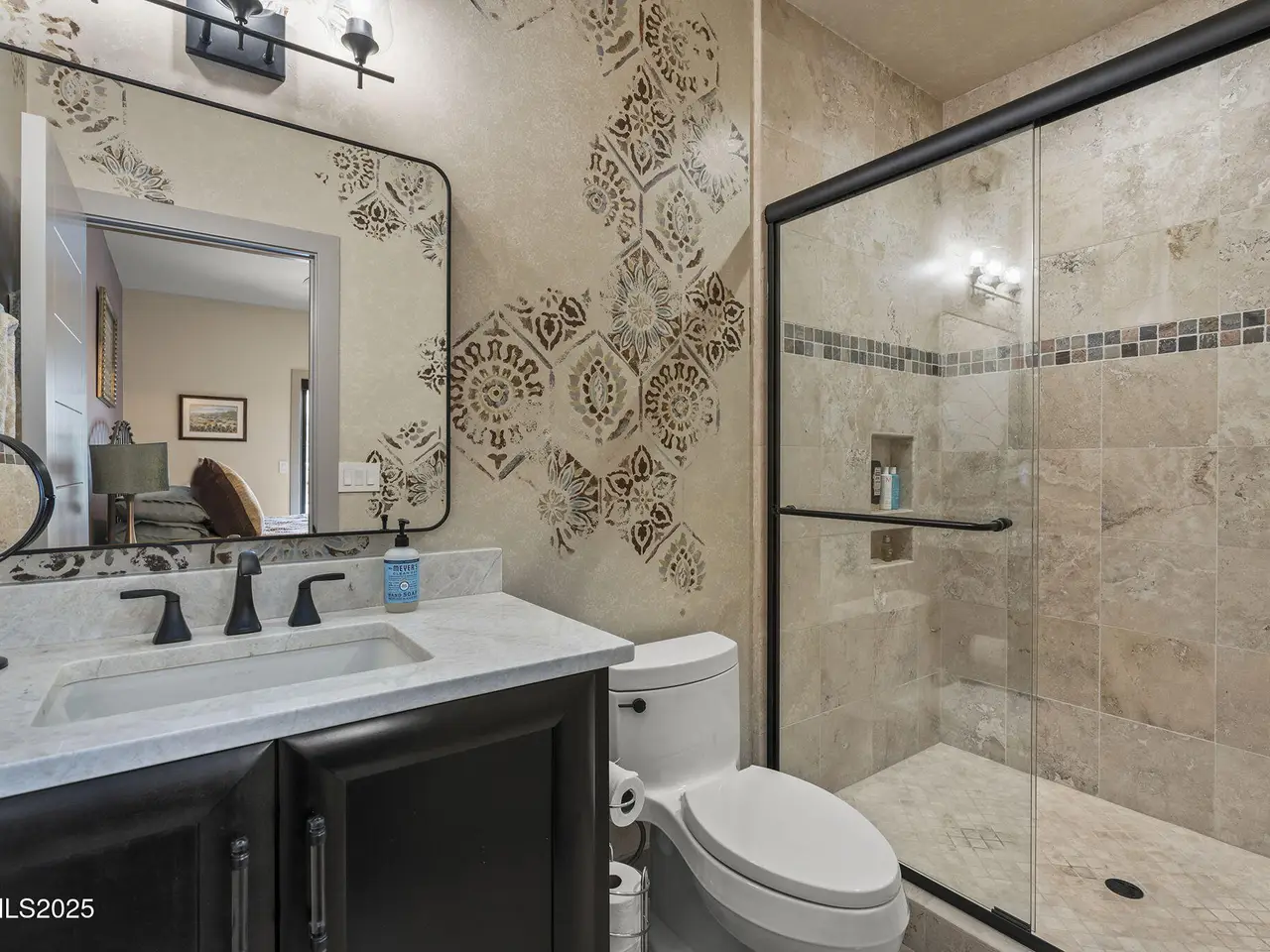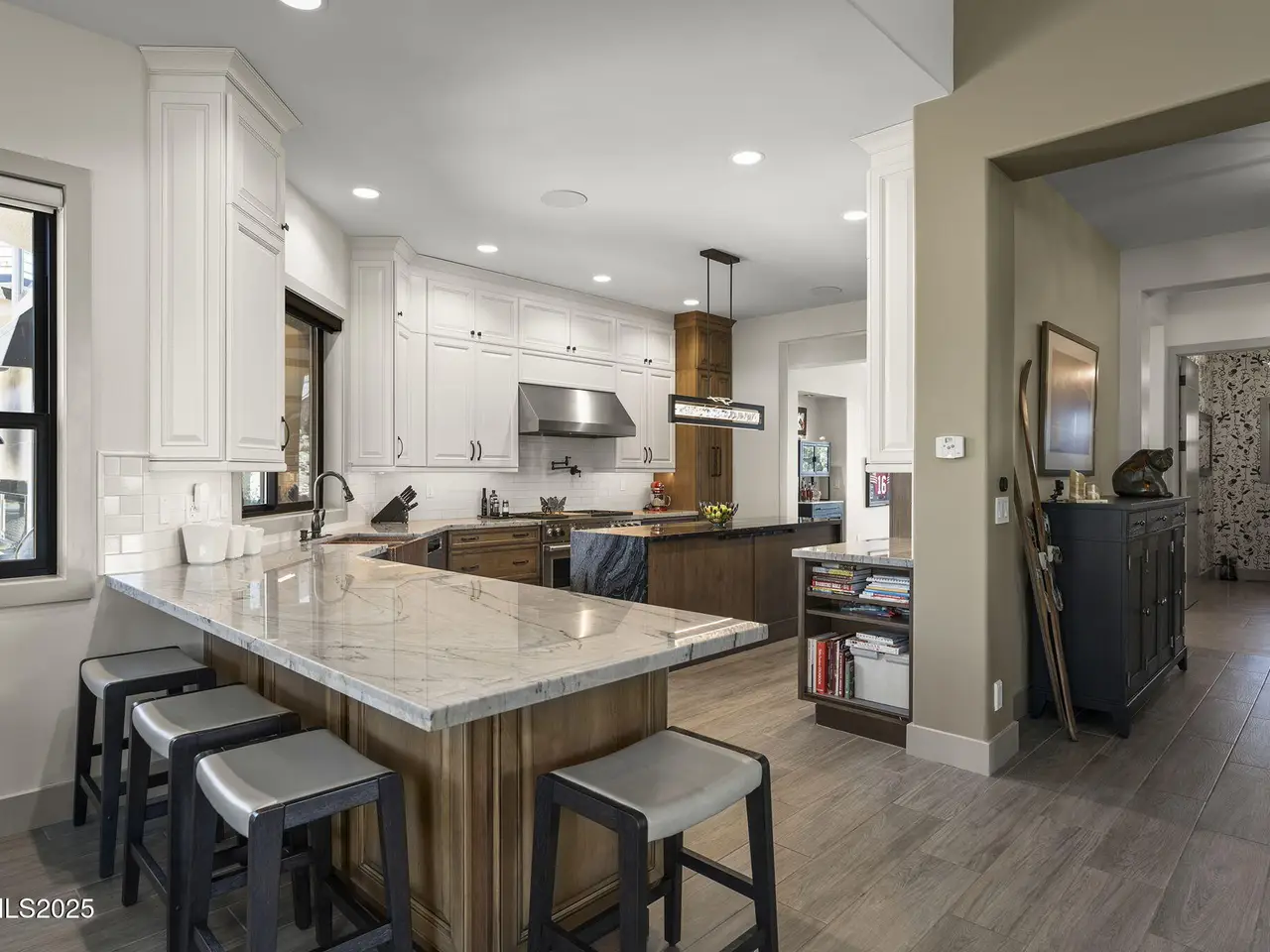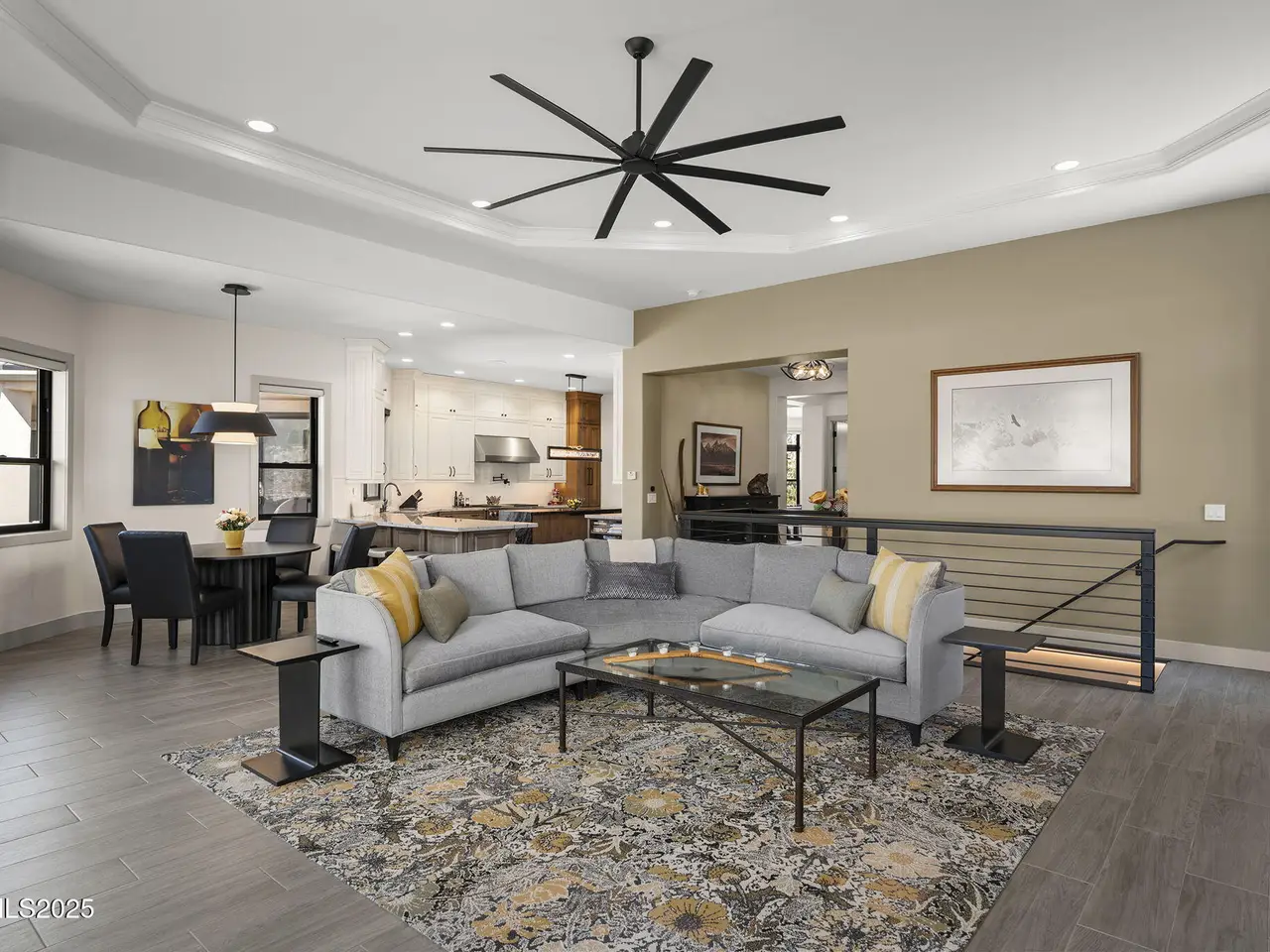 Step into 6177 North Featherstone, a residence reimagined from the ground up to embody the sophistication of design and the effortless grace of High Desert living. Nestled within the prestigious ArrowCreek community, this fully remodeled estate offers 5,586 square feet of inspired living on a full acre. With sweeping views across the Sierra Nevada and Mt. Rose mountains, lush golf fairways, and sparkling city lights, every angle of this home tells a story of elegance and connection to its surroundings. The owners began their remodel with purpose: to create a seamless flow, where form meets function and every detail enhances life, leisure, and entertaining. Walls were softened, pillars removed, and spaces reimagined to capture natural light and open sightlines. Modern finishes and thoughtful design balance grandeur with comfort. A finished basement and upstairs library added 312 square feet, expanding versatility without sacrificing intimacy. Arrival makes an unforgettable impression with a custom 9x6 steel pivot door by Modern Steel Doors of Arizona. Inside, a light-filled foyer leads to an expanded balcony, where sweeping golf course and city views set the stage for sunrise coffee or starlit evenings. At the heart of the home, the Dining Room has been elevated into a dramatic entertaining space with soaring two-story ceilings and a two-sided fireplace connecting indoors and outdoors. Andersen sliding doors open to patios and gardens, while striking Sonneman fixtures and art lighting create ambiance. Whether hosting holidays or intimate dinners, the space adapts with ease. The Main En Suite is a private retreat, complete with custom California Closets, cove lighting, and remote-controlled Hunter Douglas shades. The spa-inspired bath showcases a freestanding soaking tub beneath chandeliers, a dual-entry steam shower with rain head and sprayers, natural stone floors, shimmering glass tile, and custom cabinetry with quartz counters and lighted mirrors. The Great Room centers on a custom travertine fireplace with black quartz mantel, complemented by wood-grain tile floors, a Minka Aire fan, and integrated Sonos audio. The Kitchen and Nook feature a Wolf 48" range, Sub-Zero refrigerator, and a central island with seating. The Games Room delights with Hubbardton Forge lighting, speakers, and motorized shades. A dramatic staircase of black-stained oak and iron railings rises beneath a cascading Sonneman chandelier. Upstairs, the new Library offers custom bookcases, club seating, and a 12-foot Andersen glass wall opening to a balcony with panoramic views. Four additional en suite bedrooms provide privacy, storage, and character. Outdoors, multiple patios, a two-sided fireplace, and landscaped grounds enhanced with solar lighting create serene gathering spaces. Modern systems include central HVAC with three units, radiant heated floors, Tesla solar panels, Cat-6 wiring, Sonos audio, and a four-car garage with EV charger. This estate is more than a home—it is a lifestyle. From morning coffee on the balcony to wine in the library at dusk, from quiet family nights to grand celebrations, this residence harmonizes elegance, comfort, and versatility. Every space has been thoughtfully crafted, every view a reminder of Reno's beauty. This is a rare opportunity to own a fully realized vision of home, where luxury and ease coexist seamlessly.