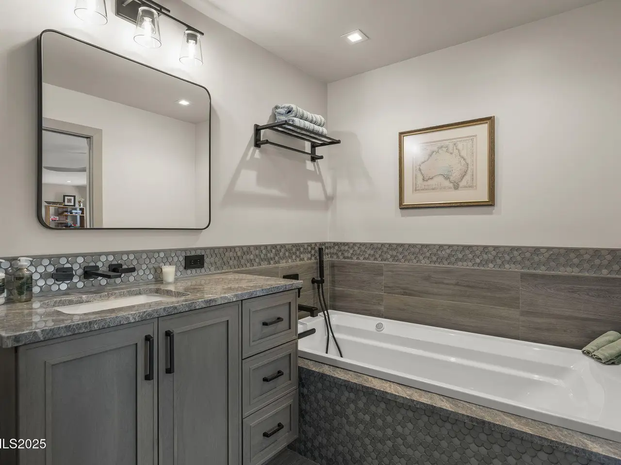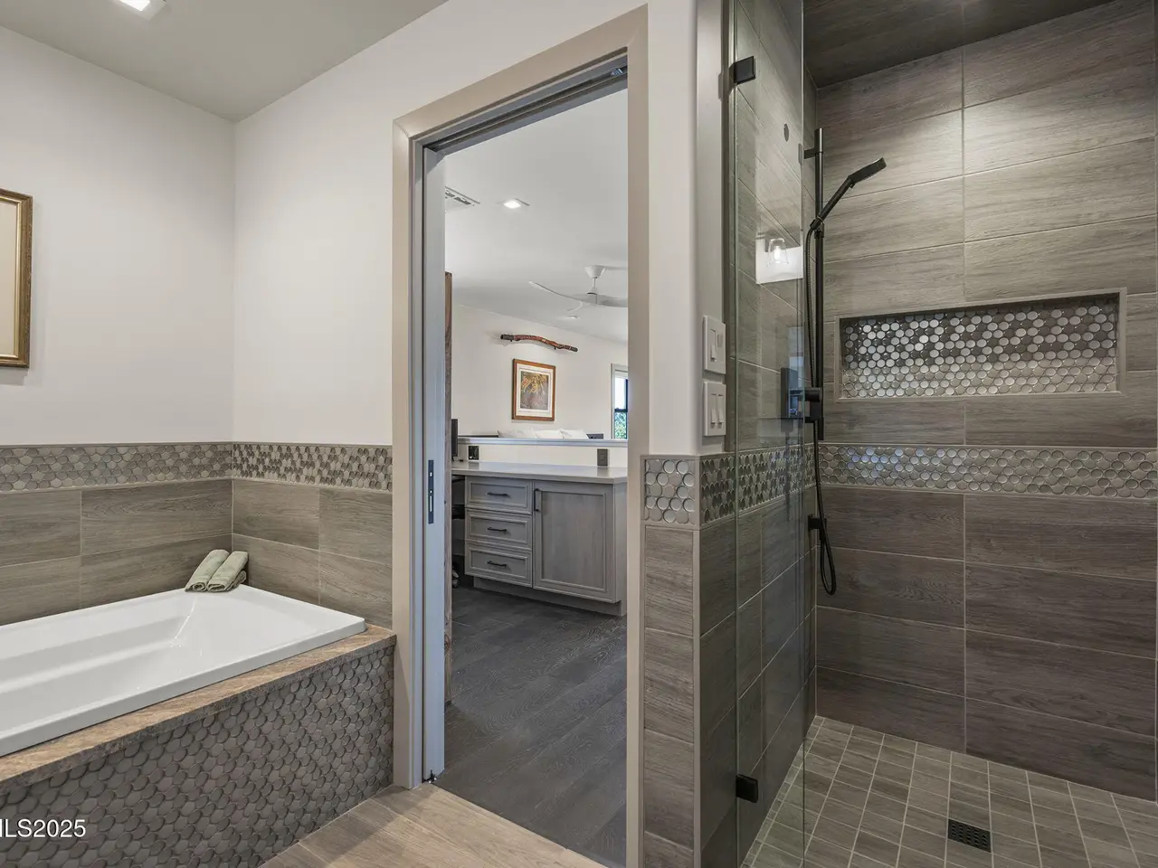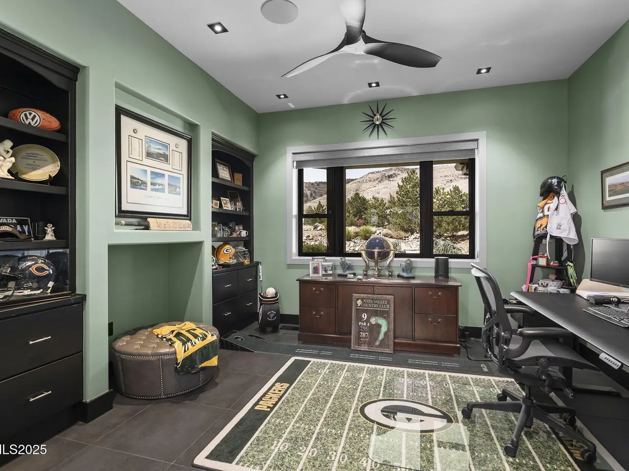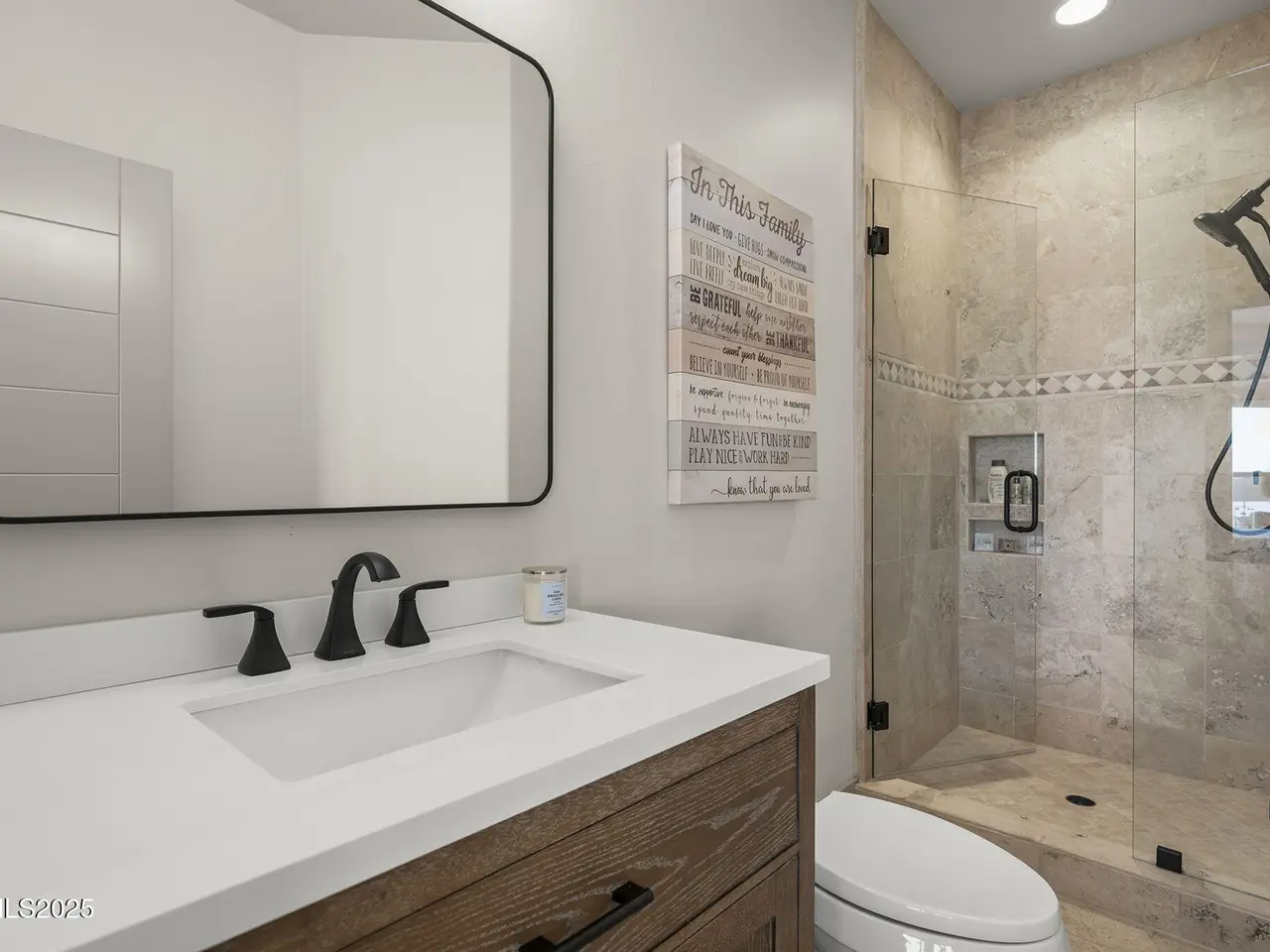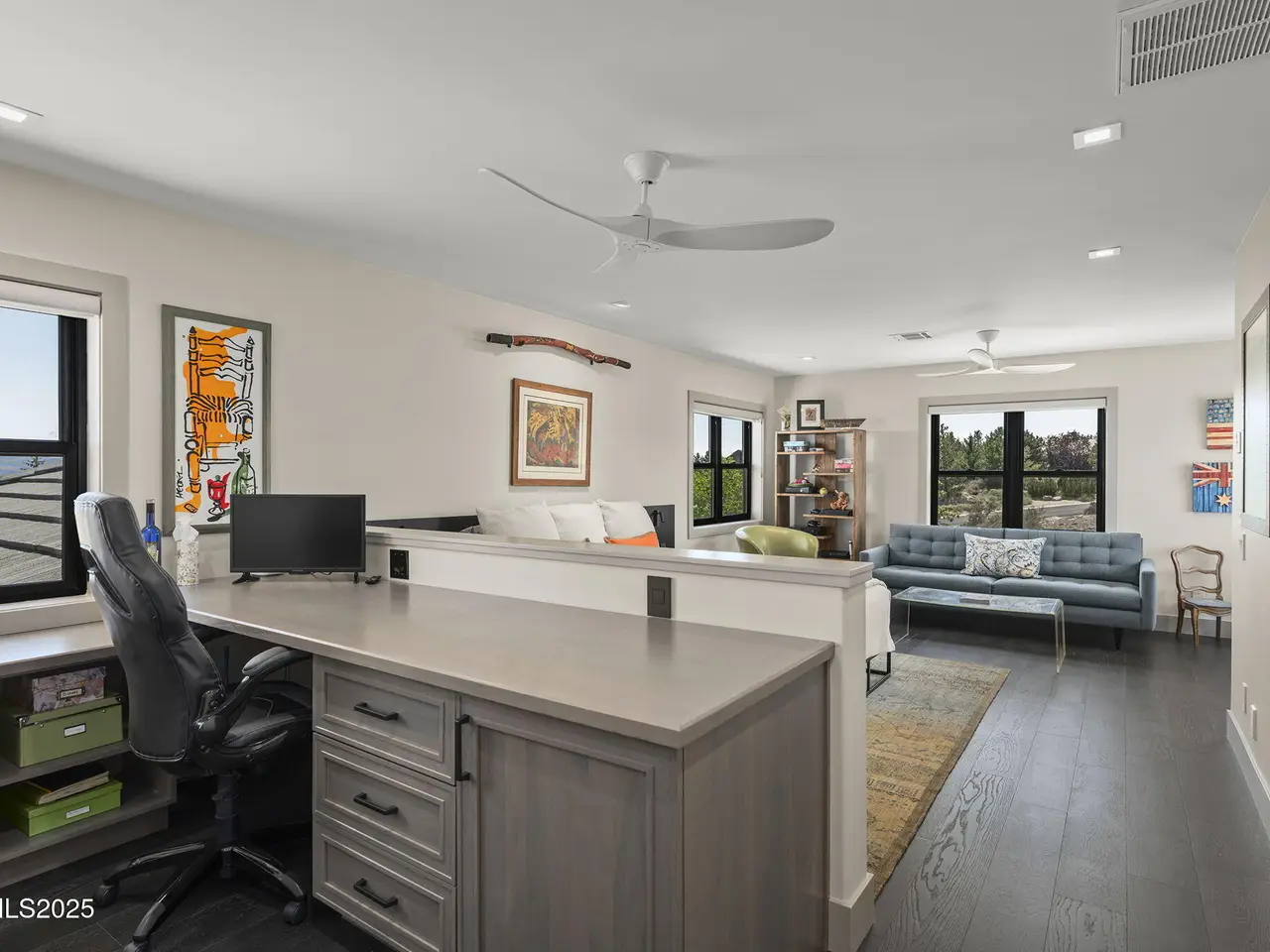 Step into 6177 North Featherstone, a residence reimagined from the ground up to embody the sophistication of design and the effortless grace of High Desert living. Nestled within the prestigious ArrowCreek community, this fully remodeled estate offers 5,586 square feet of inspired living on a full acre. With sweeping views across the Sierra Nevada and Mt. Rose mountains, lush golf fairways, and sparkling city lights, every angle of this home tells a story of elegance and connection to its surroundings. The owners began their remodel with purpose: to create a seamless flow, where form meets function and every detail enhances life, leisure, and entertaining. Walls were softened, pillars removed, and spaces reimagined to capture natural light and open sightlines. Modern finishes and thoughtful design balance grandeur with comfort. A finished basement and upstairs library added 312 square feet, expanding versatility without sacrificing intimacy. Arrival makes an unforgettable impression with a custom 9x6 steel pivot door by Modern Steel Doors of Arizona. Inside, a light-filled foyer leads to an expanded balcony, where sweeping golf course and city views set the stage for sunrise coffee or starlit evenings. At the heart of the home, the Dining Room has been elevated into a dramatic entertaining space with soaring two-story ceilings and a two-sided fireplace connecting indoors and outdoors. Andersen sliding doors open to patios and gardens, while striking Sonneman fixtures and art lighting create ambiance. Whether hosting holidays or intimate dinners, the space adapts with ease. The Main En Suite is a private retreat, complete with custom California Closets, cove lighting, and remote-controlled Hunter Douglas shades. The spa-inspired bath showcases a freestanding soaking tub beneath chandeliers, a dual-entry steam shower with rain head and sprayers, natural stone floors, shimmering glass tile, and custom cabinetry with quartz counters and lighted mirrors. The Great Room centers on a custom travertine fireplace with black quartz mantel, complemented by wood-grain tile floors, a Minka Aire fan, and integrated Sonos audio. The Kitchen and Nook feature a Wolf 48" range, Sub-Zero refrigerator, and a central island with seating. The Games Room delights with Hubbardton Forge lighting, speakers, and motorized shades. A dramatic staircase of black-stained oak and iron railings rises beneath a cascading Sonneman chandelier. Upstairs, the new Library offers custom bookcases, club seating, and a 12-foot Andersen glass wall opening to a balcony with panoramic views. Four additional en suite bedrooms provide privacy, storage, and character. Outdoors, multiple patios, a two-sided fireplace, and landscaped grounds enhanced with solar lighting create serene gathering spaces. Modern systems include central HVAC with three units, radiant heated floors, Tesla solar panels, Cat-6 wiring, Sonos audio, and a four-car garage with EV charger. This estate is more than a home—it is a lifestyle. From morning coffee on the balcony to wine in the library at dusk, from quiet family nights to grand celebrations, this residence harmonizes elegance, comfort, and versatility. Every space has been thoughtfully crafted, every view a reminder of Reno's beauty. This is a rare opportunity to own a fully realized vision of home, where luxury and ease coexist seamlessly.