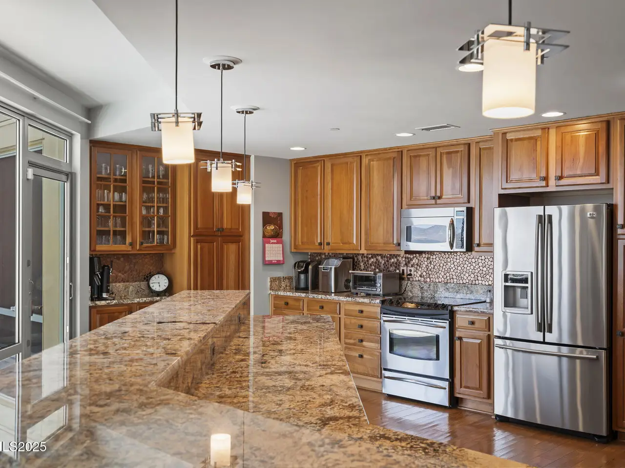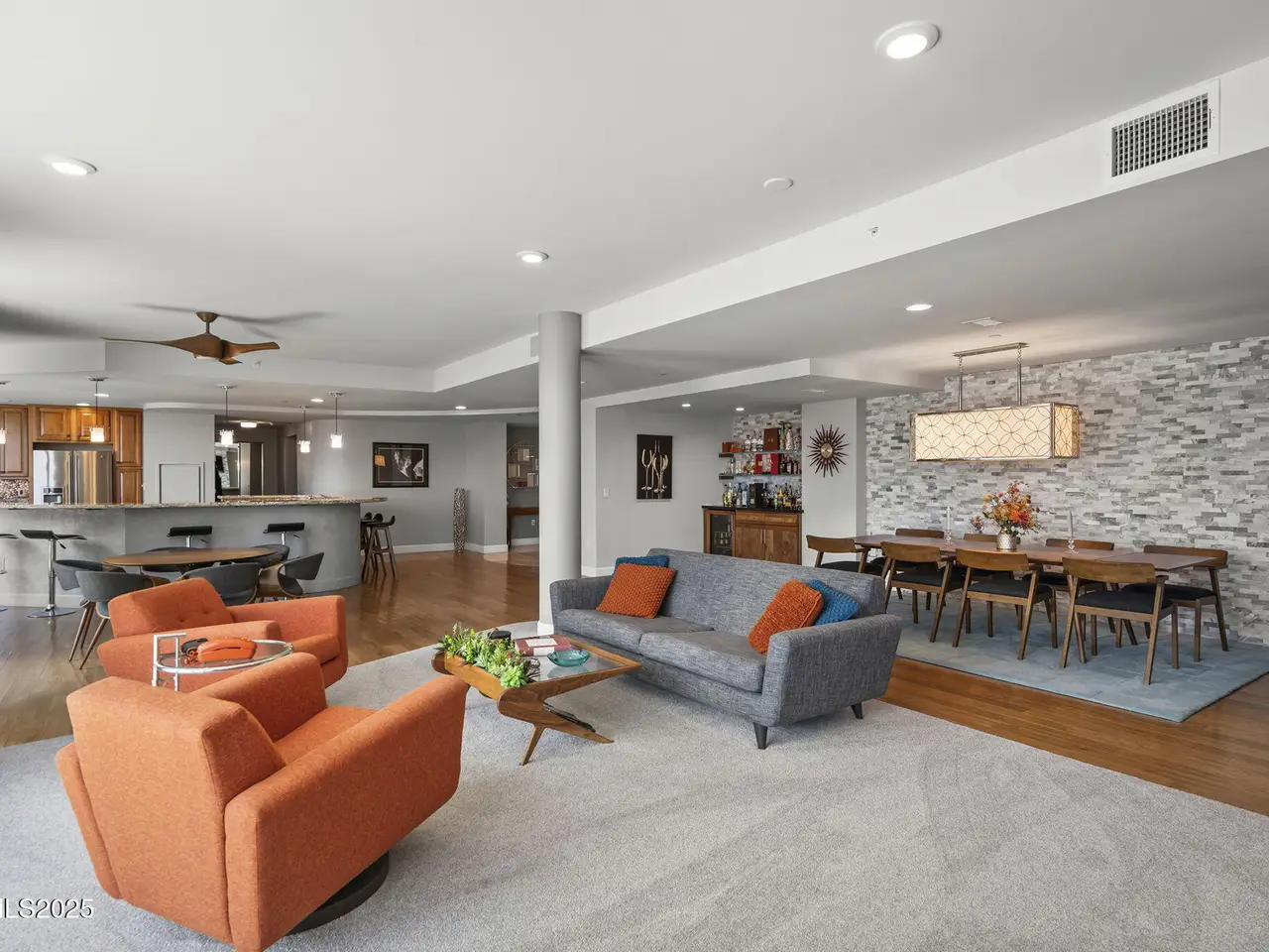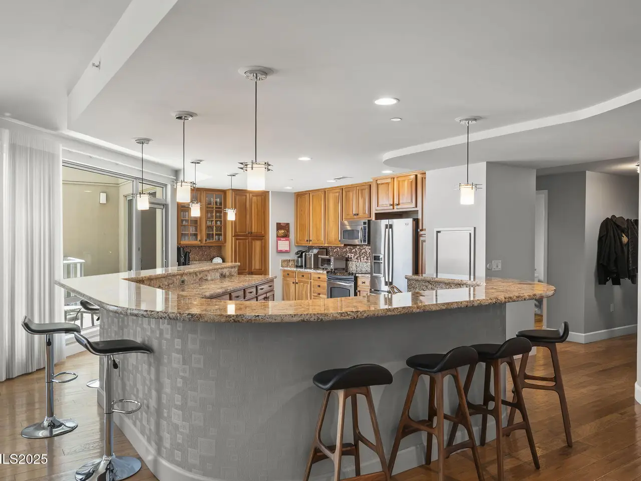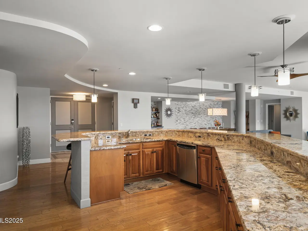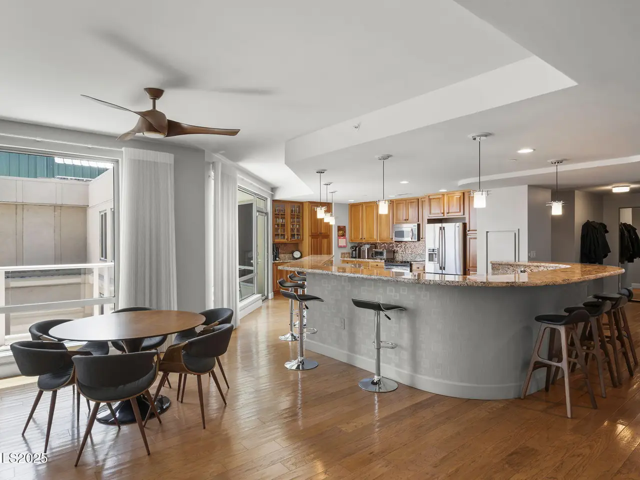 Live Above It All in Reno's "Global Headquarters" — The Palladio Penthouse. Experience the pinnacle of luxury urban living in this rare and breathtaking Penthouse at 50 N Sierra Street— in the heart of the city's vibrant downtown. One of only four exclusive penthouse residences in the prestigious Palladio, this 3-bedroom, 3.5-bath home is a masterclass in elegance, privacy, and elevated design. Step off your private express elevator—a luxury reserved for this unit—and into an expansive retreat where sophistication meets comfort. Hickory hardwood floors, polished granite surfaces, and exquisite stone finishes set the tone, while an upgraded fireplace and custom feature wall with built-in bar and uplighting create a perfect atmosphere for entertaining or relaxing in style. The sun-drenched great room is designed for gatherings large or small, anchored by a striking kitchen island bar that invites culinary creativity and connection. Extend the experience outdoors on the protected balcony spanning the full length of the unit, offering panoramic vistas of downtown Reno, the Sierra Nevada, and the flowing Truckee River. The primary suite is a serene escape with luxurious finishes, while the junior suite and additional bedroom offer flexibility for guests or home office needs. With three side-by-side parking spaces, ample storage, and a private storage unit, this home offers unmatched convenience. Located in the heart of Reno's walkable downtown, The Palladio places you steps from fine dining, art galleries, theaters, local parks, and cultural landmarks. Wake up to river views, walk to your favorite café, and end the day with a city skyline sunset—all from your new perch in Penthouse 15. This is more than a home. It's a statement. It's Reno redefined.