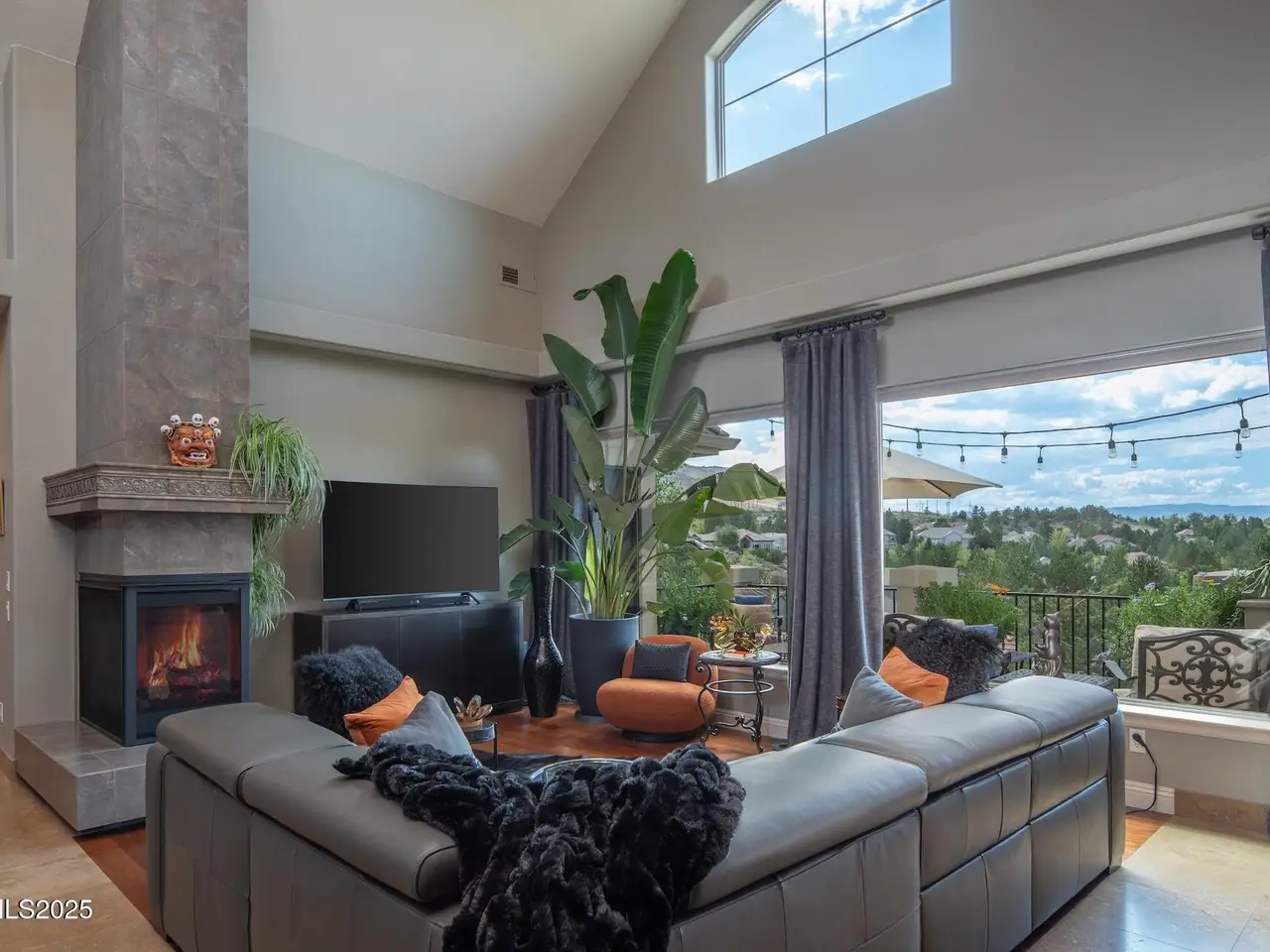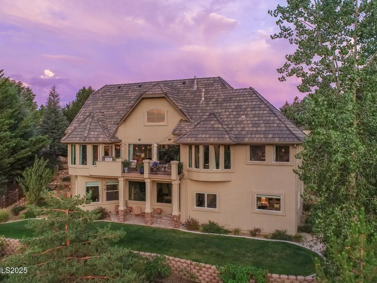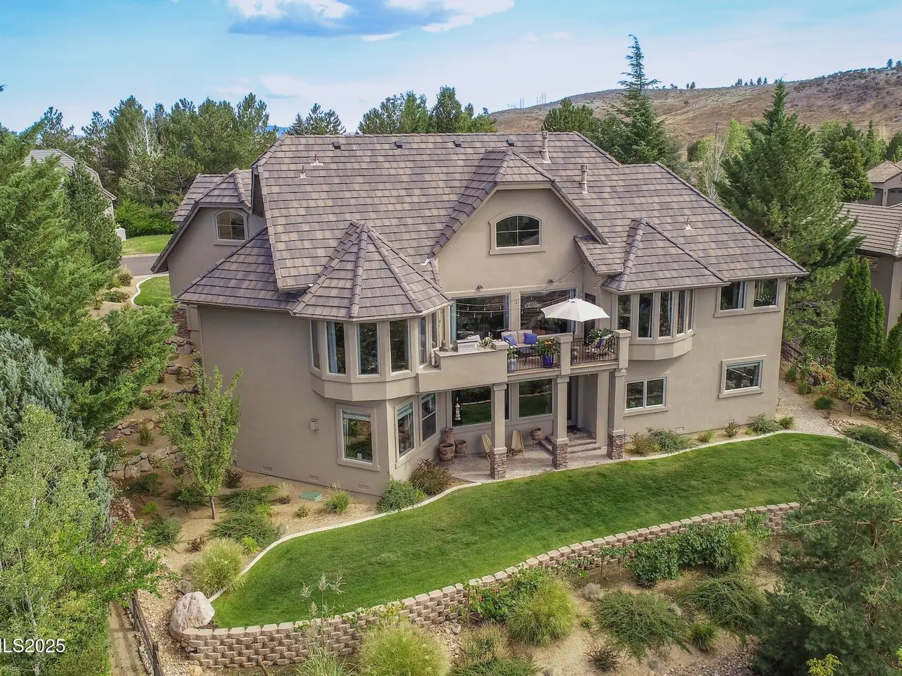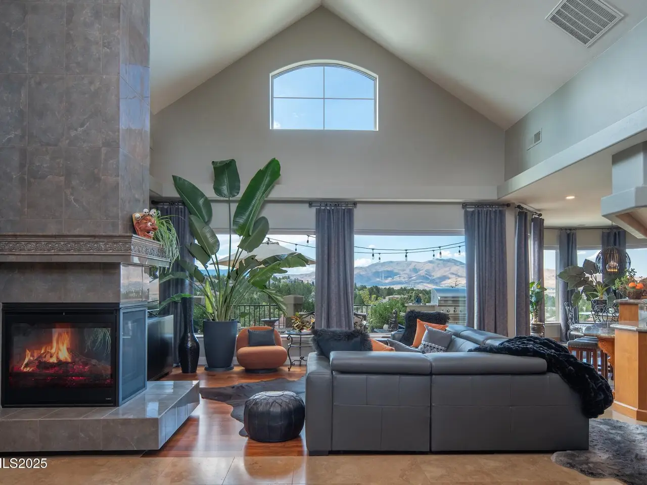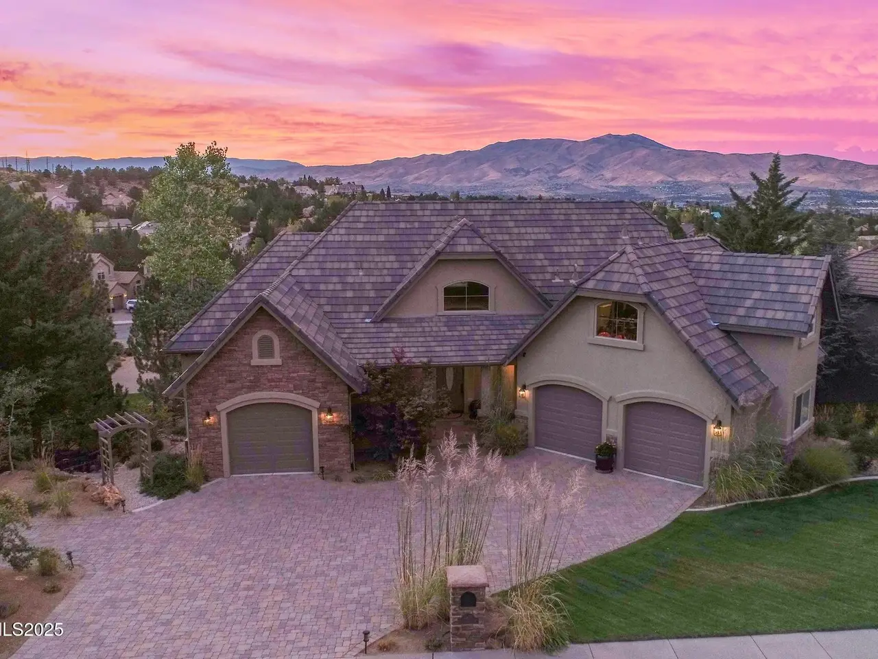 Perched above Reno behind the gates of Mountainshyre in the Caughlin Ranch community, 4905 Mountainshyre Road offers a lifestyle of elegance, security, and comfort. Completed in 2013, this 3904 sqft. custom home spans three levels and blends timeless architecture with modern conveniences, all while showcasing breathtaking views of the city skyline and surrounding mountains. You're instantly welcomed by the home's lush curb appeal, with its paver driveway that leads to the stone-accented exterior, fresh stucco finish, and quartzite steps, making a striking first impression. Inside, a travertine foyer welcomes you to soaring ceilings and windows that frame the panoramic views. The living room features a 20-foot vaulted ceiling, expansive windows, teak hardwood floors, and a dramatic three-sided gas fireplace. The dining room is defined by vaulted ceilings, faux columns, and an elegant chandelier. The open kitchen has slab granite counters, alder cabinetry, a six-burner Jenn-Air range, and paneled Jenn-Air refrigerator. A hexagonal breakfast nook offers unmatched morning views, while a large walk-in pantry with etched glass door provides ample storage. The first of two primary suites offers views from the private deck access, a stone fireplace, and beautiful travertine flooring. The spa-like bath features dual vanities, a soaking tub with mosaic surround, marble counters, and a custom-tiled shower. A large walk-in closet with alder built-ins leads to a reinforced safe room with keypad entry. The lower floor includes an entertainment room with recessed lighting, built in audio, and hardwood flooring with access to the outdoors. Down here, you'll find the second primary suite, currently being used as an office. It features hardwood flooring, blackout shades, and a sleek gas fireplace, and a warm wood paneled ceiling. The attached bath is just as luxurious as its upstairs counterpart and also features walk-in closets and second safe room. Three more downstairs bedrooms provide versatility, each with large closets for ample storage. They share a marble-appointed bathroom with alder cabinetry and walk-in shower. The top floor is dedicated to a home gym featuring commercial-grade flooring, mirrored walls, ceiling fans, and built-in audio. Step outside to a yard designed for year-round enjoyment. The expansive deck, accessed from the living room and primary suite, overlooks Reno's skyline and mountains. A built-in gas BBQ with granite counters makes it ideal for entertaining. The lower, covered patio provides a shaded outdoor retreat. Automatic sprinklers maintain the lush yard with apple, cherry, and plum trees, alongside the private vineyard with its 11 vines. The three oversized garages are finished with epoxy floors, built-in cabinets, and central vacuum outlets, and warm water hook ups for winter car washing. Behind its elegance, the home's advanced technical features include 3 Rheem HVAC units with individual zones, high-efficiency insulation, 75-gallon gas water heater plus 50-gallon electric tank with recirculating pump, hardwired Cat-6 internet and antenna system, 4 camera Lorex surveillance system with monitor, whole-house alarm and DrainVac central vacuum system. Much of this is tucked behind a 221 sqft utility room which is not included in the home's overall square footage. This estate represents a rare opportunity to own one of Reno's most distinctive properties, where craftsmanship, security, and beauty converge.