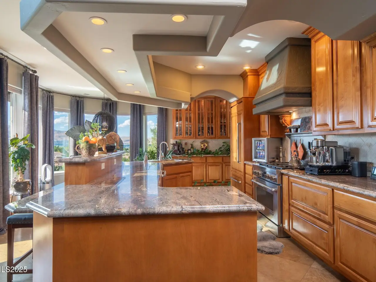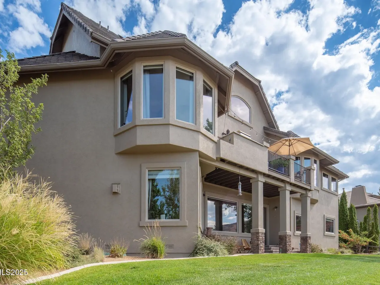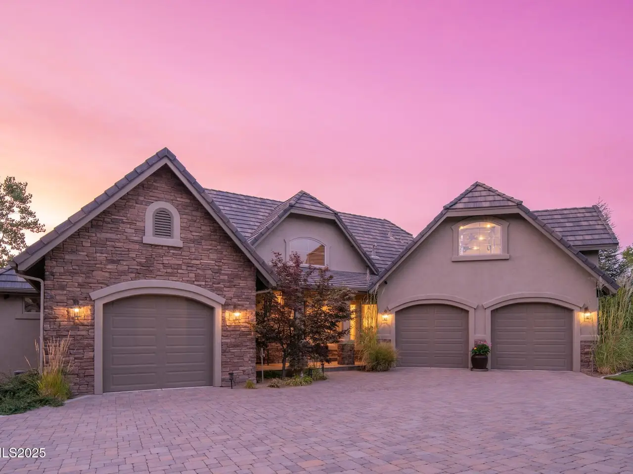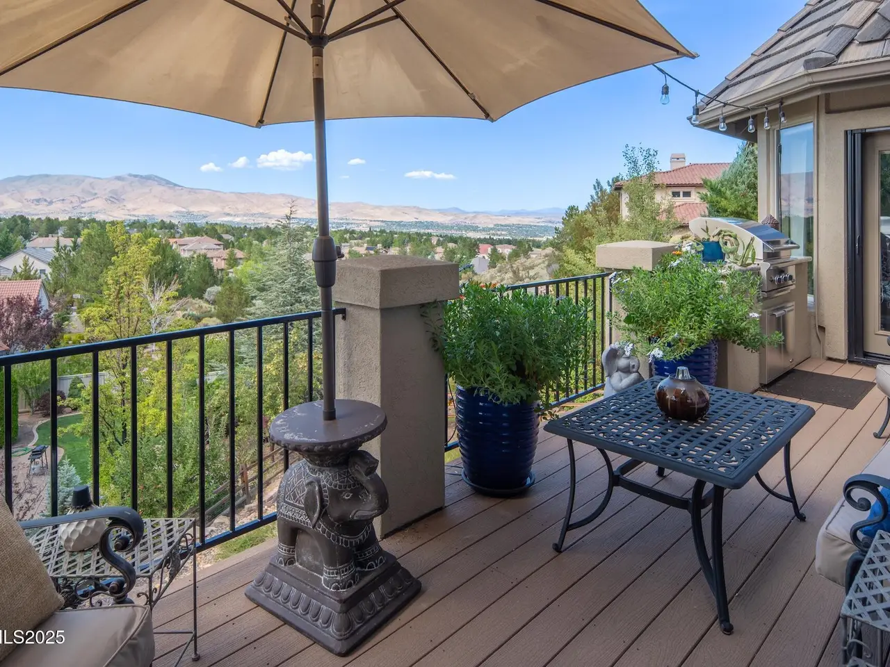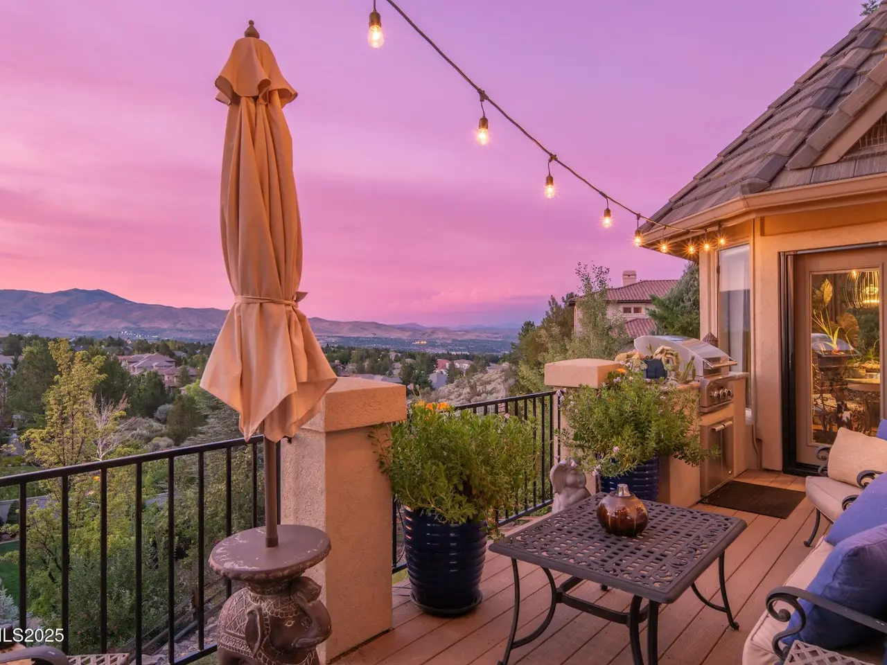 Perched above Reno behind the gates of Mountainshyre in the Caughlin Ranch community, 4905 Mountainshyre Road offers a lifestyle of elegance, security, and comfort. Completed in 2013, this 3904 sqft. custom home spans three levels and blends timeless architecture with modern conveniences, all while showcasing breathtaking views of the city skyline and surrounding mountains. You're instantly welcomed by the home's lush curb appeal, with its paver driveway that leads to the stone-accented exterior, fresh stucco finish, and quartzite steps, making a striking first impression. Inside, a travertine foyer welcomes you to soaring ceilings and windows that frame the panoramic views. The living room features a 20-foot vaulted ceiling, expansive windows, teak hardwood floors, and a dramatic three-sided gas fireplace. The dining room is defined by vaulted ceilings, faux columns, and an elegant chandelier. The open kitchen has slab granite counters, alder cabinetry, a six-burner Jenn-Air range, and paneled Jenn-Air refrigerator. A hexagonal breakfast nook offers unmatched morning views, while a large walk-in pantry with etched glass door provides ample storage. The first of two primary suites offers views from the private deck access, a stone fireplace, and beautiful travertine flooring. The spa-like bath features dual vanities, a soaking tub with mosaic surround, marble counters, and a custom-tiled shower. A large walk-in closet with alder built-ins leads to a reinforced safe room with keypad entry. The lower floor includes an entertainment room with recessed lighting, built in audio, and hardwood flooring with access to the outdoors. Down here, you'll find the second primary suite, currently being used as an office. It features hardwood flooring, blackout shades, and a sleek gas fireplace, and a warm wood paneled ceiling. The attached bath is just as luxurious as its upstairs counterpart and also features walk-in closets and second safe room. Three more downstairs bedrooms provide versatility, each with large closets for ample storage. They share a marble-appointed bathroom with alder cabinetry and walk-in shower. The top floor is dedicated to a home gym featuring commercial-grade flooring, mirrored walls, ceiling fans, and built-in audio. Step outside to a yard designed for year-round enjoyment. The expansive deck, accessed from the living room and primary suite, overlooks Reno's skyline and mountains. A built-in gas BBQ with granite counters makes it ideal for entertaining. The lower, covered patio provides a shaded outdoor retreat. Automatic sprinklers maintain the lush yard with apple, cherry, and plum trees, alongside the private vineyard with its 11 vines. The three oversized garages are finished with epoxy floors, built-in cabinets, and central vacuum outlets, and warm water hook ups for winter car washing. Behind its elegance, the home's advanced technical features include 3 Rheem HVAC units with individual zones, high-efficiency insulation, 75-gallon gas water heater plus 50-gallon electric tank with recirculating pump, hardwired Cat-6 internet and antenna system, 4 camera Lorex surveillance system with monitor, whole-house alarm and DrainVac central vacuum system. Much of this is tucked behind a 221 sqft utility room which is not included in the home's overall square footage. This estate represents a rare opportunity to own one of Reno's most distinctive properties, where craftsmanship, security, and beauty converge.