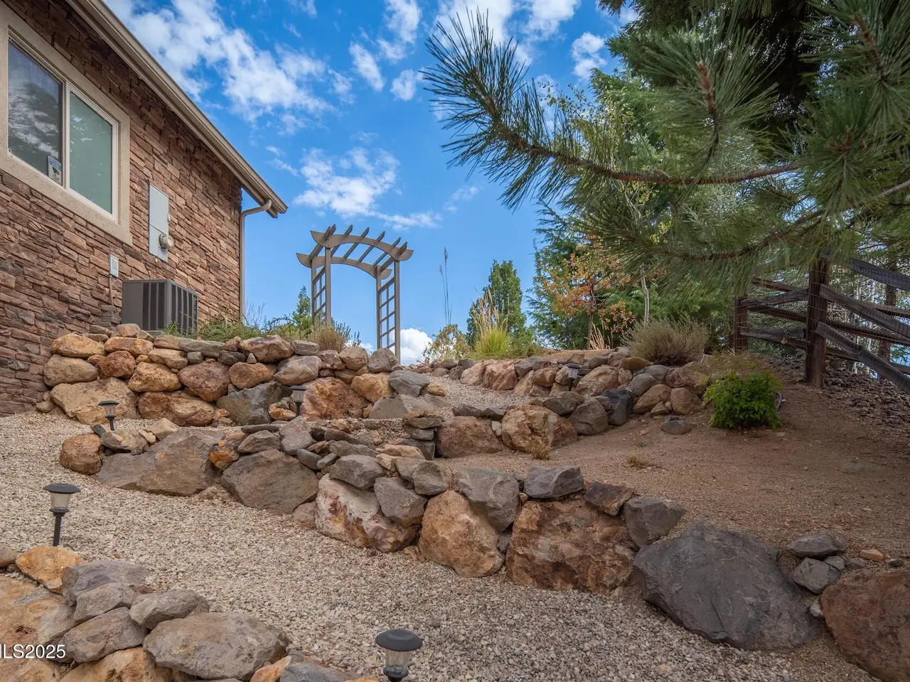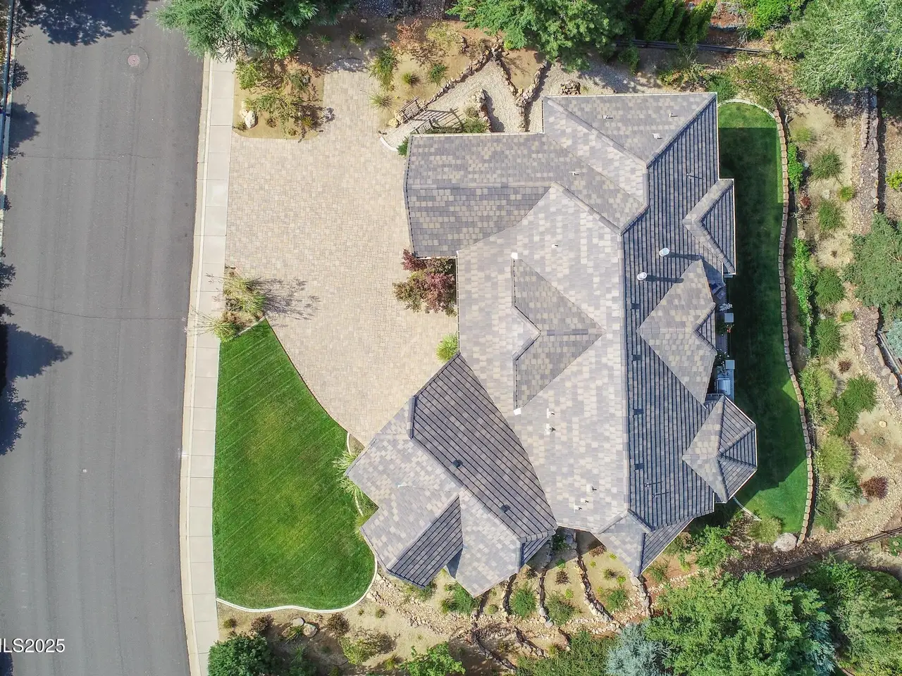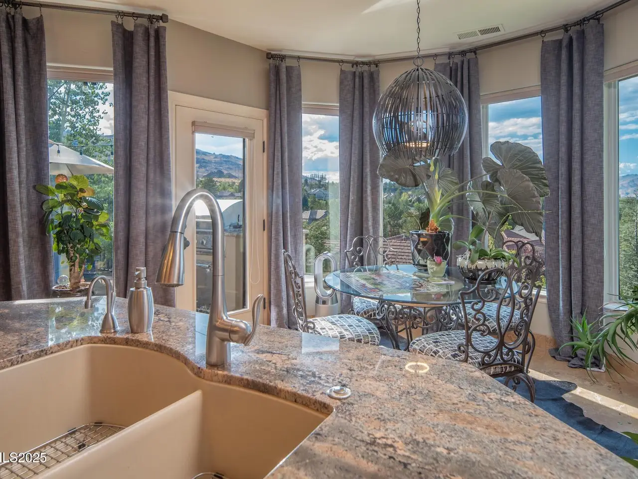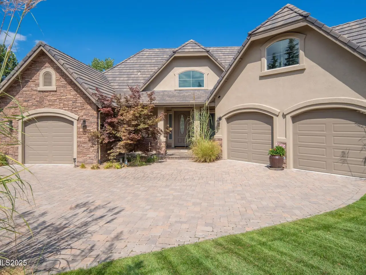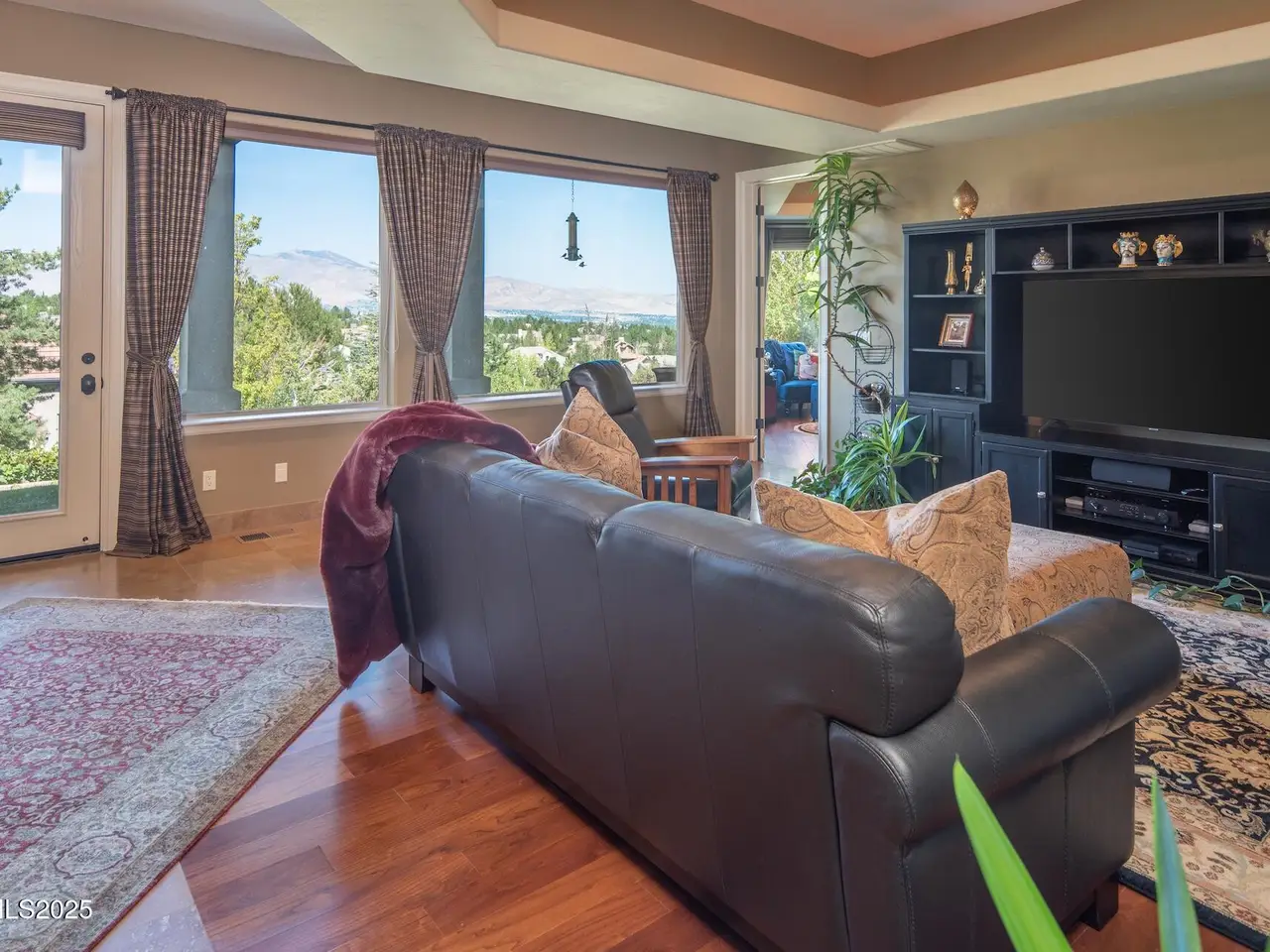 Perched above Reno behind the gates of Mountainshyre in the Caughlin Ranch community, 4905 Mountainshyre Road offers a lifestyle of elegance, security, and comfort. Completed in 2013, this 3904 sqft. custom home spans three levels and blends timeless architecture with modern conveniences, all while showcasing breathtaking views of the city skyline and surrounding mountains. You're instantly welcomed by the home's lush curb appeal, with its paver driveway that leads to the stone-accented exterior, fresh stucco finish, and quartzite steps, making a striking first impression. Inside, a travertine foyer welcomes you to soaring ceilings and windows that frame the panoramic views. The living room features a 20-foot vaulted ceiling, expansive windows, teak hardwood floors, and a dramatic three-sided gas fireplace. The dining room is defined by vaulted ceilings, faux columns, and an elegant chandelier. The open kitchen has slab granite counters, alder cabinetry, a six-burner Jenn-Air range, and paneled Jenn-Air refrigerator. A hexagonal breakfast nook offers unmatched morning views, while a large walk-in pantry with etched glass door provides ample storage. The first of two primary suites offers views from the private deck access, a stone fireplace, and beautiful travertine flooring. The spa-like bath features dual vanities, a soaking tub with mosaic surround, marble counters, and a custom-tiled shower. A large walk-in closet with alder built-ins leads to a reinforced safe room with keypad entry. The lower floor includes an entertainment room with recessed lighting, built in audio, and hardwood flooring with access to the outdoors. Down here, you'll find the second primary suite, currently being used as an office. It features hardwood flooring, blackout shades, and a sleek gas fireplace, and a warm wood paneled ceiling. The attached bath is just as luxurious as its upstairs counterpart and also features walk-in closets and second safe room. Three more downstairs bedrooms provide versatility, each with large closets for ample storage. They share a marble-appointed bathroom with alder cabinetry and walk-in shower. The top floor is dedicated to a home gym featuring commercial-grade flooring, mirrored walls, ceiling fans, and built-in audio. Step outside to a yard designed for year-round enjoyment. The expansive deck, accessed from the living room and primary suite, overlooks Reno's skyline and mountains. A built-in gas BBQ with granite counters makes it ideal for entertaining. The lower, covered patio provides a shaded outdoor retreat. Automatic sprinklers maintain the lush yard with apple, cherry, and plum trees, alongside the private vineyard with its 11 vines. The three oversized garages are finished with epoxy floors, built-in cabinets, and central vacuum outlets, and warm water hook ups for winter car washing. Behind its elegance, the home's advanced technical features include 3 Rheem HVAC units with individual zones, high-efficiency insulation, 75-gallon gas water heater plus 50-gallon electric tank with recirculating pump, hardwired Cat-6 internet and antenna system, 4 camera Lorex surveillance system with monitor, whole-house alarm and DrainVac central vacuum system. Much of this is tucked behind a 221 sqft utility room which is not included in the home's overall square footage. This estate represents a rare opportunity to own one of Reno's most distinctive properties, where craftsmanship, security, and beauty converge.