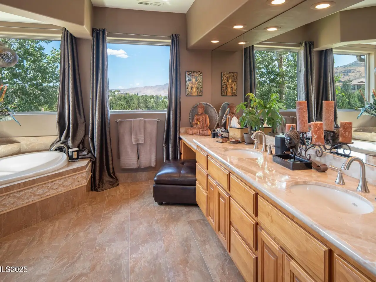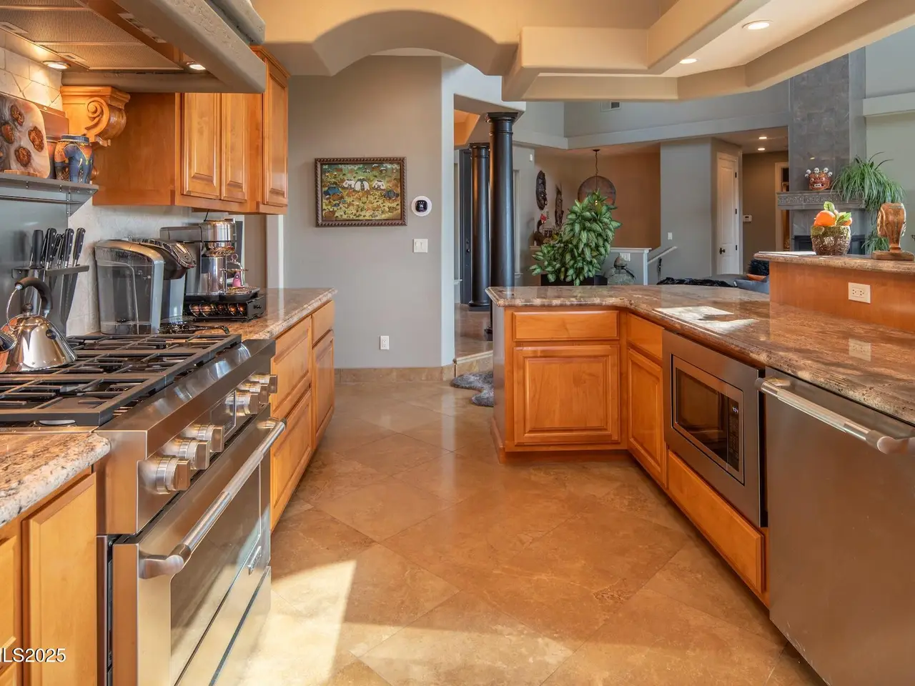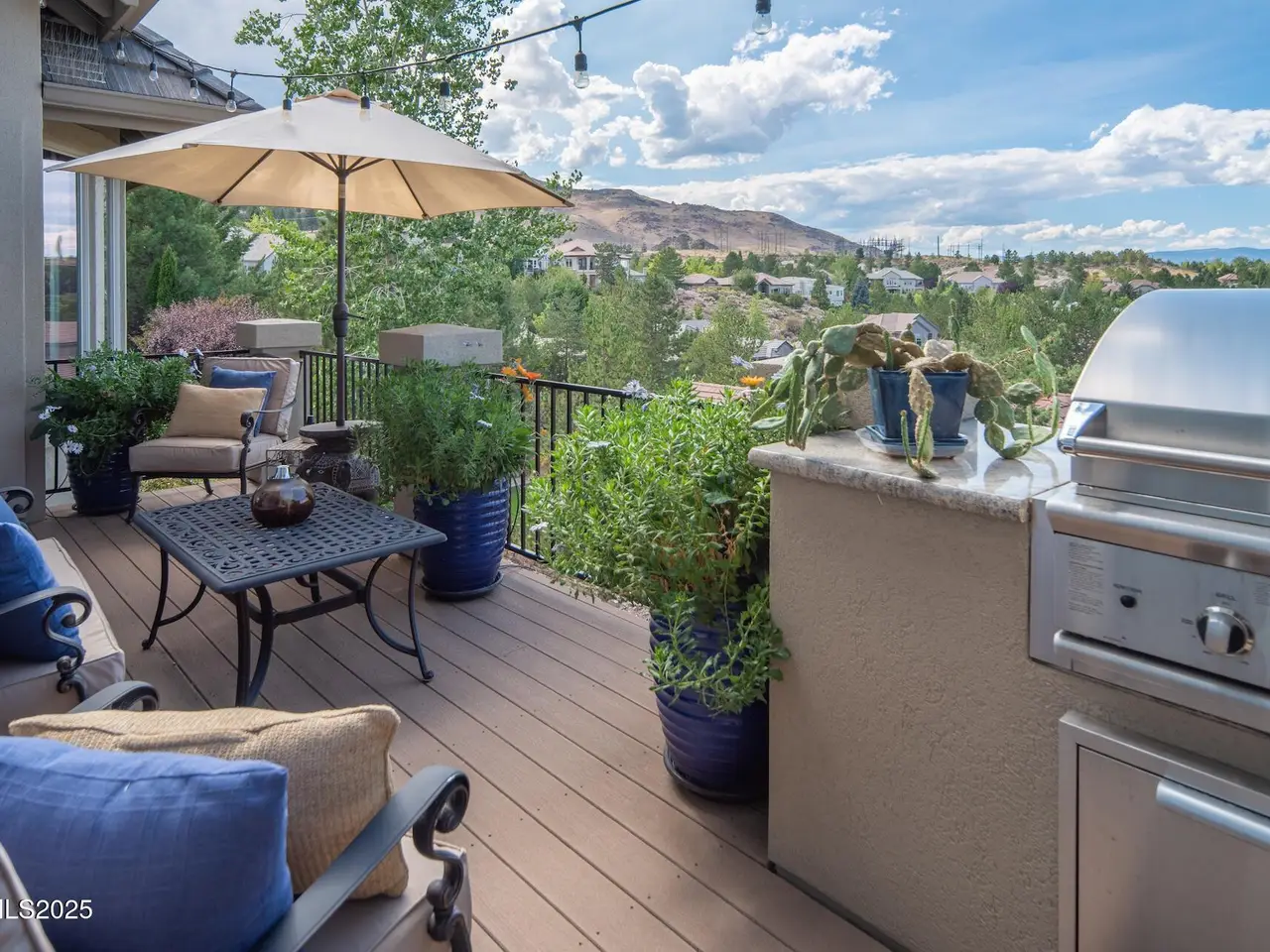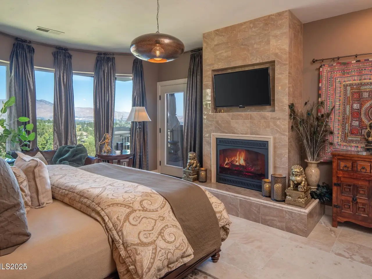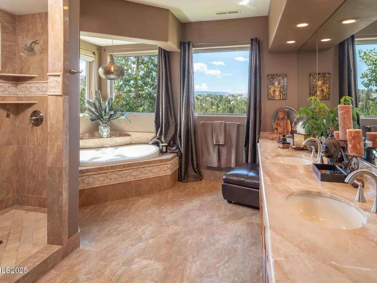 Perched above Reno behind the gates of Mountainshyre in the Caughlin Ranch community, 4905 Mountainshyre Road offers a lifestyle of elegance, security, and comfort. Completed in 2013, this 3904 sqft. custom home spans three levels and blends timeless architecture with modern conveniences, all while showcasing breathtaking views of the city skyline and surrounding mountains. You're instantly welcomed by the home's lush curb appeal, with its paver driveway that leads to the stone-accented exterior, fresh stucco finish, and quartzite steps, making a striking first impression. Inside, a travertine foyer welcomes you to soaring ceilings and windows that frame the panoramic views. The living room features a 20-foot vaulted ceiling, expansive windows, teak hardwood floors, and a dramatic three-sided gas fireplace. The dining room is defined by vaulted ceilings, faux columns, and an elegant chandelier. The open kitchen has slab granite counters, alder cabinetry, a six-burner Jenn-Air range, and paneled Jenn-Air refrigerator. A hexagonal breakfast nook offers unmatched morning views, while a large walk-in pantry with etched glass door provides ample storage. The first of two primary suites offers views from the private deck access, a stone fireplace, and beautiful travertine flooring. The spa-like bath features dual vanities, a soaking tub with mosaic surround, marble counters, and a custom-tiled shower. A large walk-in closet with alder built-ins leads to a reinforced safe room with keypad entry. The lower floor includes an entertainment room with recessed lighting, built in audio, and hardwood flooring with access to the outdoors. Down here, you'll find the second primary suite, currently being used as an office. It features hardwood flooring, blackout shades, and a sleek gas fireplace, and a warm wood paneled ceiling. The attached bath is just as luxurious as its upstairs counterpart and also features walk-in closets and second safe room. Three more downstairs bedrooms provide versatility, each with large closets for ample storage. They share a marble-appointed bathroom with alder cabinetry and walk-in shower. The top floor is dedicated to a home gym featuring commercial-grade flooring, mirrored walls, ceiling fans, and built-in audio. Step outside to a yard designed for year-round enjoyment. The expansive deck, accessed from the living room and primary suite, overlooks Reno's skyline and mountains. A built-in gas BBQ with granite counters makes it ideal for entertaining. The lower, covered patio provides a shaded outdoor retreat. Automatic sprinklers maintain the lush yard with apple, cherry, and plum trees, alongside the private vineyard with its 11 vines. The three oversized garages are finished with epoxy floors, built-in cabinets, and central vacuum outlets, and warm water hook ups for winter car washing. Behind its elegance, the home's advanced technical features include 3 Rheem HVAC units with individual zones, high-efficiency insulation, 75-gallon gas water heater plus 50-gallon electric tank with recirculating pump, hardwired Cat-6 internet and antenna system, 4 camera Lorex surveillance system with monitor, whole-house alarm and DrainVac central vacuum system. Much of this is tucked behind a 221 sqft utility room which is not included in the home's overall square footage. This estate represents a rare opportunity to own one of Reno's most distinctive properties, where craftsmanship, security, and beauty converge.