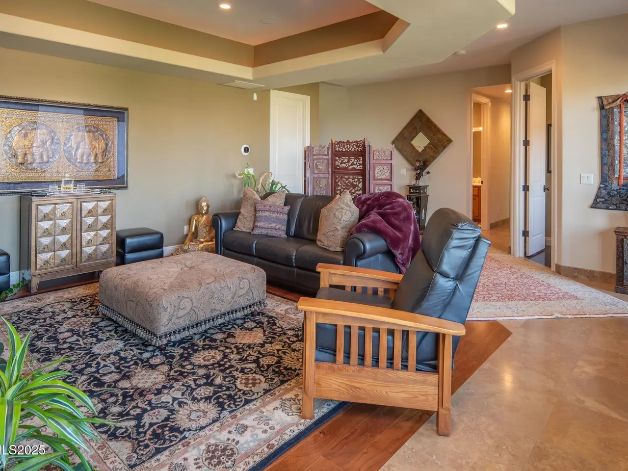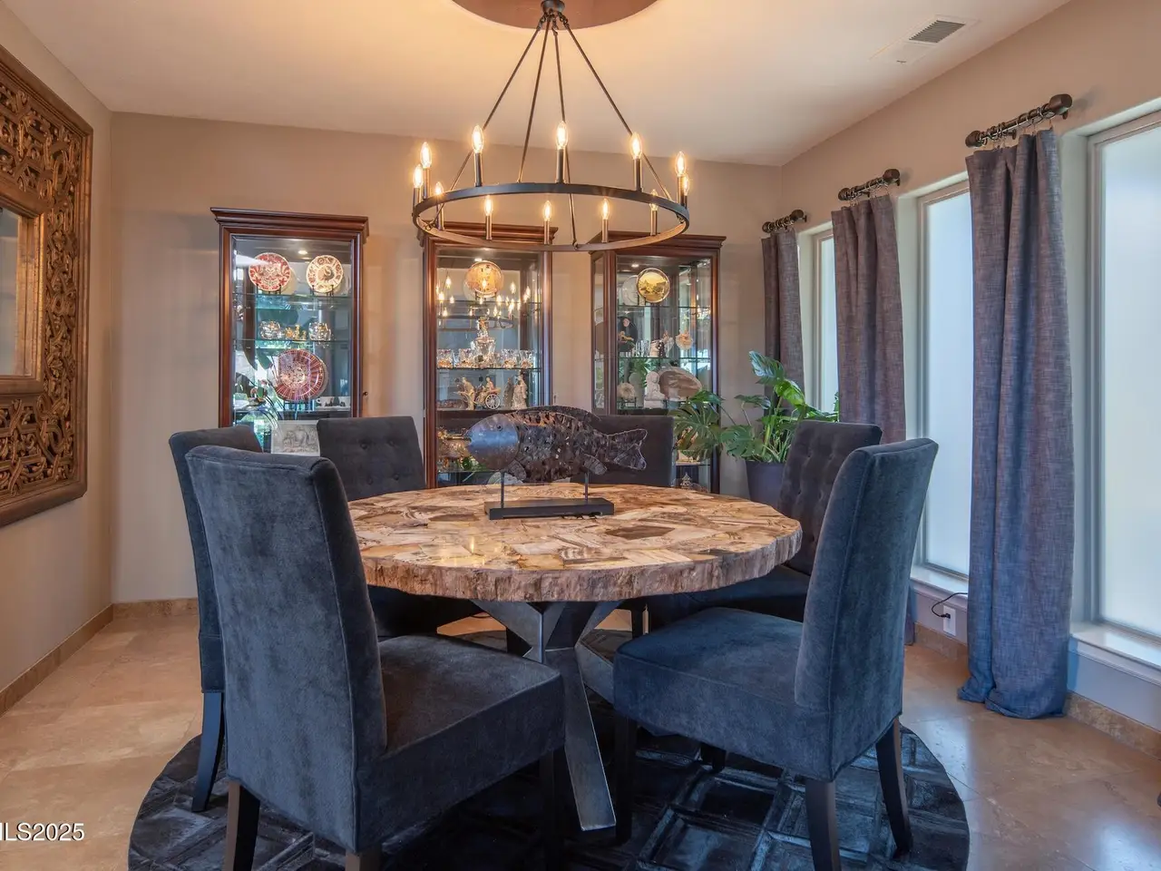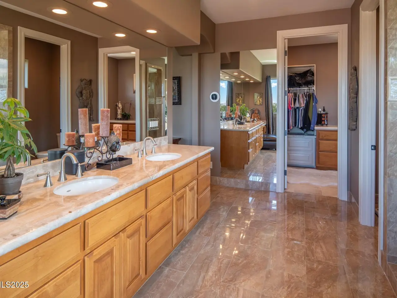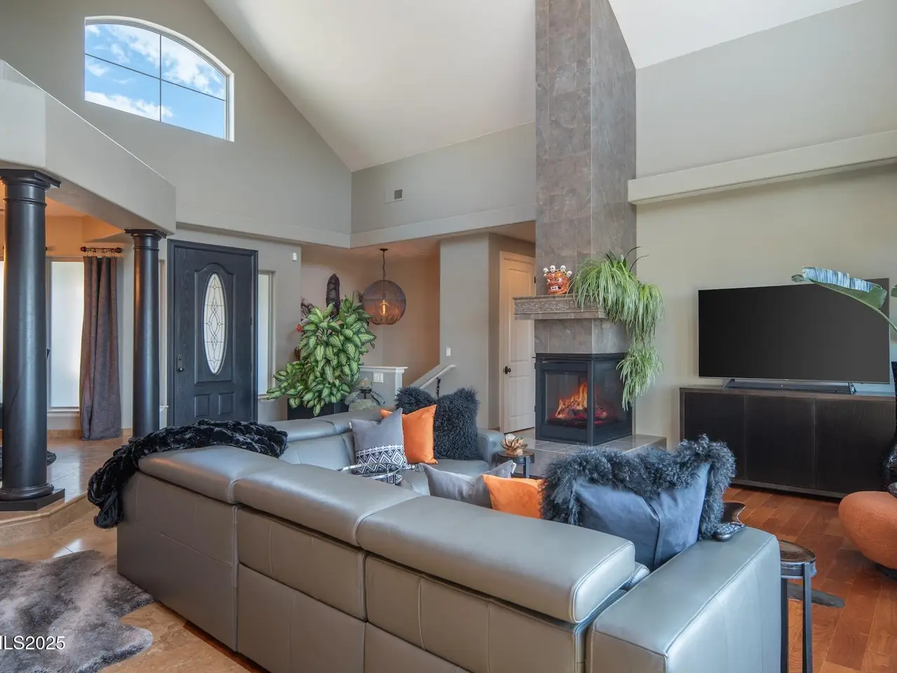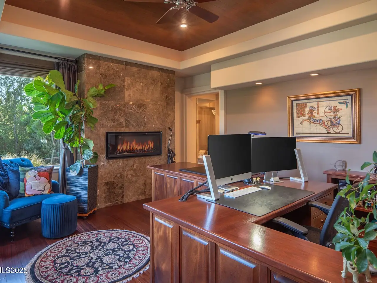 Perched above Reno behind the gates of Mountainshyre in the Caughlin Ranch community, 4905 Mountainshyre Road offers a lifestyle of elegance, security, and comfort. Completed in 2013, this 3904 sqft. custom home spans three levels and blends timeless architecture with modern conveniences, all while showcasing breathtaking views of the city skyline and surrounding mountains. You're instantly welcomed by the home's lush curb appeal, with its paver driveway that leads to the stone-accented exterior, fresh stucco finish, and quartzite steps, making a striking first impression. Inside, a travertine foyer welcomes you to soaring ceilings and windows that frame the panoramic views. The living room features a 20-foot vaulted ceiling, expansive windows, teak hardwood floors, and a dramatic three-sided gas fireplace. The dining room is defined by vaulted ceilings, faux columns, and an elegant chandelier. The open kitchen has slab granite counters, alder cabinetry, a six-burner Jenn-Air range, and paneled Jenn-Air refrigerator. A hexagonal breakfast nook offers unmatched morning views, while a large walk-in pantry with etched glass door provides ample storage. The first of two primary suites offers views from the private deck access, a stone fireplace, and beautiful travertine flooring. The spa-like bath features dual vanities, a soaking tub with mosaic surround, marble counters, and a custom-tiled shower. A large walk-in closet with alder built-ins leads to a reinforced safe room with keypad entry. The lower floor includes an entertainment room with recessed lighting, built in audio, and hardwood flooring with access to the outdoors. Down here, you'll find the second primary suite, currently being used as an office. It features hardwood flooring, blackout shades, and a sleek gas fireplace, and a warm wood paneled ceiling. The attached bath is just as luxurious as its upstairs counterpart and also features walk-in closets and second safe room. Three more downstairs bedrooms provide versatility, each with large closets for ample storage. They share a marble-appointed bathroom with alder cabinetry and walk-in shower. The top floor is dedicated to a home gym featuring commercial-grade flooring, mirrored walls, ceiling fans, and built-in audio. Step outside to a yard designed for year-round enjoyment. The expansive deck, accessed from the living room and primary suite, overlooks Reno's skyline and mountains. A built-in gas BBQ with granite counters makes it ideal for entertaining. The lower, covered patio provides a shaded outdoor retreat. Automatic sprinklers maintain the lush yard with apple, cherry, and plum trees, alongside the private vineyard with its 11 vines. The three oversized garages are finished with epoxy floors, built-in cabinets, and central vacuum outlets, and warm water hook ups for winter car washing. Behind its elegance, the home's advanced technical features include 3 Rheem HVAC units with individual zones, high-efficiency insulation, 75-gallon gas water heater plus 50-gallon electric tank with recirculating pump, hardwired Cat-6 internet and antenna system, 4 camera Lorex surveillance system with monitor, whole-house alarm and DrainVac central vacuum system. Much of this is tucked behind a 221 sqft utility room which is not included in the home's overall square footage. This estate represents a rare opportunity to own one of Reno's most distinctive properties, where craftsmanship, security, and beauty converge.