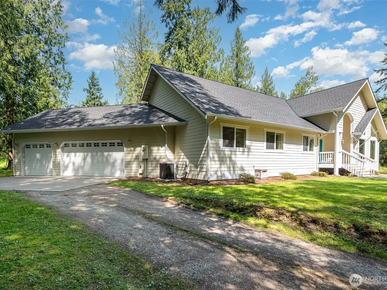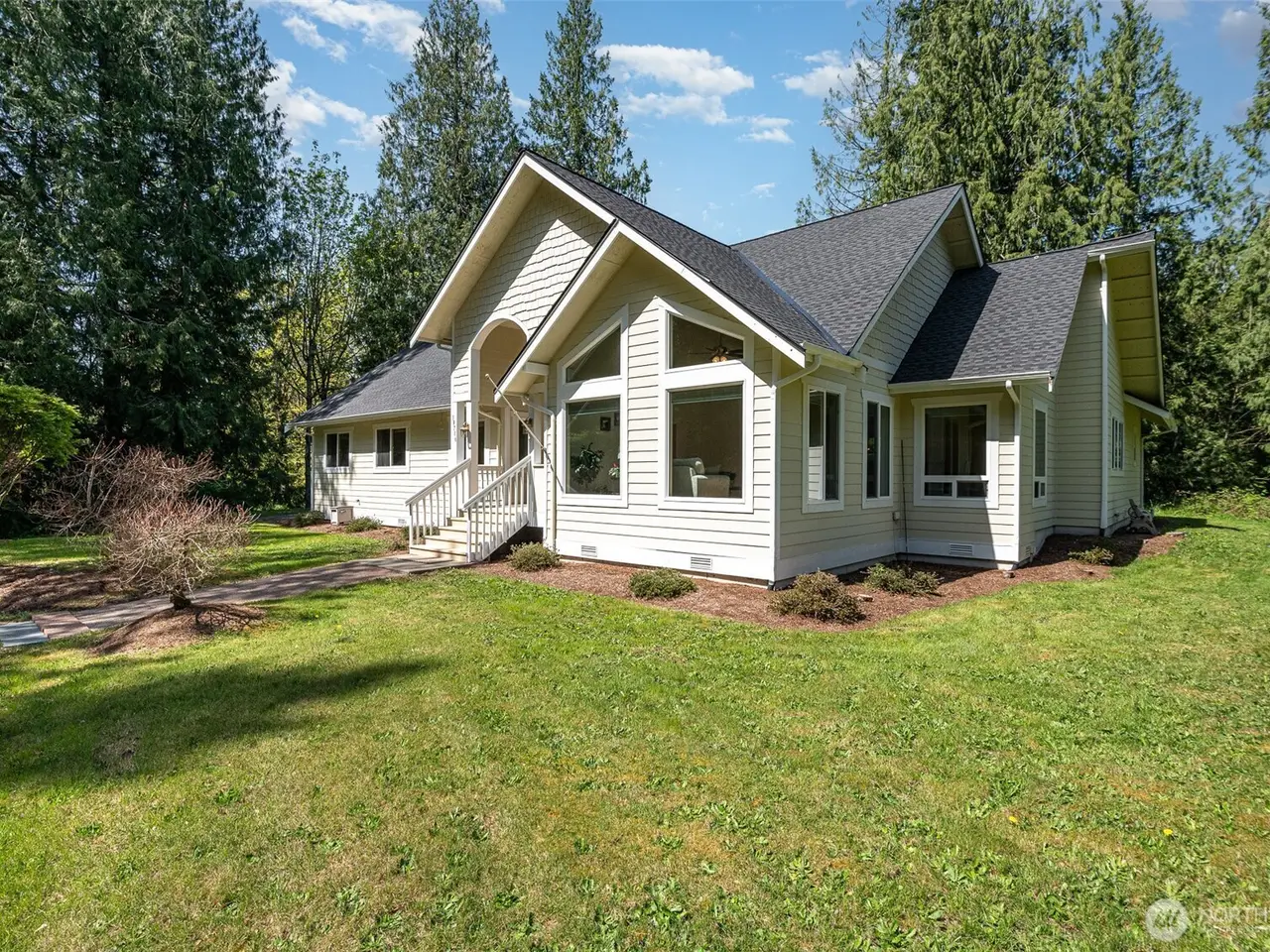Tucked away in a secluded & serene setting, this 2,600 sq ft picture-perfect custom rambler sits on 5 stunning acres surrounded by nature. With soaring 16 ft ceilings & abundant natural light through picturesque windows, this spacious home offers peace, privacy & beauty at every turn. Enter to find hardwood floors & an open-concept layout featuring a chef's kitchen with quartz countertops, SS appliances, & walk-in pantry. The expansive primary suite boasts vaulted ceilings, dual walk-in closets & recently renovated en-suite bath with dual vanity & walk-in shower. Stay cool with A/C & enjoy 3-car garage plus ample space for RVs, boats or ATVs & new roof! Pristine land is perfect for a garden or recreation. Located in the desirable Tahoma SD.