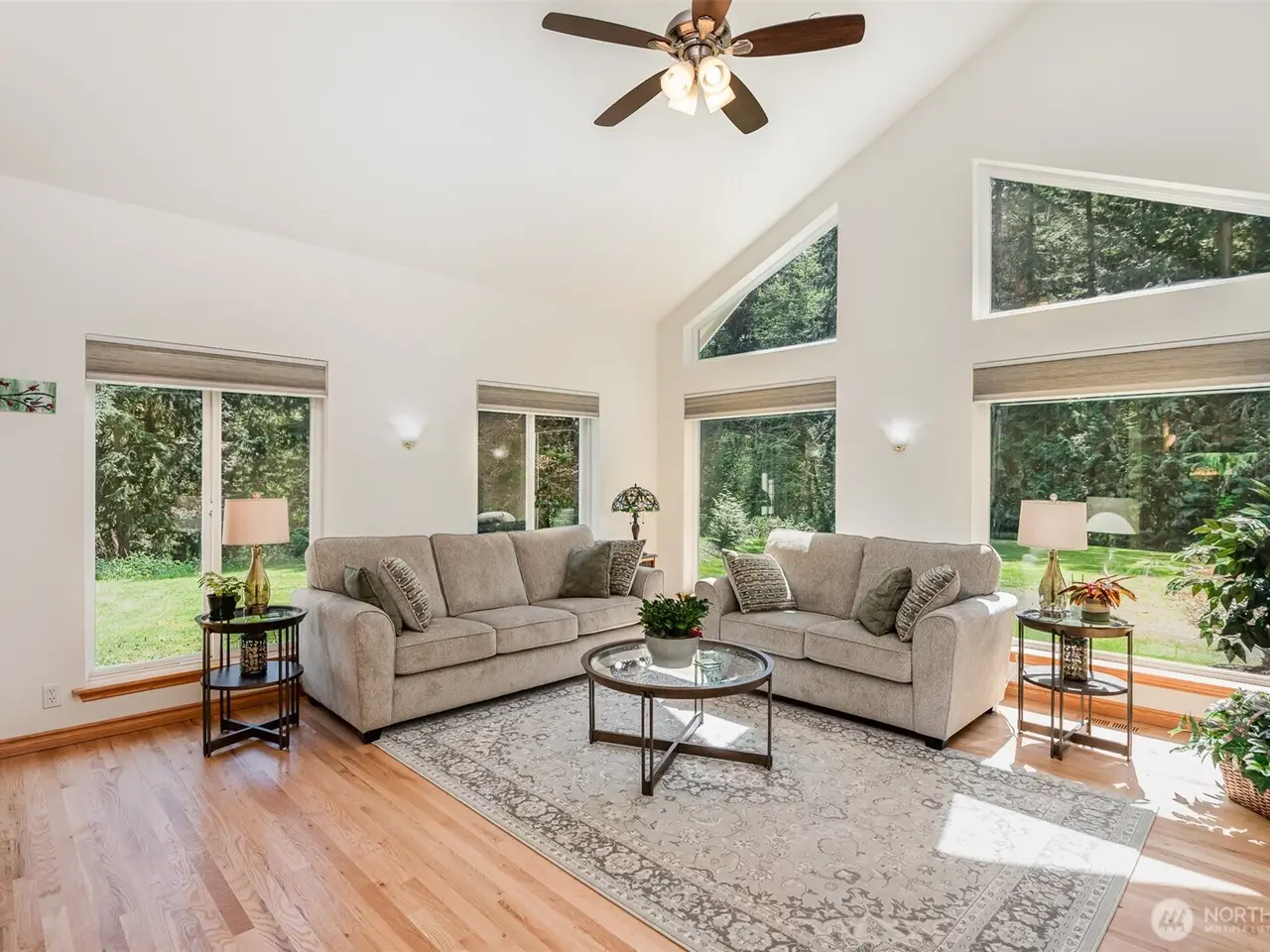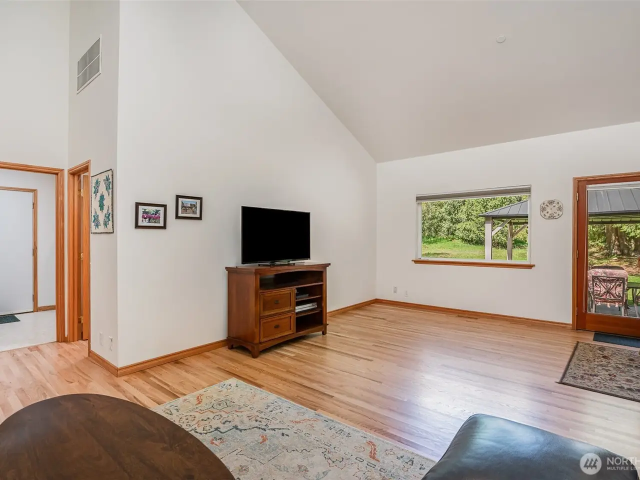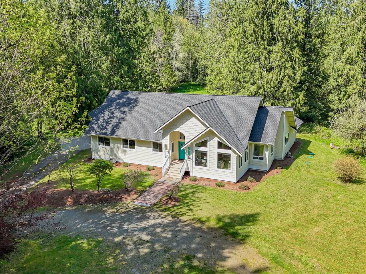 Tucked away in a secluded & serene setting, this 2,600 sq ft picture-perfect custom rambler sits on 5 stunning acres surrounded by nature. With soaring 16 ft ceilings & abundant natural light through picturesque windows, this spacious home offers peace, privacy & beauty at every turn. Enter to find hardwood floors & an open-concept layout featuring a chef's kitchen with quartz countertops, SS appliances, & walk-in pantry. The expansive primary suite boasts vaulted ceilings, dual walk-in closets & recently renovated en-suite bath with dual vanity & walk-in shower. Stay cool with A/C & enjoy 3-car garage plus ample space for RVs, boats or ATVs & new roof! Pristine land is perfect for a garden or recreation. Located in the desirable Tahoma SD.
