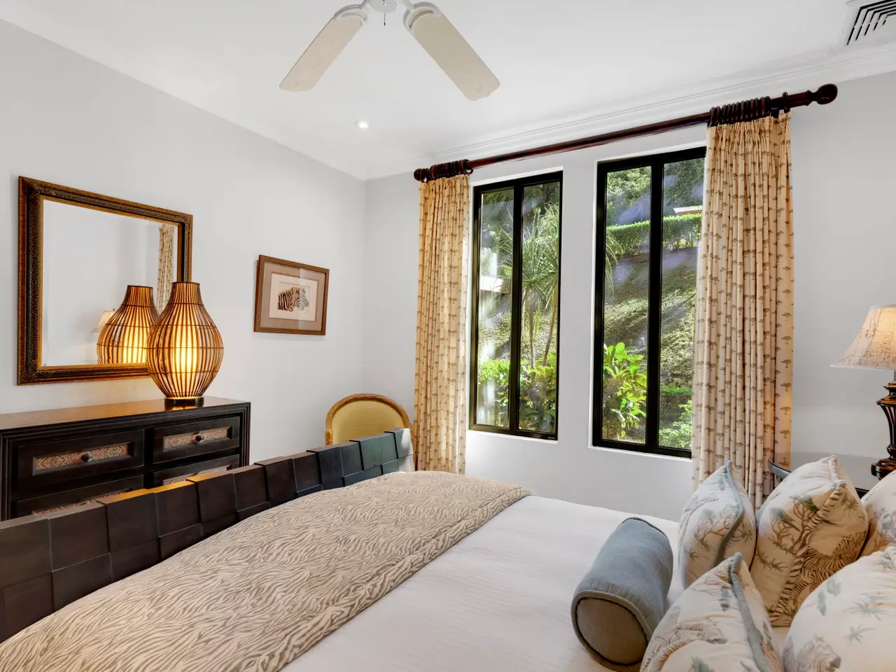 Located in the prestigious gated community of Reserva Conchal—often referred to as the “Crown Jewel” of Guanacaste—this stylish home boasts 3 bedrooms, 3 1/2 baths, plenty of space both indoors and outdoors, and has many perks that other homes in this development simply don’t have. As you enter the home, you will immediately notice the abundant natural light and open concept that this home offers, as well as its unique ability to seamlessly blend its traditional, rich hardwoods that Costa Rica is known for with a more modern, sophisticated vibe. And it is this perfect blend that captures the best of both worlds for its visitors. The living room features beautiful tones of blues and grays, a custom made entertainment center with flat screen TV, and a built in desk/bookshelf, perfect for use as a home office. This huge space opens to the dining room and, in turn, into the recently remodeled kitchen, which features hardwood cabinets, sleek quartz countertops, a large pantry for extra storage, and a striking island with waterfall edges that doubles as a breakfast bar for three. This open concert space aso features sliding glass doors that lead to a phenomenal covered patio featuring not one, not two, but three inviting spaces for guests to lounge while admiring the stunning tropical views, and hues of pinks and purples in the sky at sunset. Each of the bedrooms come with picturesque floor-to-ceiling views of the nature and it’s own en-suite bathrooms. The principle bedroom is a show stopper, with its impressive size, beautiful views, and ensuite bathroom again harmonizes the Costa Rican hardwoods with modern conveniences. The Bougainvillea development is a highly coveted community with its own private clubhouse, complete with a resort style pool, grill station and outdoor kitchen. Residents also have access to the pools of the famous Westin Resort and Spa, and Reserva Conchal’s beach club, which is nothing short of spectacular. The beach club features gorgeous pools, a high-end restaurant with poolside service, a fitness gym, his and her spas, hot-cold hydrotherapy pools, and water sports equipment. Best of all, this beach club is located on Playa Conchal, which is often referred to as one of the most beautiful beaches in Costa Rica. Reserva Conchal is a massive 2,300 acre resort, featuring a world-class golf course designed by Robert Trent Jones II, the Marriott-branded Westin and W hotels, over a dozen restaurants, tennis courts, pickle-ball courts, hiking and biking trails, and even zip-lining for its residents to enjoy.