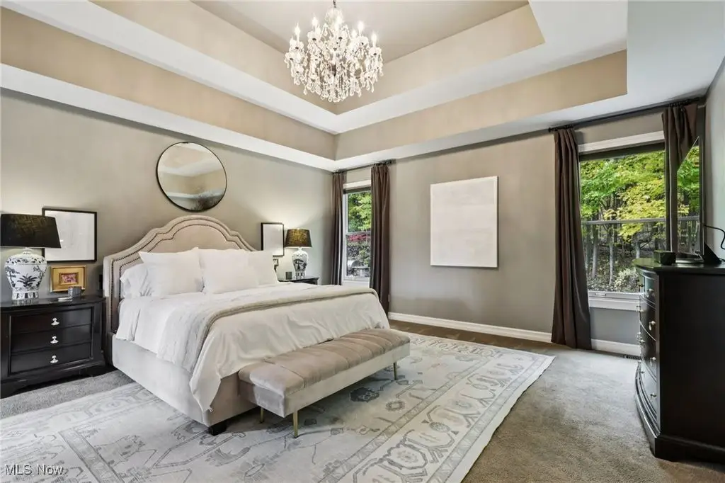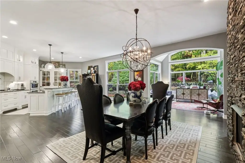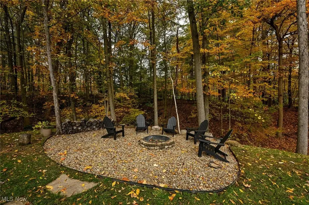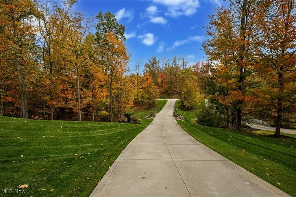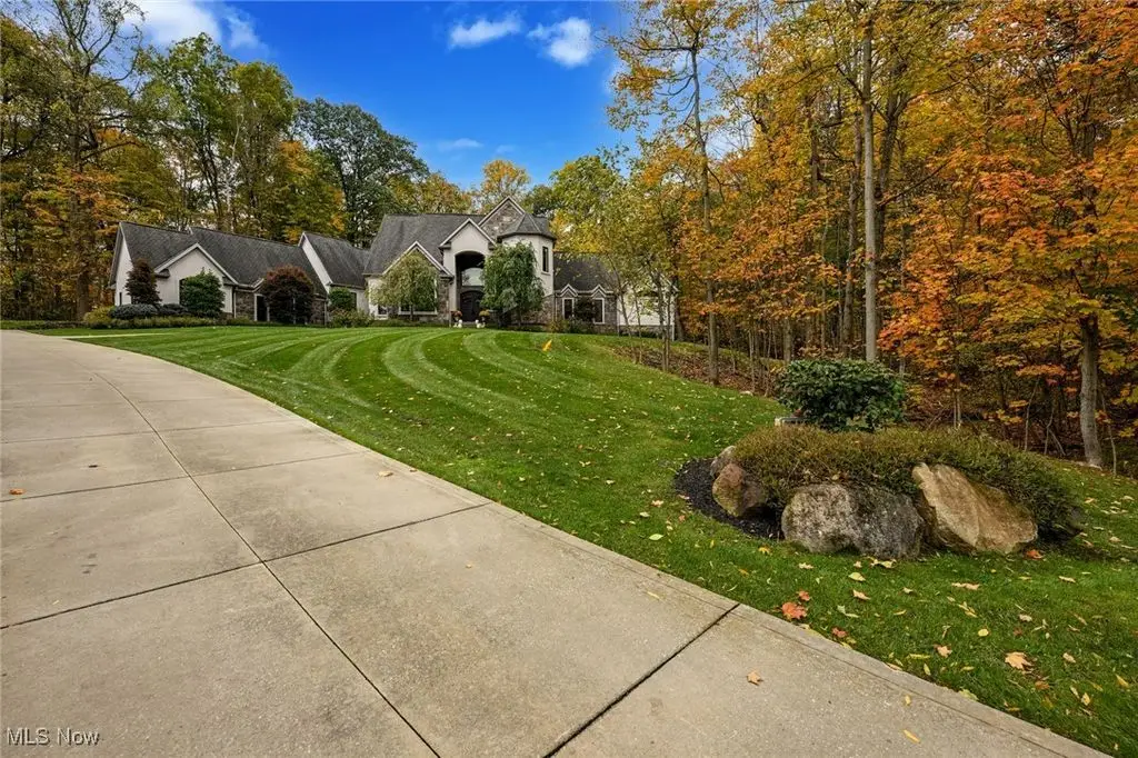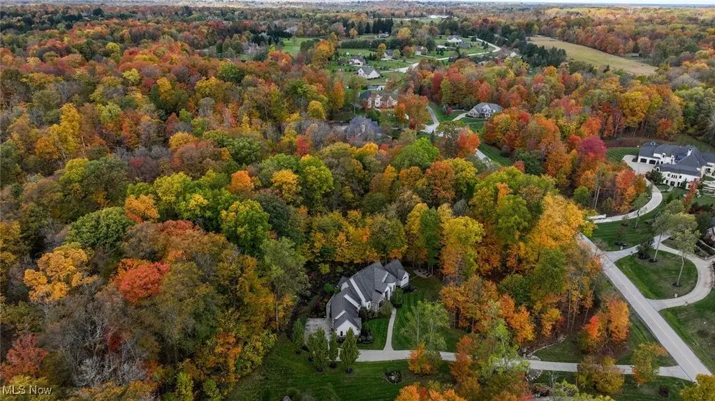 An oasis of luxury & tranquility by Ruggiero Builders. Nestled on 2 wooded acres w/ a gentle creek & sweeping natural views, this extraordinary custom built home combines elegance, comfort & superior craftsmanship. From the moment you step inside, the home's warmth & architectural detail unfold accented with spectacular Restoration Hardware lighting. As you enter, a grand great room is anchored by 2-sided stone fireplace, coffered ceilings & a wall off windows framing the scenic landscape. State-of-the-art kitchen boasts a generous granite island w/ breakfast bar, custom wood cabinetry & high-end appliances. This exceptional kitchen showcases an open floor plan that effortlessly connects the dining area/hearth room where a 2-sided fireplace adds warmth & character. Inviting sunroom w/dramatic vaulted ceiling & 3 walls of windows frame picturesque views of the outdoors. Designed for comfort, this layout creates a welcoming atmosphere. Retreat to the first floor primary suite, a serene haven w/ spa inspired glam bath, soaking tub, granite vanities, & walk-in glass shower. Oversized, custom walk-in closet, w/ his/her areas & built-ins. Adjacent library w/ rich millwork & double entry doors provides a perfect setting for work/relaxation. Upstairs, 3 large bedrooms offer privacy & comfort, incl. one ensuite & a well-appointed jack/jill bath. Walk-out lower level is designed for enjoyment/entertaining. Full wet bar w/ granite counters, wine coolers, & high-top seating for 12 boasts a game room, rec room, & gym designed for fun & relaxation. Half bath & wine storage complete this level. Take the fun outdoors & walk out to the yard & fire pit for cozy evenings. Outdoor living rivals the interior w/ a beautiful silver travertine patio for dining w/ built in grill, granite bar & gas fireplace table. The property is enhanced with integrated security & exterior cameras. This is more than a place to live-it's a place to create memories, unwind in style & live your best life!