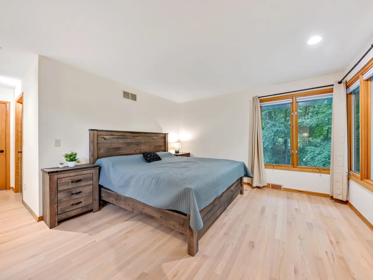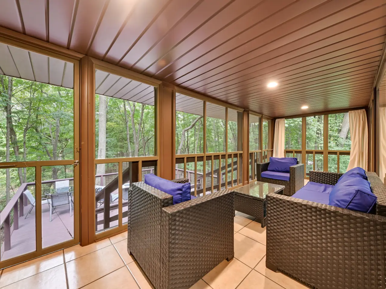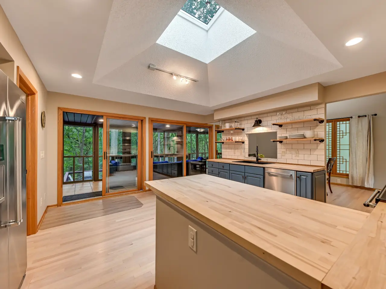 Tucked away in a serene setting in the Kettle Moraine, this Prairie-Style home blends natural beauty with modern comfort. Expansive windows and a skylight fill the home with light. The large kitchen features SS appliances and a wall of windows overlooking the 3-season room and deck. The bright living room offers HWFs and a sleek FP. Upstairs, 2 bedrooms with window seats share a pristine bath. The walkout LL is built for entertaining with FR, wet bar, bonus space, and 3rd full bath. Outside, enjoy the spacious deck nestled among trees. Enjoy the shared lake access for kayaking and fishing. Bring your UTV and enjoy the Kettle Moraine roads directly from your garage. Updates: New roof, interior/closet doors, hot tub, epoxy garage floor, refinished HWF and more. Don't miss this gem!