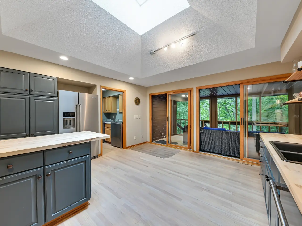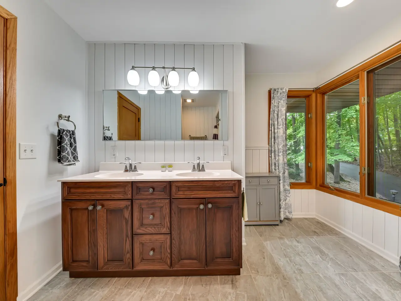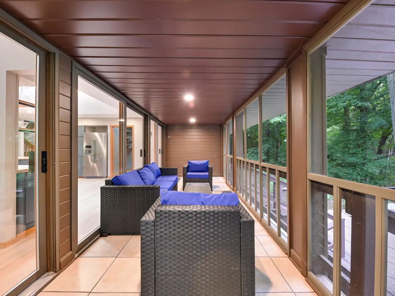 Tucked away in a serene setting in the Kettle Moraine, this Prairie-Style home blends natural beauty with modern comfort. Expansive windows and a skylight fill the home with light. The large kitchen features SS appliances and a wall of windows overlooking the 3-season room and deck. The bright living room offers HWFs and a sleek FP. Upstairs, 2 bedrooms with window seats share a pristine bath. The walkout LL is built for entertaining with FR, wet bar, bonus space, and 3rd full bath. Outside, enjoy the spacious deck nestled among trees. Enjoy the shared lake access for kayaking and fishing. Bring your UTV and enjoy the Kettle Moraine roads directly from your garage. Updates: New roof, interior/closet doors, hot tub, epoxy garage floor, refinished HWF and more. Don't miss this gem!