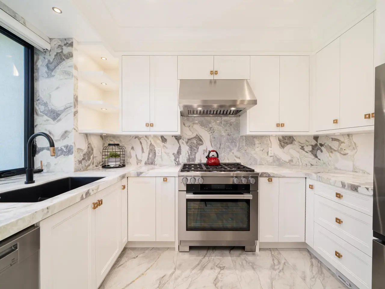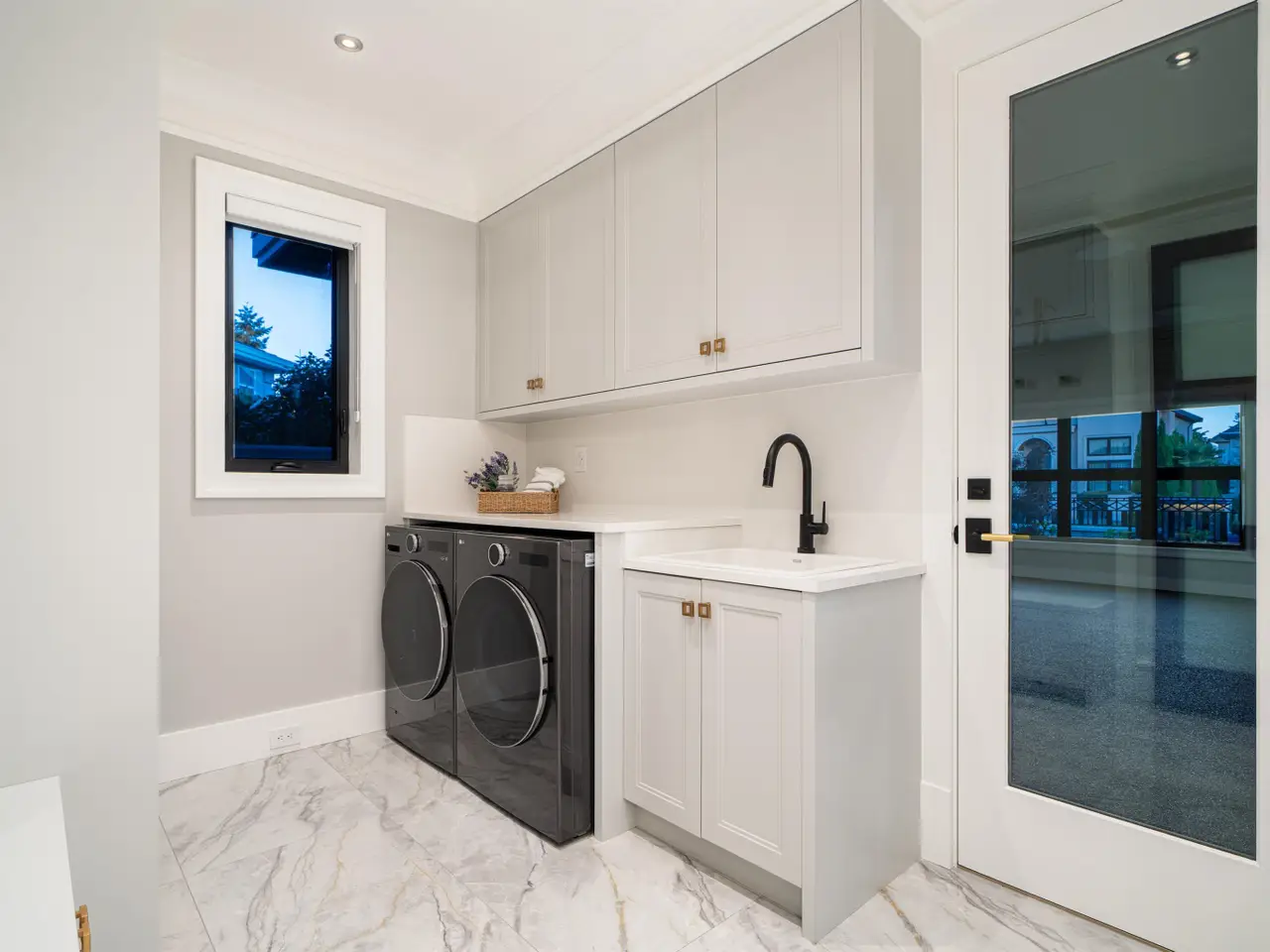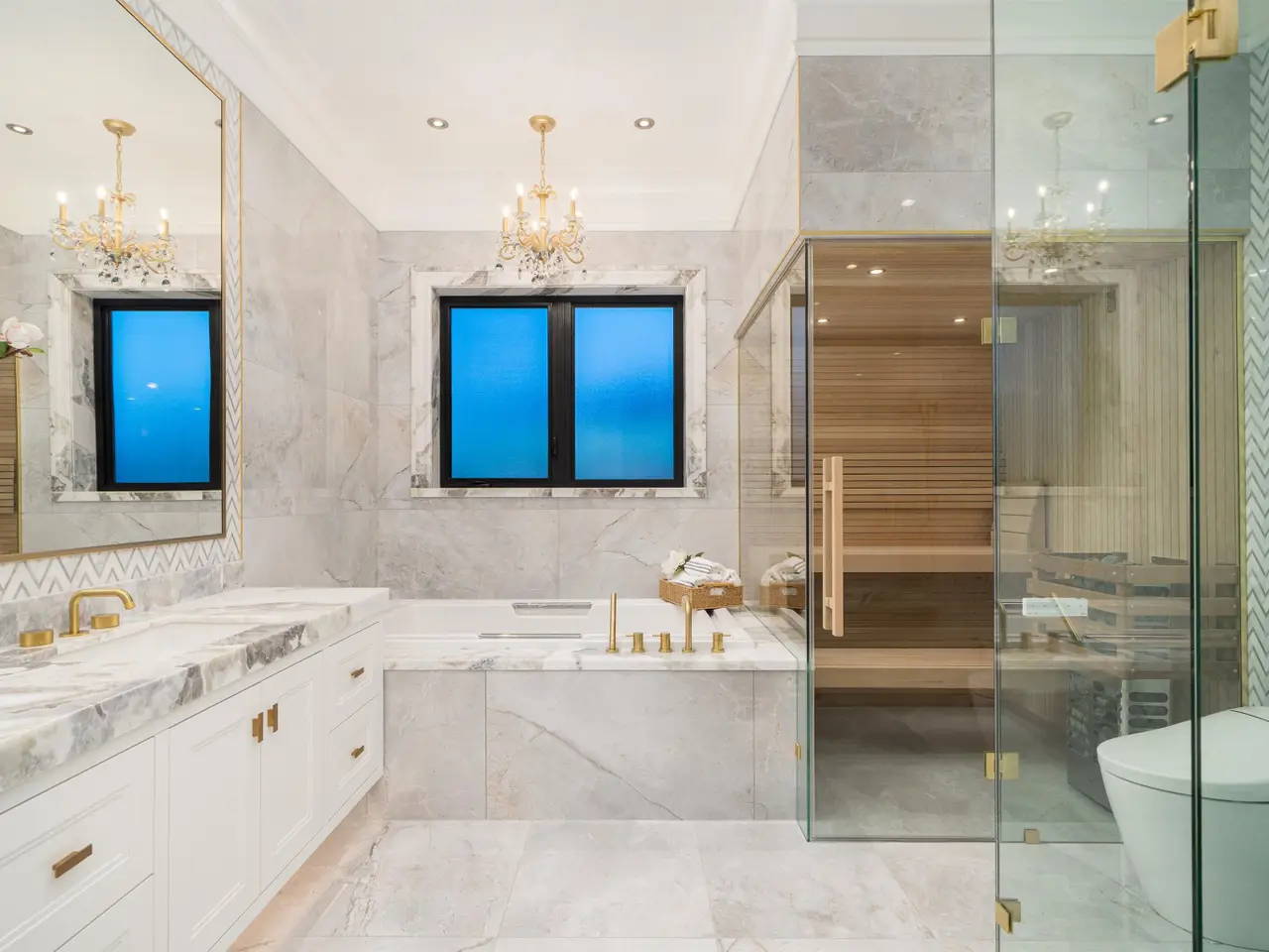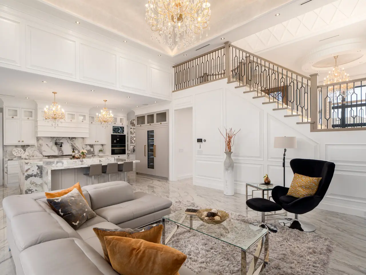 Elegant and luxurious custom home in the prestigious Granville area! North–South facing with a grand foyer featuring a stunning circular ceiling design and artistic wall accents. Italian marble flooring throughout, adorned with dazzling chandeliers. Spacious family room boasts a soaring vaulted ceiling, custom marble wall panel, and a warm fireplace. Gourmet kitchen with European marble countertops, top–tier Miele appliances, and premium cabinetry. Two master bedrooms, one with an expansive sundeck; all four upstairs bedrooms include walk-in closets. Legal suite below. Smart home system with motorized curtains, A/C, HRV, Hikvision intercom. Enjoy a fully equipped media room with wet bar, plus a private sauna. A true masterpiece for the discerning buyer!
