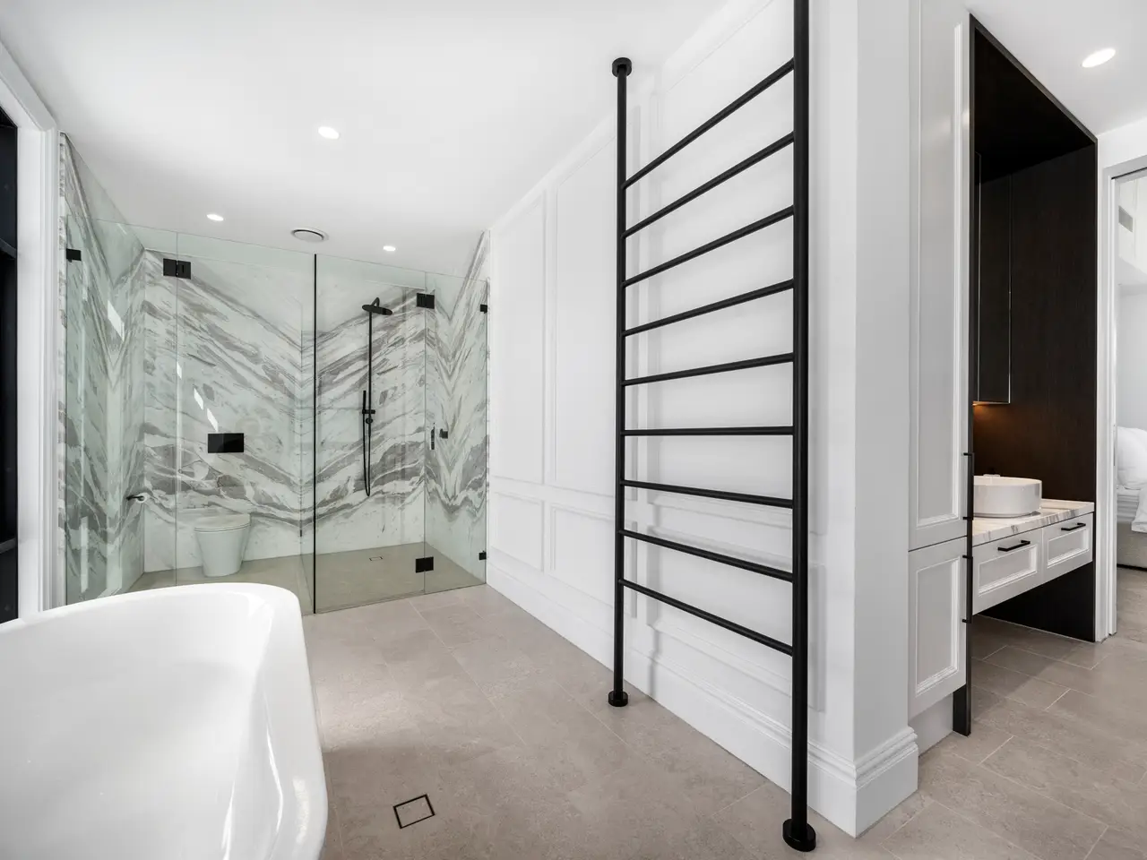 Luxurious bathroom with bath and powder room