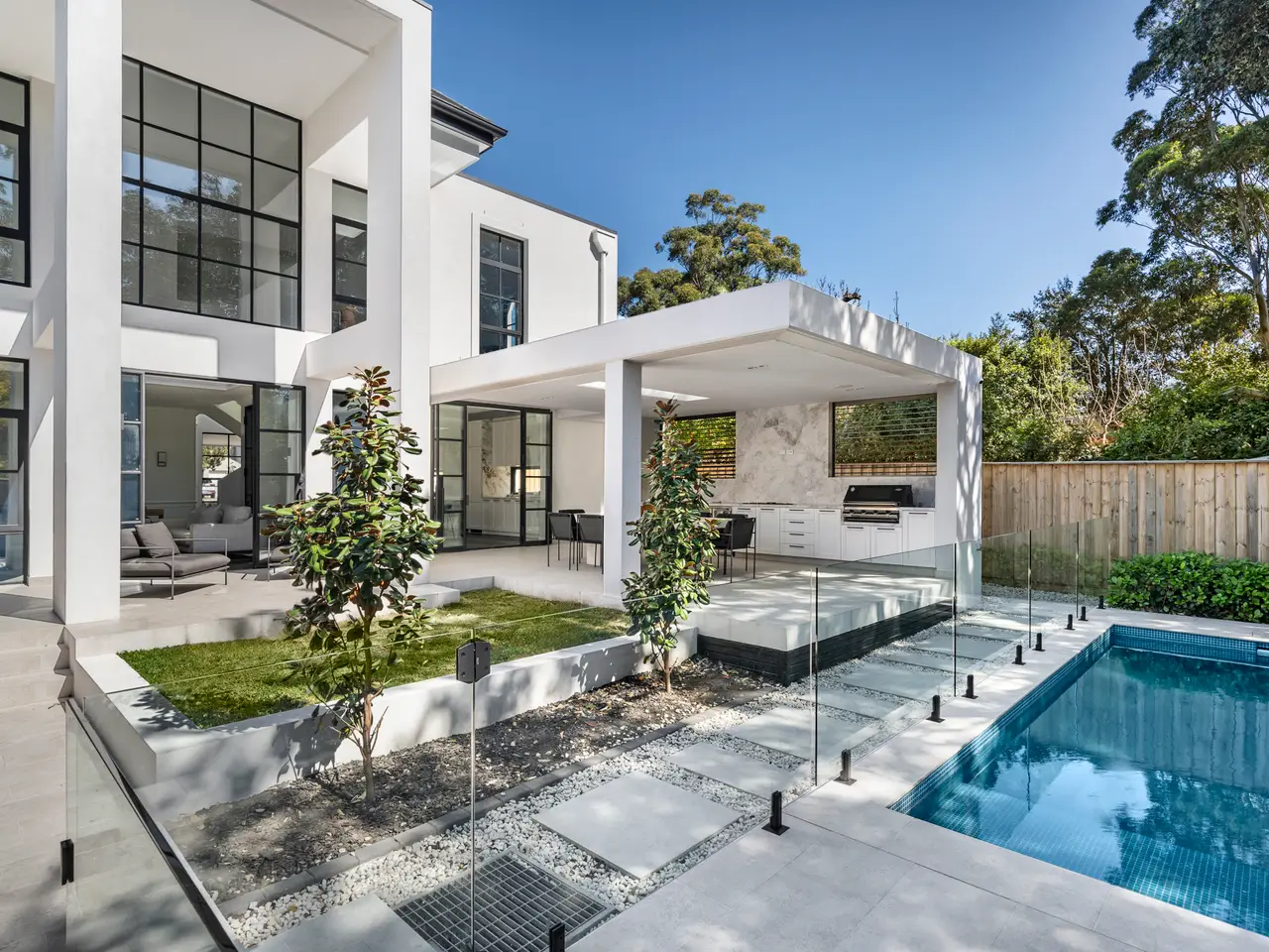 Brand new and impressively detailed, this stunning residence combines full double brick and dual concrete slab construction with architectural curvature, dynamic ceiling heights, double glazed steel windows and doors and first class finishes over two levels. Sleek interiors provide superb functionality and family comfort complemented by a true north resort environment for entertaining at the rear with pleasant leafy outlooks. It delivers the perfect balance of prestige and convenience in a peaceful neighbourhood within 15mins walk of Tambourine Bay and esteemed St Ignatius' College. - Open concept design featuring two living zones and family dining area - Calacatta marble island kitchen, Miele appliances and butler's pantry - Four beds, two each with ensuite, walk-ins/dressing, zoned air-conditioning - Luxurious bathroom with bath upstairs and ground floor powder room - Double glazed steel windows and doors, smart Wi-Fi controlled - Covered rear terrace, outdoor kitchen and in-ground swimming pool - Motorised driveway gates to auto lock-up double garage and turntable