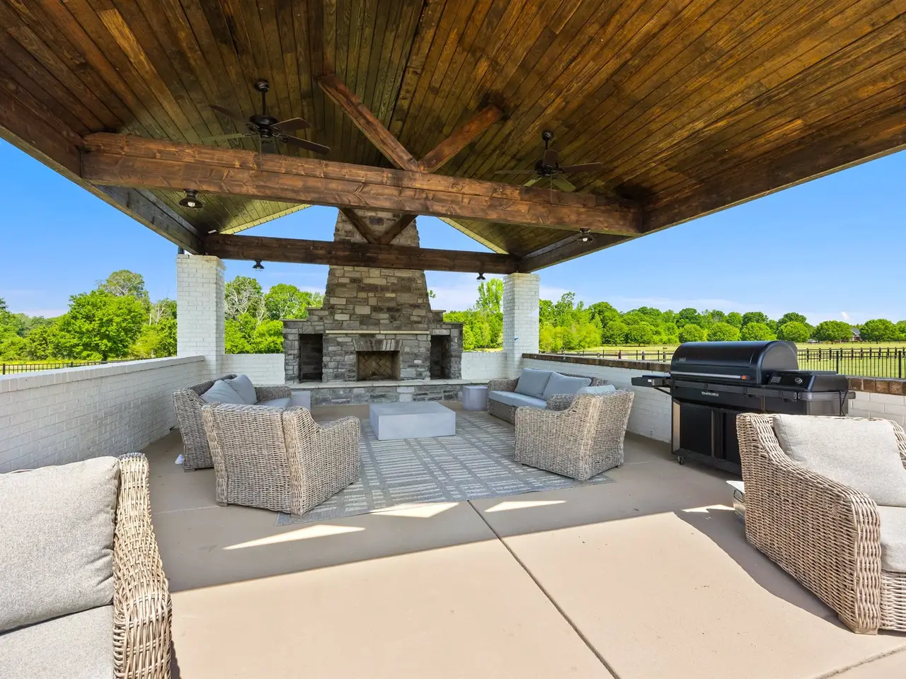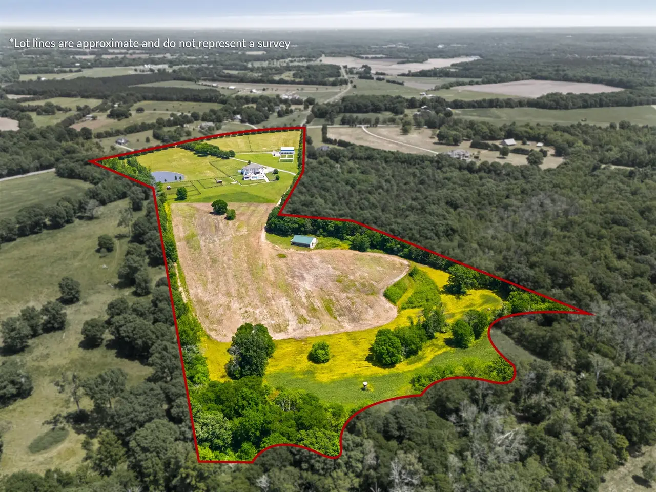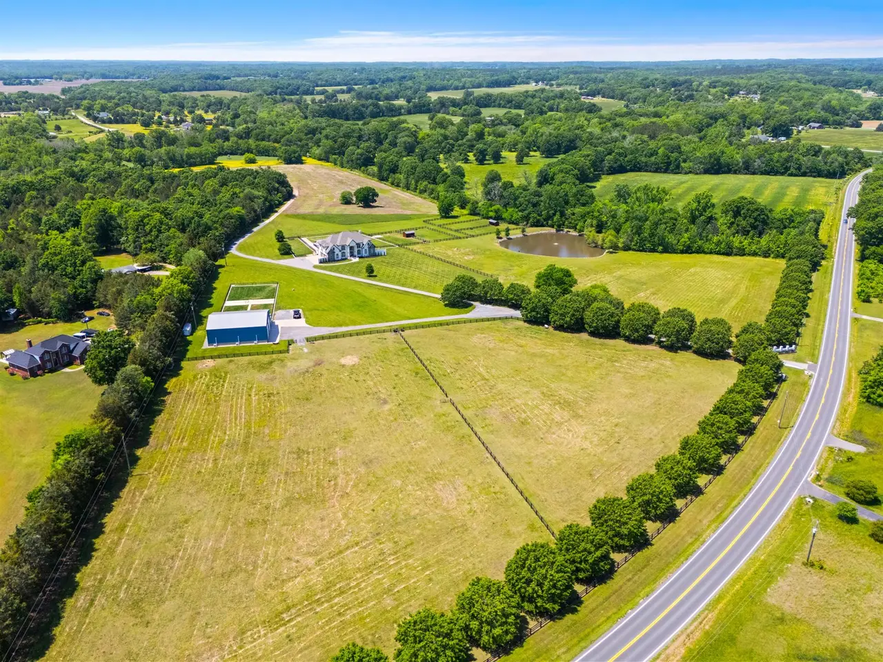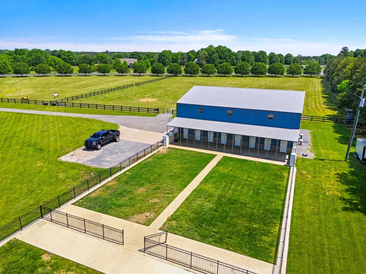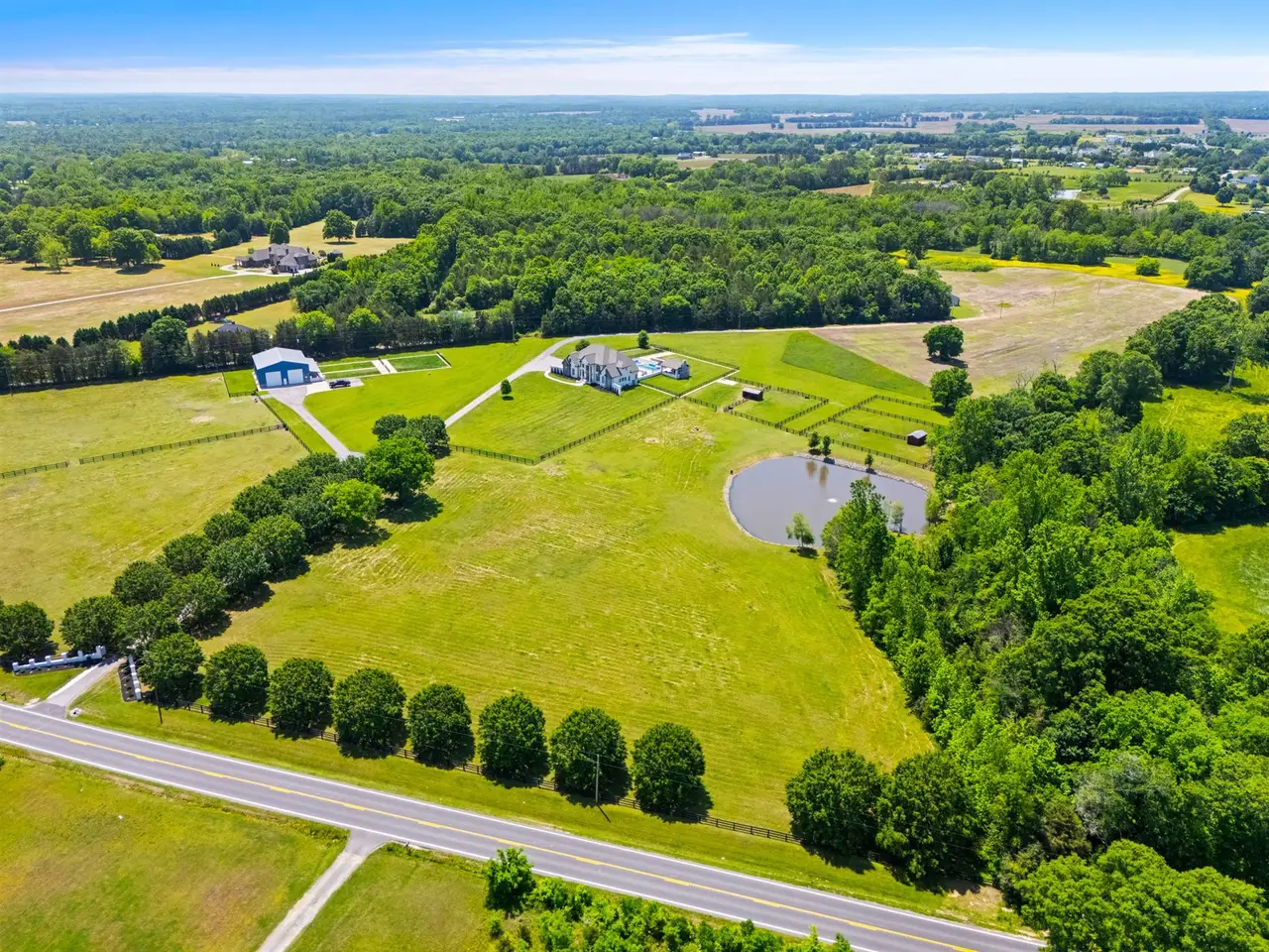 Welcome to an extraordinary opportunity to own a private, gated estate on 38.1 fully fenced acres of pastureland. This stunning modern brick home has been beautifully updated & offers 5 spacious bedrooms, including 2 luxurious primary suites - one on the main level with a sitting area & another upstairs. The heart of the home is an impressive chef's kitchen featuring double quartz islands, a Sub-Zero refrigerator, Wolf appliances, custom cabinetry & more. Step outside to a resort-style backyard oasis with a heated saltwater pool with lounge deck & hot tub. A covered pavilion with a wood-burning fireplace adds year-round enjoyment. The grounds also include a stocked pond, multiple fenced pastures with run-in sheds for livestock & 2 expansive barns. The front hobby barn spans over 3,400 sq ft, is heated & cooled, includes 2 oversized RV doors & is equipped with permanent kennels. A second 2,300 sq ft barn at the rear of the property offers additional storage. Septic is for 4 bedrooms.