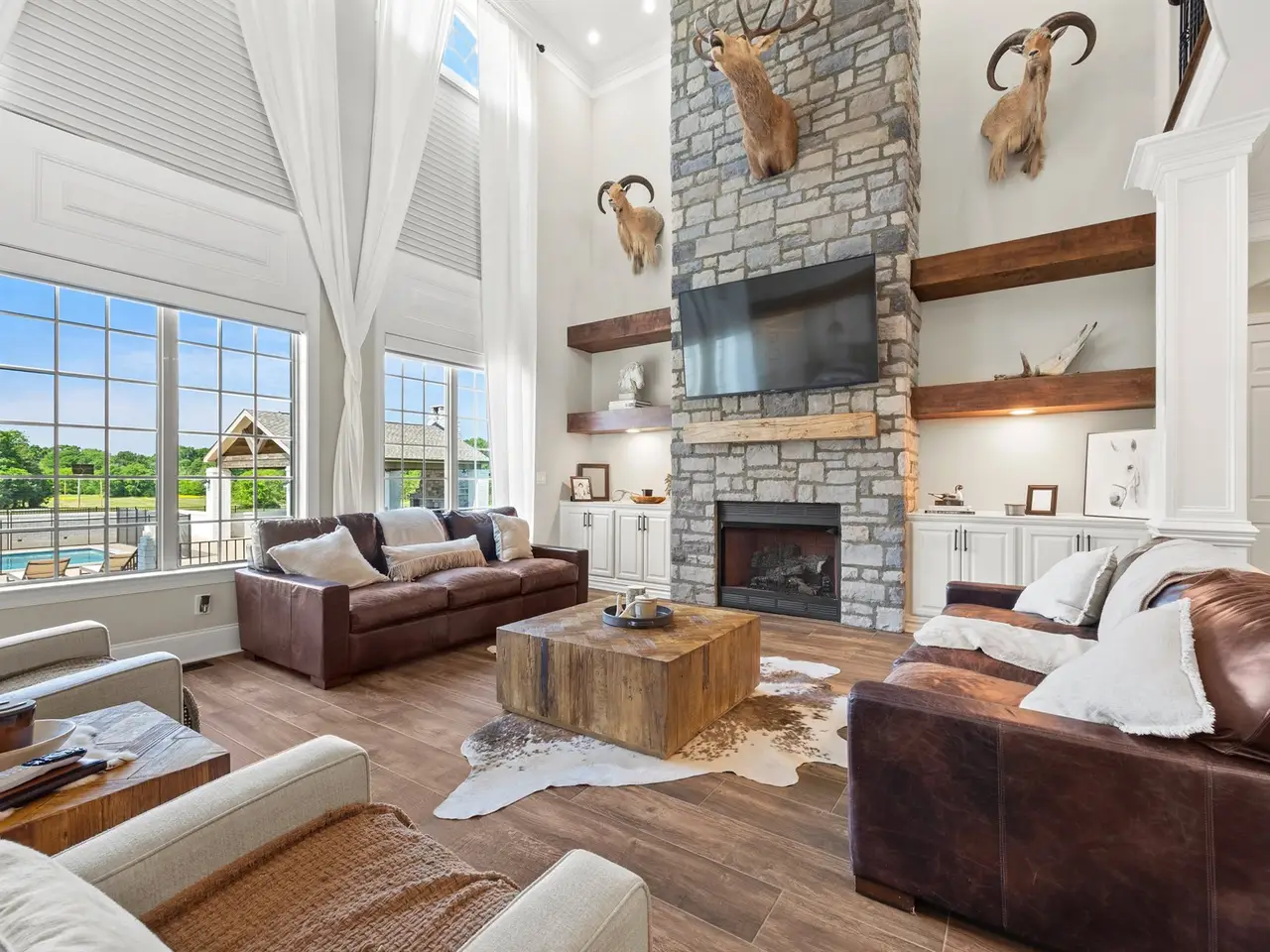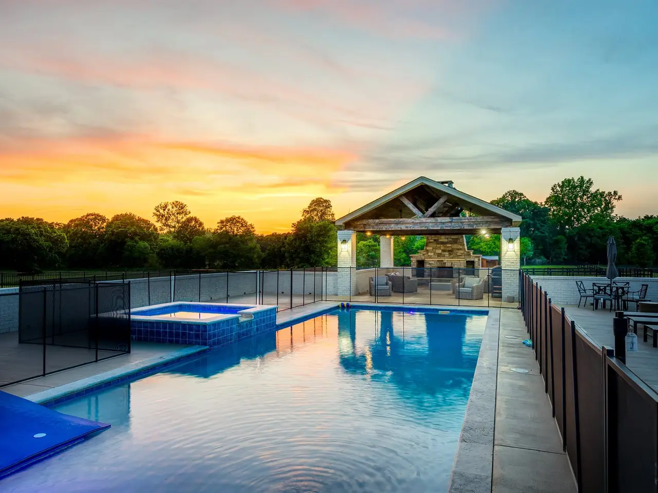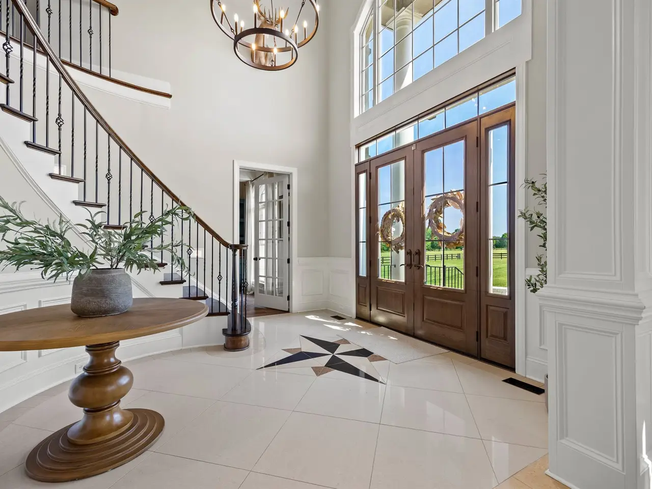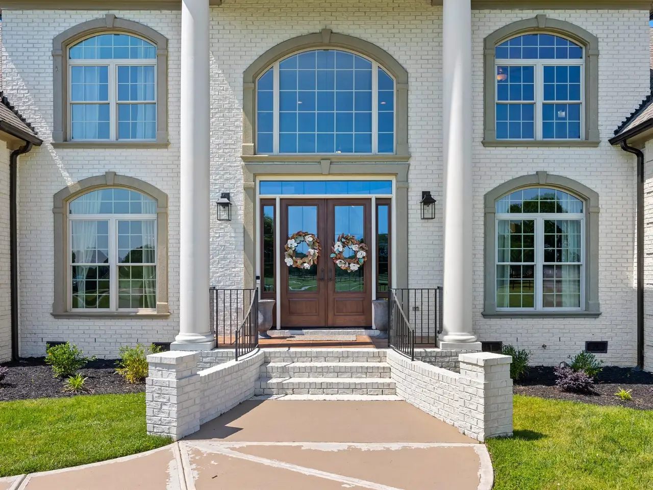 Welcome to an extraordinary opportunity to own a private, gated estate on 38.1 fully fenced acres of pastureland. This stunning modern brick home has been beautifully updated & offers 5 spacious bedrooms, including 2 luxurious primary suites - one on the main level with a sitting area & another upstairs. The heart of the home is an impressive chef's kitchen featuring double quartz islands, a Sub-Zero refrigerator, Wolf appliances, custom cabinetry & more. Step outside to a resort-style backyard oasis with a heated saltwater pool with lounge deck & hot tub. A covered pavilion with a wood-burning fireplace adds year-round enjoyment. The grounds also include a stocked pond, multiple fenced pastures with run-in sheds for livestock & 2 expansive barns. The front hobby barn spans over 3,400 sq ft, is heated & cooled, includes 2 oversized RV doors & is equipped with permanent kennels. A second 2,300 sq ft barn at the rear of the property offers additional storage. Septic is for 4 bedrooms.