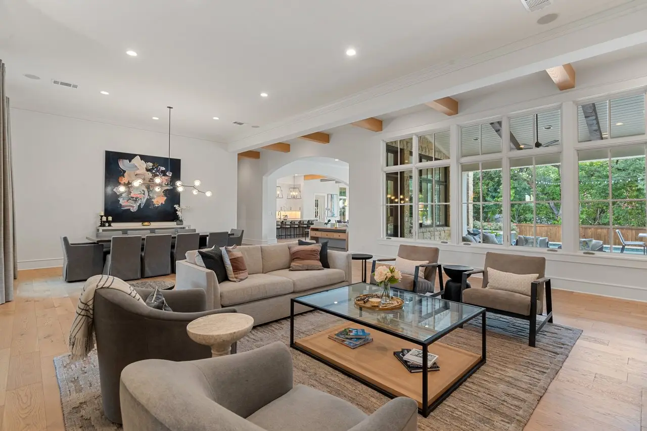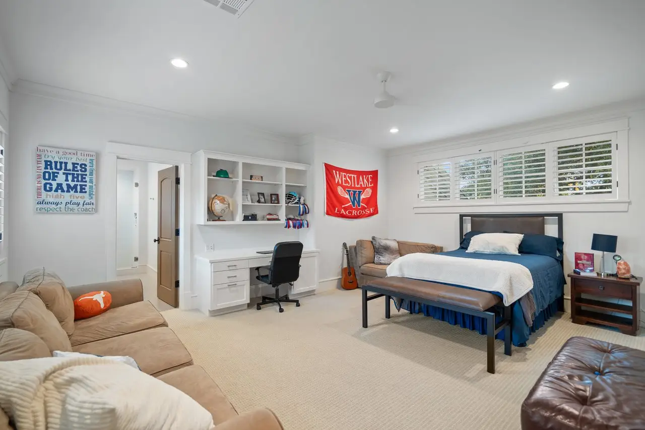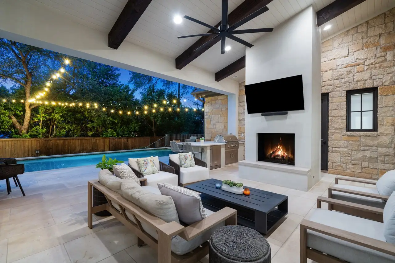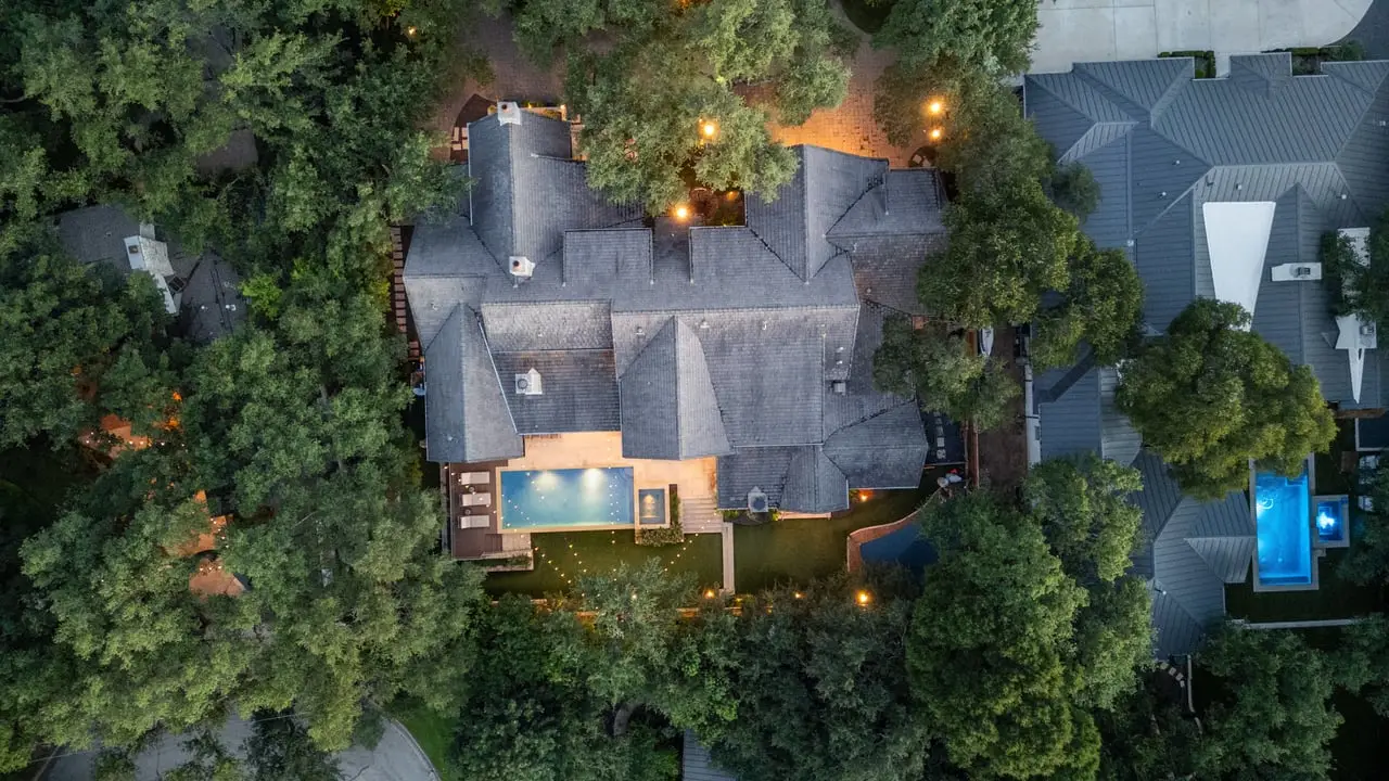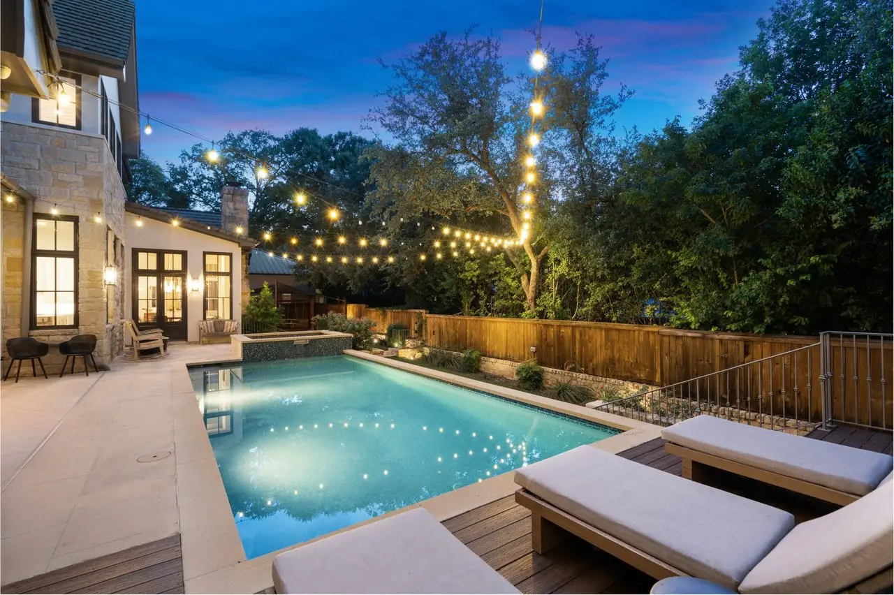 Welcome to 4907 Rollingwood Drive, a striking architectural gem nestled in the heart of one of Austin’s most prestigious neighborhoods. This sprawling 6,655-square-foot estate is a masterclass in transitional modern design—reimagined in 2021 through a collaboration with renowned LaRue Architects, interior design firm Kopfer Taylor Interiors, and luxury home builder ETF. The result is a residence that seamlessly merges timeless craftsmanship with elevated, contemporary style. Sited on an expansive .45-acre tree-lined lot, the home’s European style stone façade and graceful arches immediately command attention. Inside, the entry sets the tone with an expansive great room, abundant natural light, and an effortless flow between living spaces. Walls of glass frame the main living and dining areas, creating a constant visual connection to the outdoor covered patio, pool, and gardens beyond. The interiors exude warmth and refinement, with custom millwork, white oak flooring, designer lighting, and curated finishes at every turn The heart of the home is the open-concept kitchen—a true culinary showpiece featuring an oversized island, tailored cabinetry, premium appliances, and a walk-in pantry. Adjacent to the kitchen, a cozy breakfast nook with a fireplace invites intimate mornings, while a dramatic formal dining room with exposed beams offers a spectacular setting for hosting. Two distinct living rooms—each flooded with natural light—offer versatility for both grand entertaining and relaxed family time. The main-level primary suite is an indulgent retreat, complete with two generous walk-in closets, a spa-like bath with soaking tub and oversized shower, and direct access to a covered porch nestled beneath the trees. A private library adjoins the suite, offering the perfect space to unwind or work in peace. At the opposite wing of the home, a private guest suite with its own bath, walk-in closet, breezeway, and sun porch provides elegant accommodations for extended stays or multi-generational living. Upstairs, three additional bedrooms—each with their own en-suite bathroom—are designed with comfort and style in mind. A centrally located bonus room functions beautifully as a media lounge, game room, or gym creating a central hub for family fun and connection. An upstairs laundry room adds practicality and convenience. Outside, the property is a sanctuary designed for both relaxation and celebration. The expansive covered terrace includes a full outdoor kitchen, stone fireplace, and ample space for al fresco dining and lounging. The shimmering pool is flanked by a spa and surrounded by lush landscaping, offering total privacy and serenity. A mosquito misting system, automated landscape lighting, and whole-home generator ensure year-round comfort and peace of mind. Additional features include a circular driveway, a spacious motor court, and an oversized garage with room for up to twelve vehicles—making this an ideal setting for entertaining on any scale. The property also benefits from a shared well for irrigation and pool systems, ensuring efficiency and sustainability. Membership to the Rollingwood community pool is included, providing access to additional neighborhood amenities just moments away. With its architectural pedigree, exquisite detailing, and seamless blend of form and function, 4907 Rollingwood Drive offers a rare opportunity to own a truly exceptional home in a location that balances privacy, prestige, and proximity to Austin’s best schools, shops, and dining. This is more than a residence—it’s a lifestyle of timeless luxury.