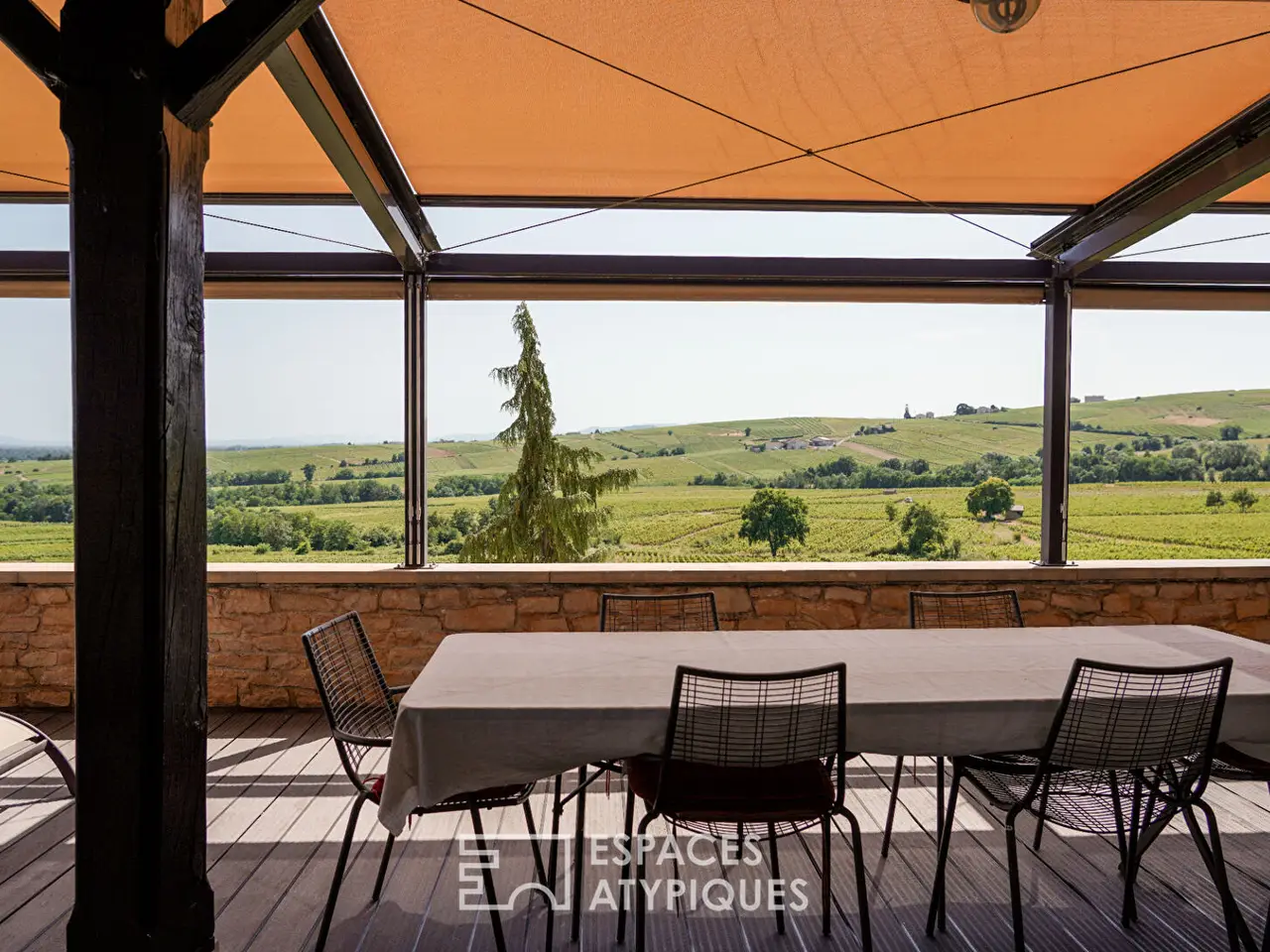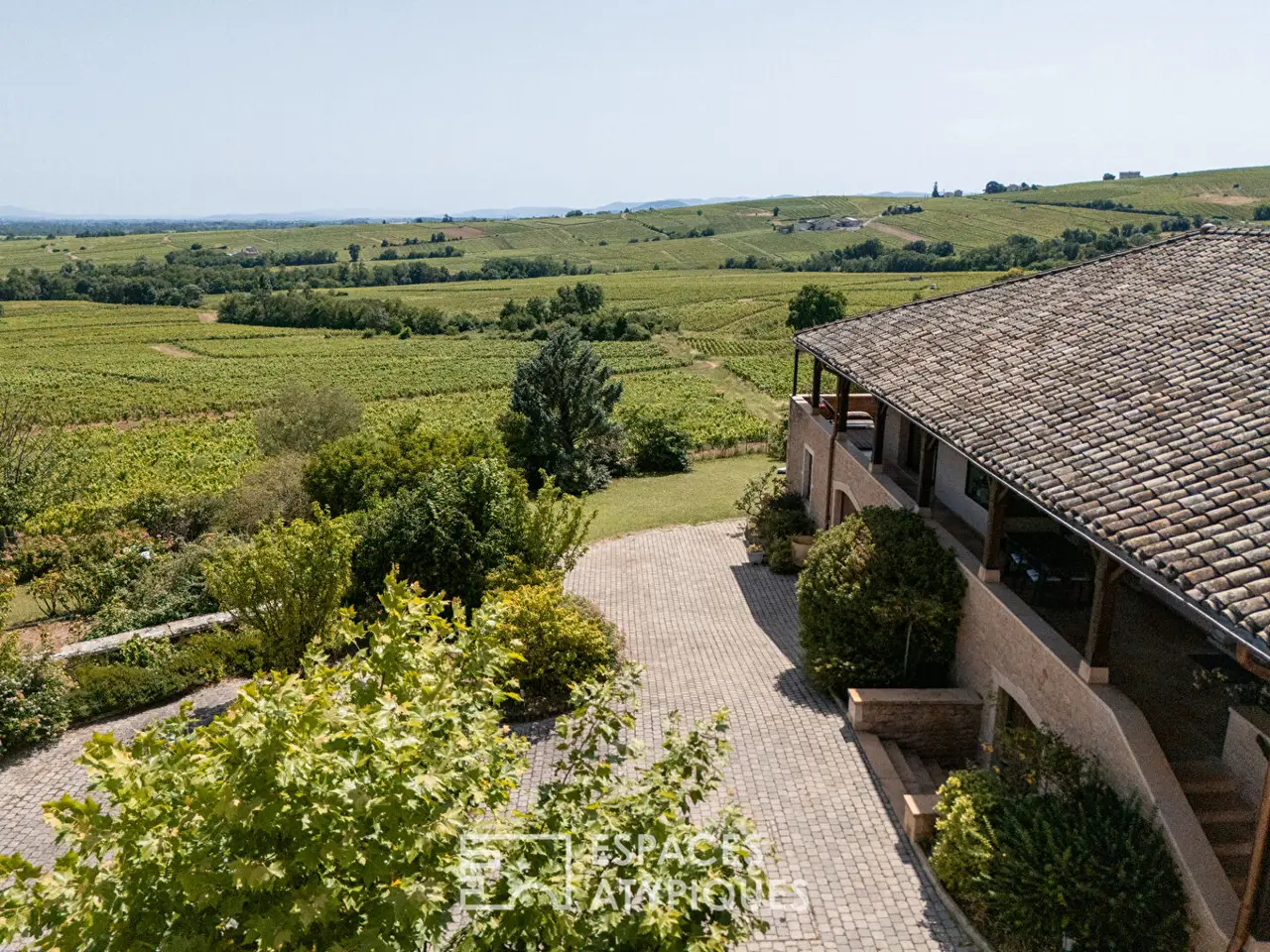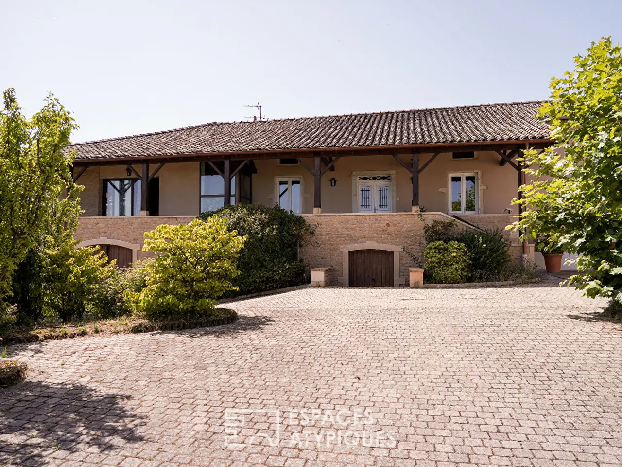 Located in the heart of the Beaujolais vineyards, this stone winemaker's house, with 211 sqm of living space and 820 sqm of usable space, nestled on landscaped grounds of approximately 1850 sqm, displays typical regional architecture enhanced by generous volumes. Its exceptional panorama, its covered terrace with unobstructed views, its vast wooded garden and its vaulted cellar make it a unique residence, with rare character. The main house, built on cellars and garages, is arranged around a covered gallery, benefiting from a vast living space bathed in light, enhanced by generous ceiling heights, exposed beams and a stone fireplace. The living room opens naturally onto a wooden terrace, offering a breathtaking view of the hillsides. The semi-open kitchen integrates into a warm and friendly atmosphere. The sleeping area includes two spacious bedrooms, each with its own bathroom, as well as an office and functional storage spaces. A mezzanine and an attic make it easy to imagine creating additional bedrooms. The whole offers a fluid layout, ideal for family life or a guest house project. Indeed, the wing of the house, formerly used as a winery, offers multiple possibilities for professional use: gite, bed and breakfast, : Outside, the charm works instantly: a paved driveway, a carefully maintained wooded garden, a covered terrace facing south, and a stone wine cellar, an authentic vestige of the winery's winemaking past. Each outdoor space invites contemplation, calm, and conviviality, in a preserved environment. Located in the immediate vicinity of amenities, this property is 45 minutes from Lyon and a few kilometers from all school and commercial infrastructures. A unique property in the heart of a listed landscape, combining art of living, heritage, and nature. More information and file available from our agency. ENERGY CLASS: D / CLIMATE CLASS: D - Estimated average amount of annual energy expenditure for standard use, indexed to the years 2021, 2022, 2023: between 3910 euros and 5330 euros. (subscription included). REF. 867EB Additional information * 12 rooms * 4 bedrooms * Outdoor space : 1853 SQM * Property tax : 1 510 € Energy Performance Certificate Primary energy consumption d : 169 kWh/m2.year High performance housing