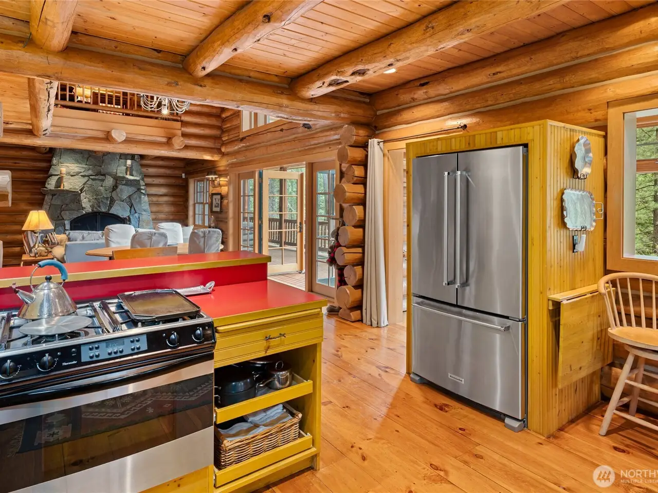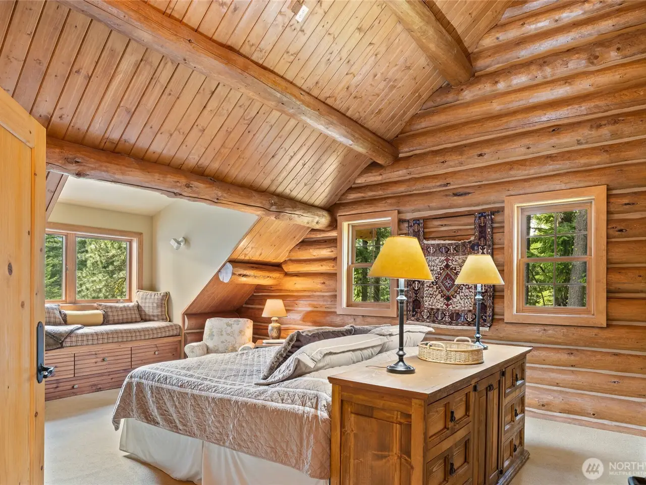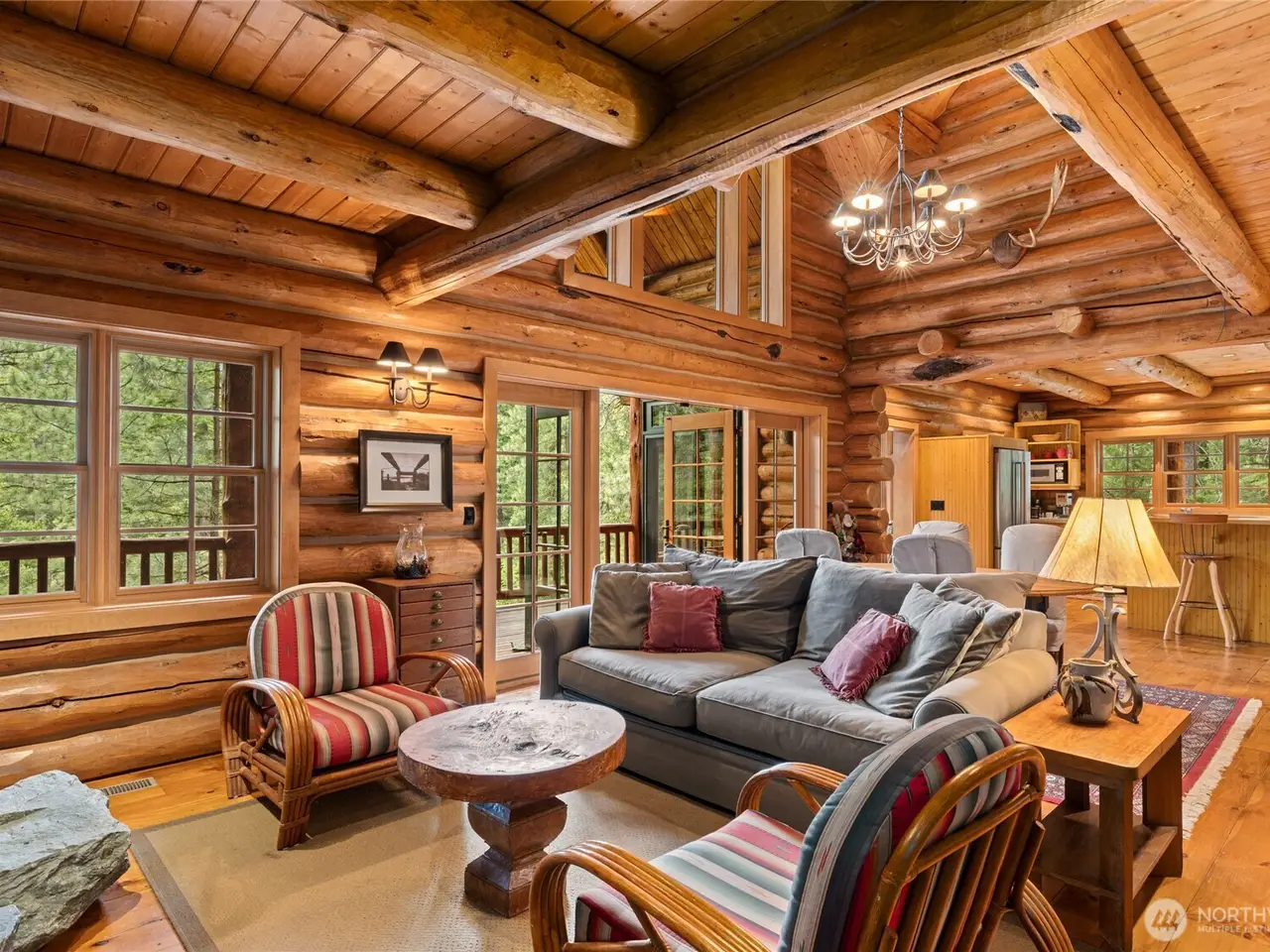 Custom log home with soaring vaulted ceilings and log beams