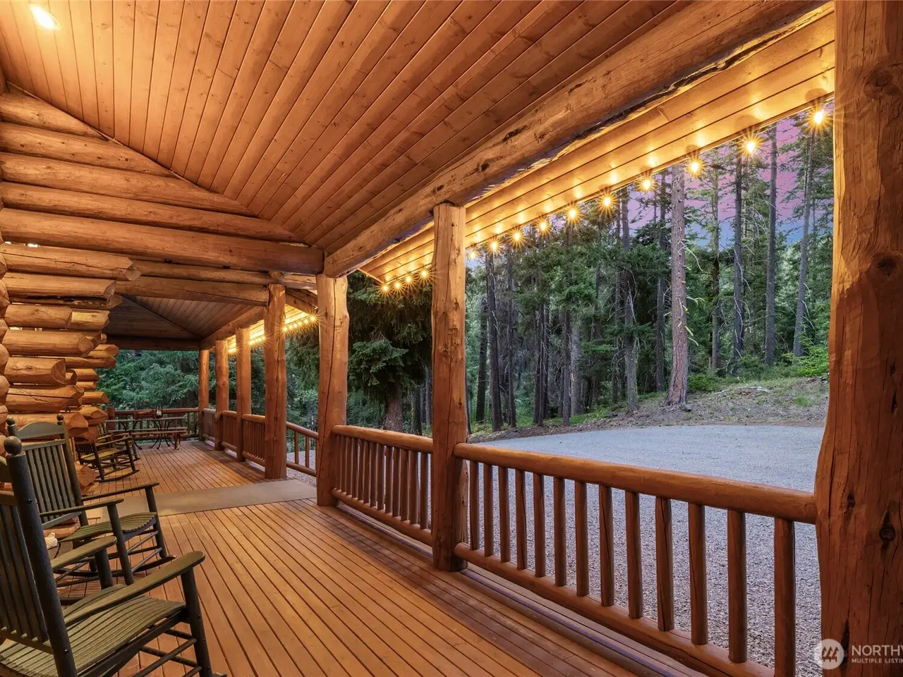 Covered wrap-around deck with mountain views