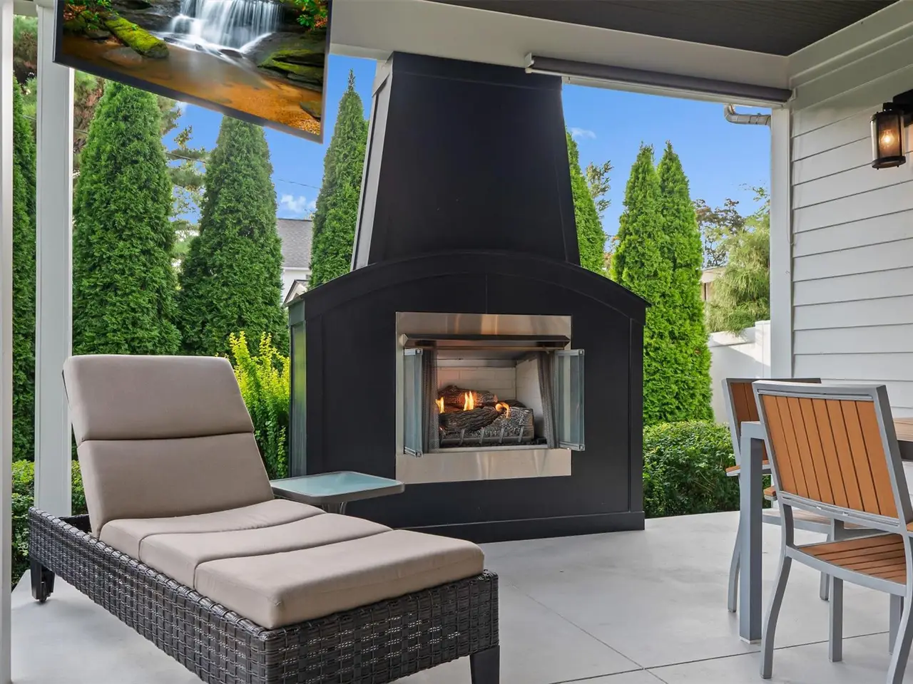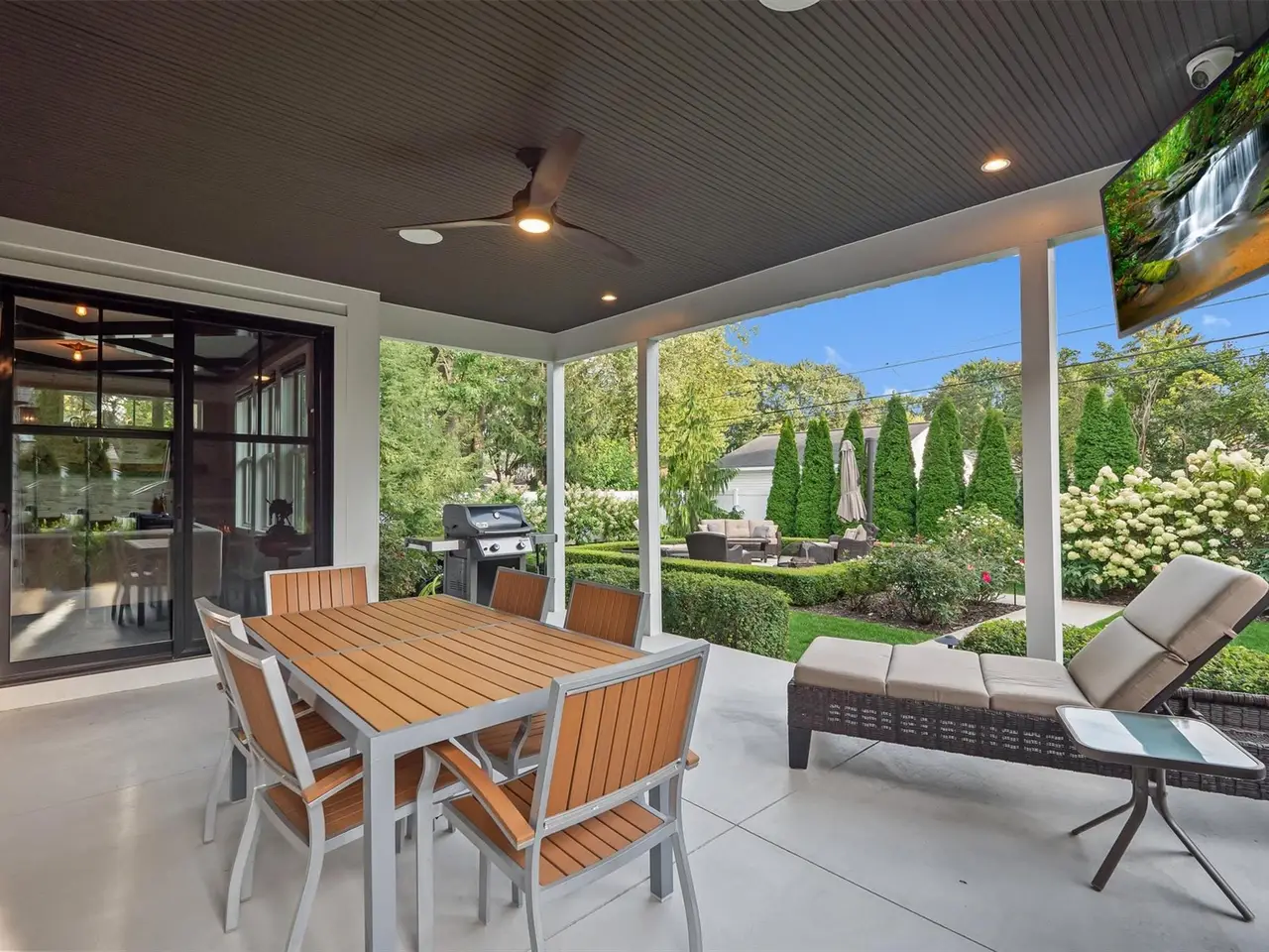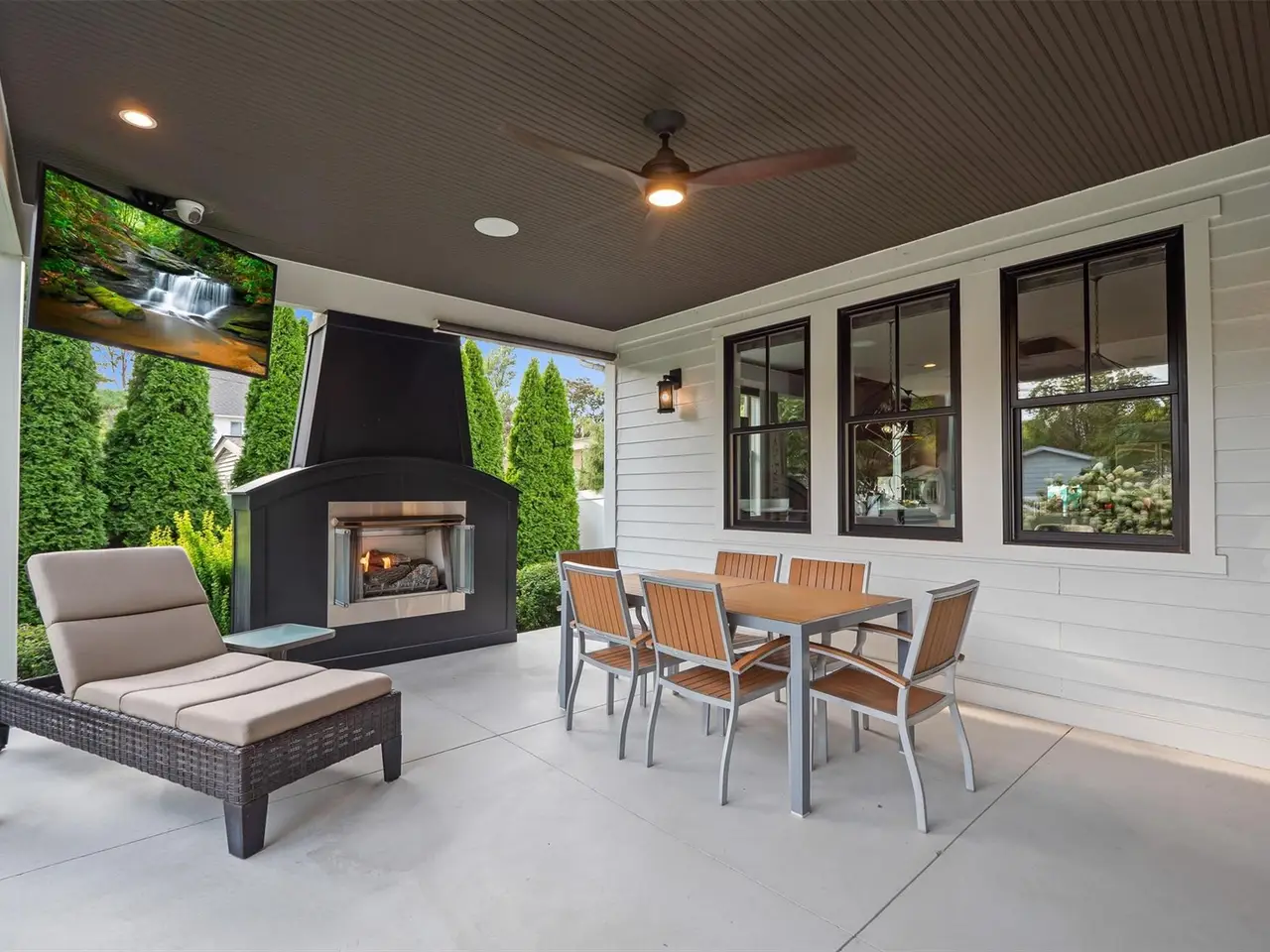 Outdoor fireplace and TV on covered patio