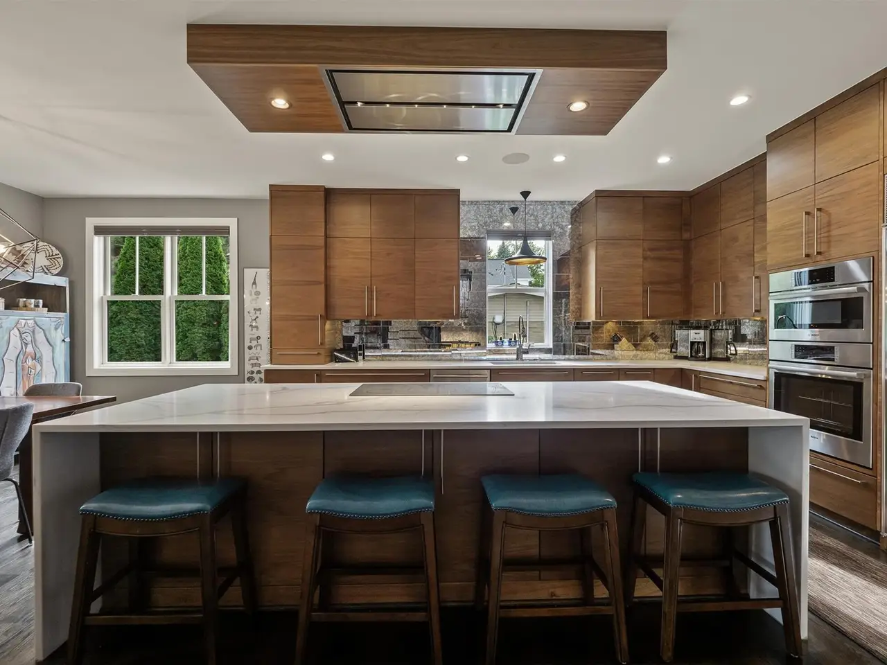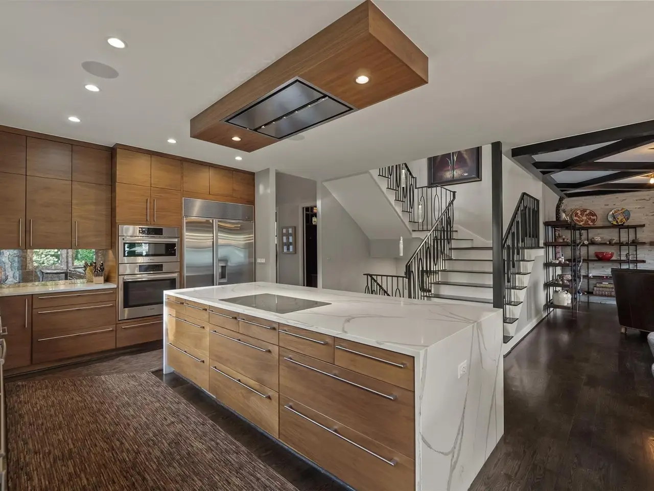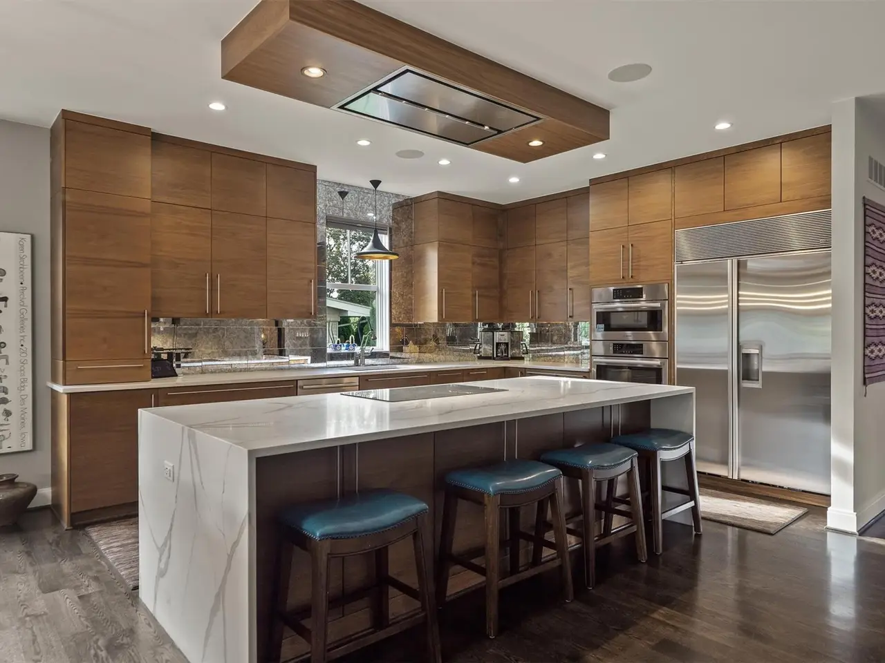 Gourmet kitchen with quartz waterfall island