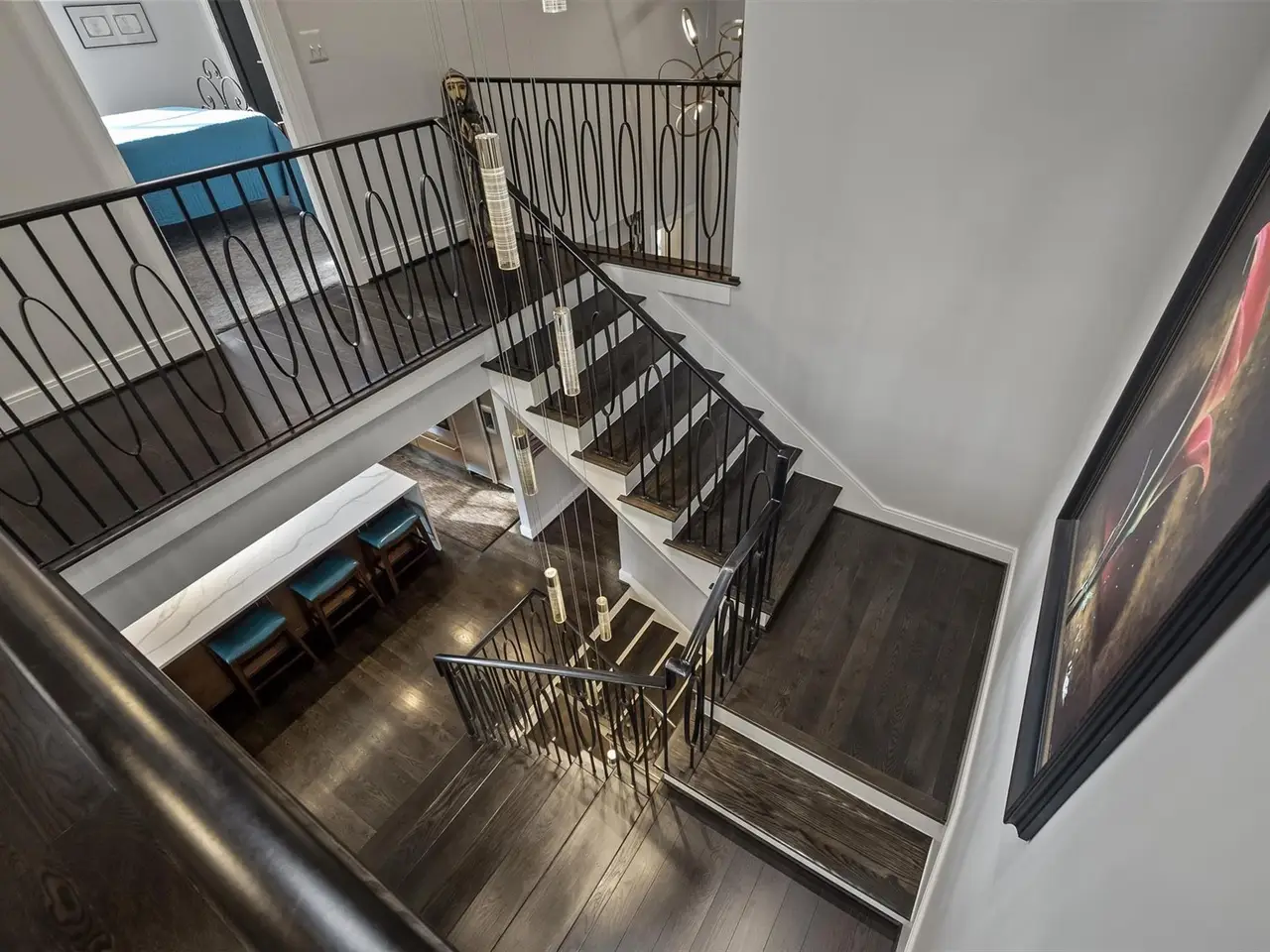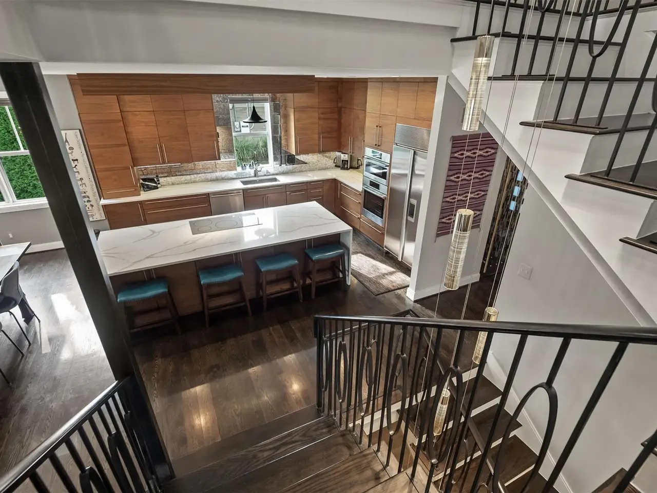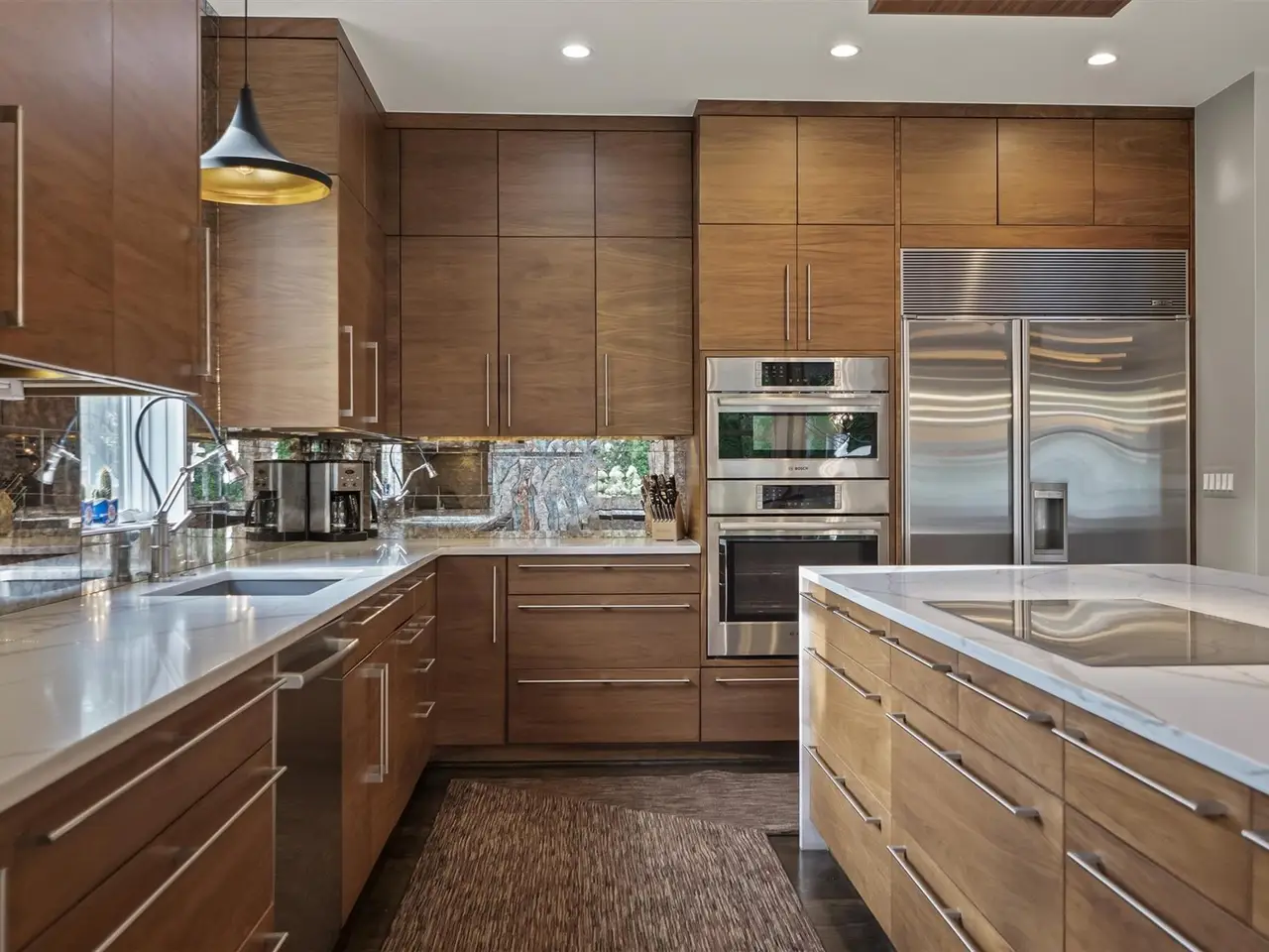 Gourmet kitchen with quartz waterfall island