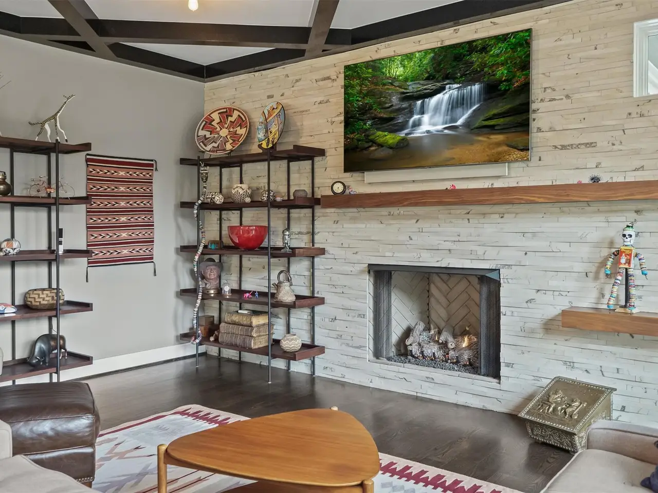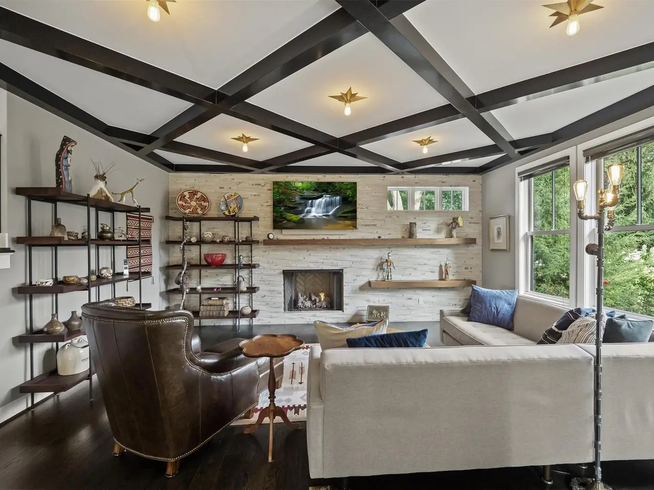 Living room with coffered ceiling and stone wall fireplace
