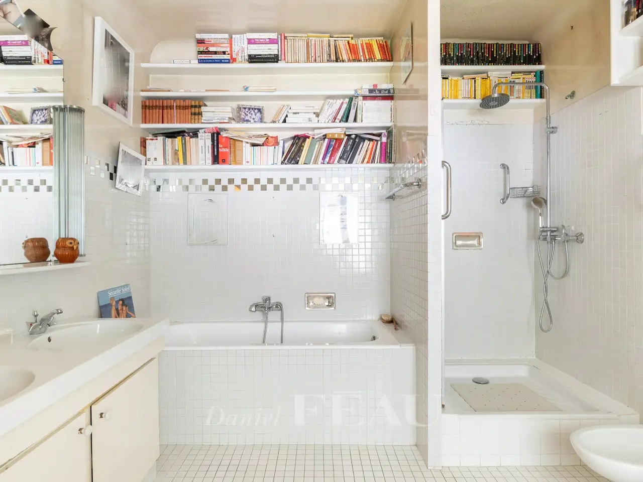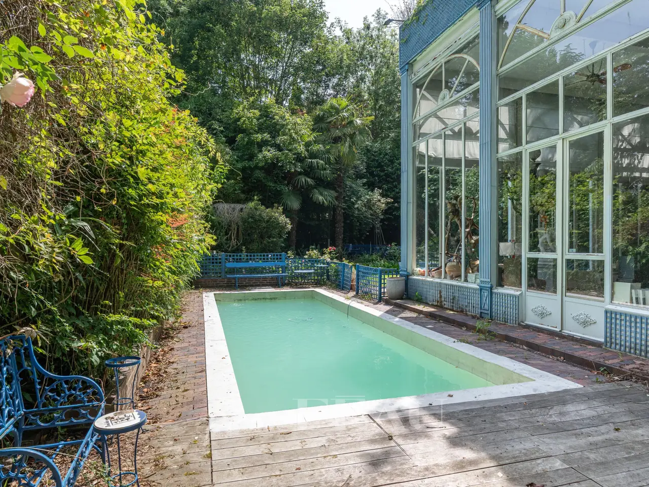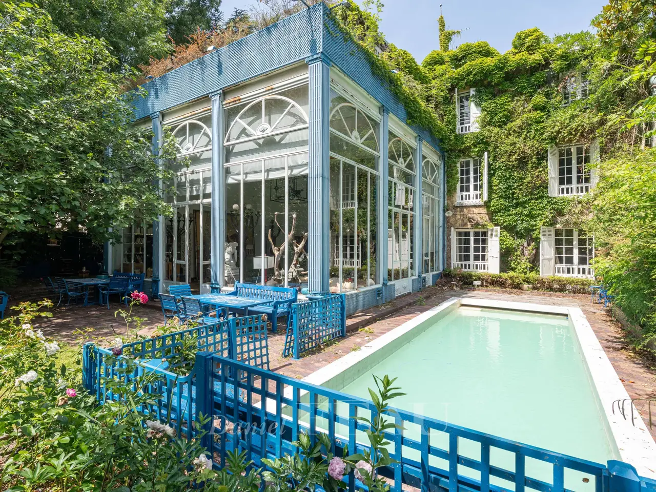 This elegant 1920s property boasting superb preserved period features is set in a leafy environment a stone’s throw from saint Cloud Golf Course. A vestibule or study leads to a 78 sqm living/reception room, a dining room, a kitchen, and a stunning 83 sqm conservatory bathed in sunshine and opening onto the landscaped garden and the swimming pool. Upstairs a landing leads to a spacious master suite with a bathroom and dressing room, three further bedrooms and two bathrooms. The top floor comprises a 63 sqm terrace. A split-level apartment adjacent to the main house comprises a living room with a kitchen, and a bedroom with a bathroom. With two staff bedrooms, a boiler room, a storage room and a garage. The ensemble comprises two distinct areas (one 444 sqm, the second 106 sqm) and division would be possible.