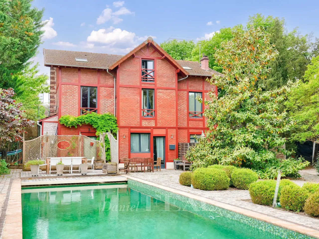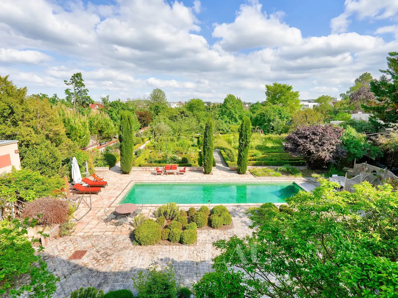 This historic late 19th century property benefiting from 21st century comfort is set in 6151 sqm of landscaped grounds planted with centennial trees and with a 15 x 4.5 metre swimming pool, a tennis court and a boules pitch. Renovated between 2010 and 2015, it offers a total of about 500 sqm of living space plus basements. The near 340 sqm main house includes a spacious “L” shaped living/reception room with a fireplace, a rotunda reading area, a dining room and a kitchen with dining facilities. All open onto a wide south-facing terrace. Upstairs are an air-conditioned master bedroom opening onto a terrace commanding a superb view of the formal French garden featuring a listed rose garden, a bathroom, a shower room, a dressing room and two studies (or two possible bedrooms). The top floor comprises an air-conditioned bedroom, a bathroom, and two further bedrooms with a shower room. The near 90 sqm basement comprises a utility room, a home cinema with a music area, an air-conditioned wine cellar and a storage room. In the garden, a near 120 sqm annex is currently divided into guest and caretaker’s accommodation. By the tennis court a near 35 sqm orangery comprises a living room with a kitchen area, a separate bedroom and a shower room. With several parking spaces. A unique opportunity in a convenient location near la Defense, the A86 and A14 motorways and 35 minutes from Orly and CDG airports.
