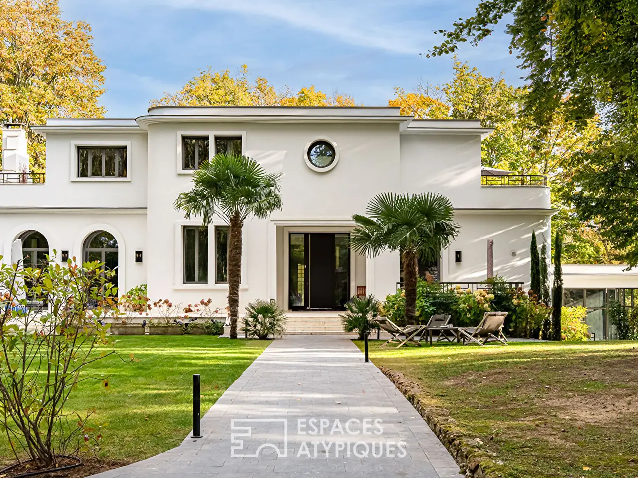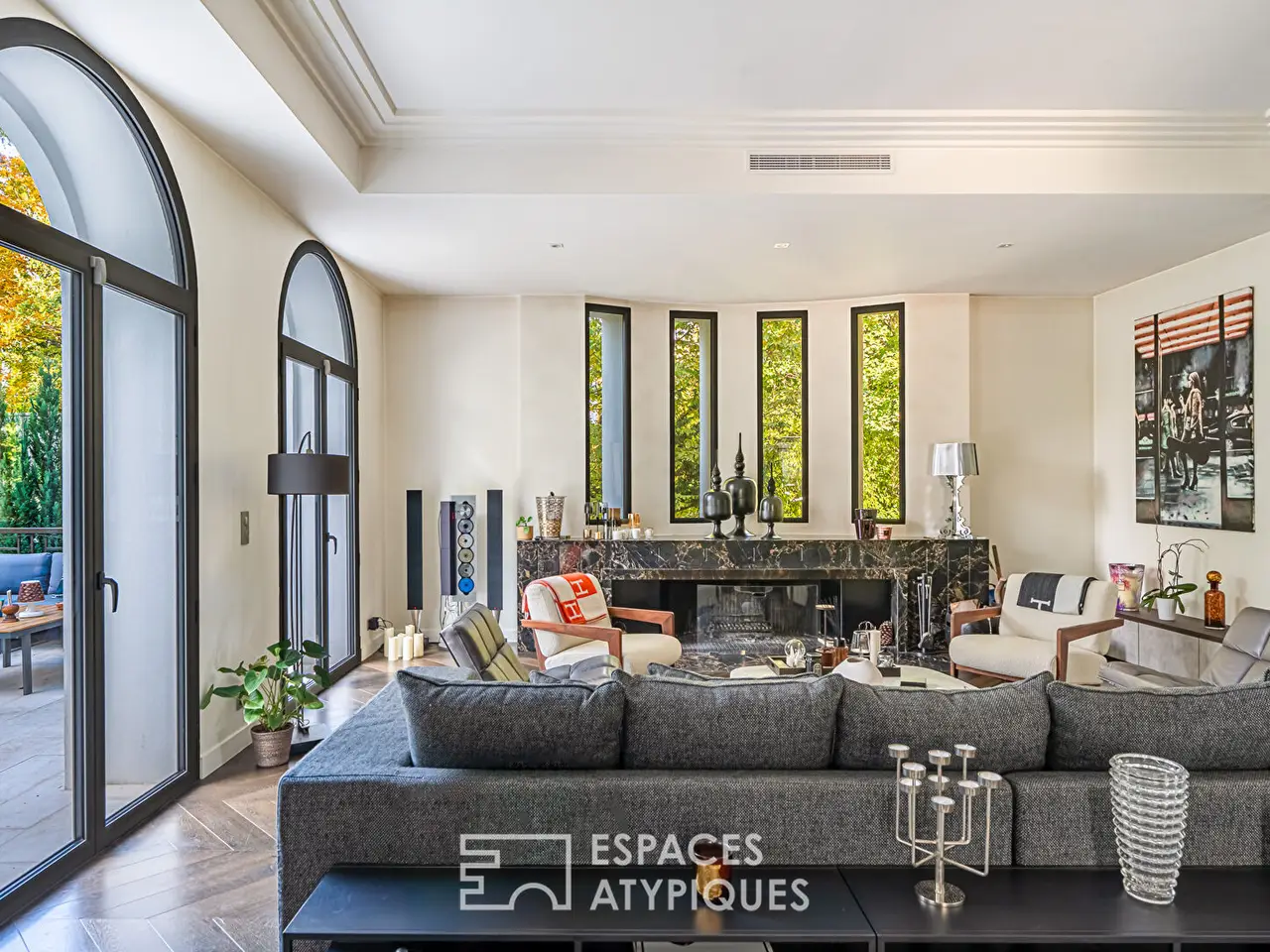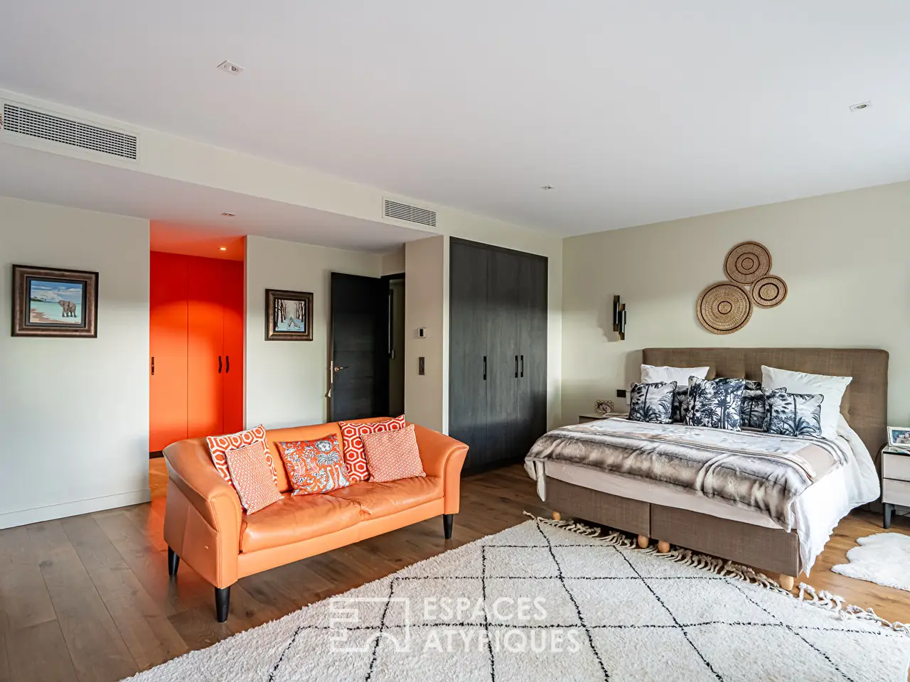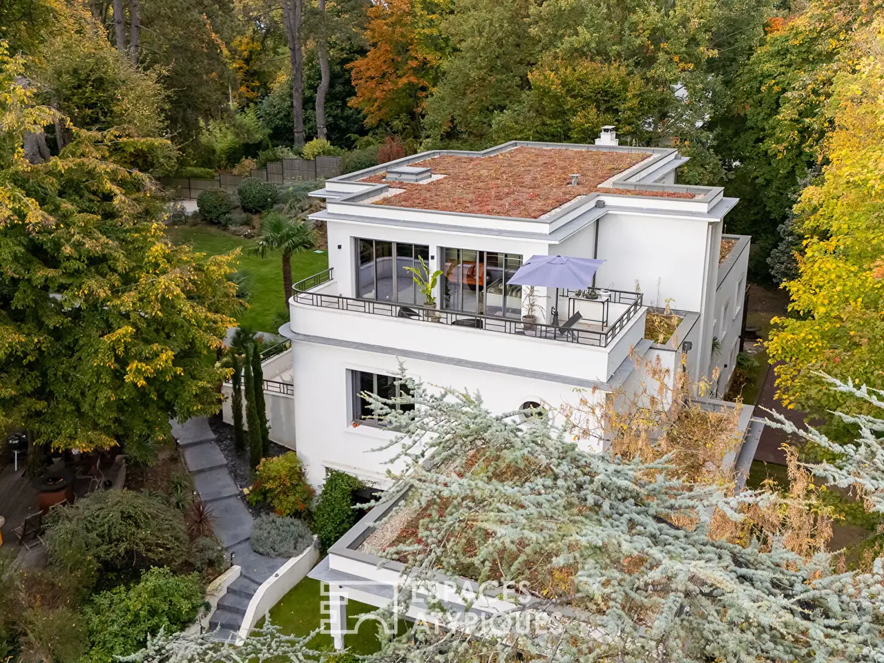 Just minutes from the center of Rueil-Malmaison, nestled in the highly sought-after Hameau de la Jonchere, a private and secure estate bordered by the Saint-Cucufa forest, this exceptional residence offers a rare living experience: that of a contemporary home where refinement blends with the serenity of nature. Behind its discreet gate, the house reveals itself in a refined and contemporary architecture, bathed in light. Its immaculate facades, highlighted by modern lines and generous openings, blend with a verdant garden punctuated by palm trees and mature species. An elegant paved driveway guides the eye to a majestic entrance, while an intimate terrace invites relaxation. The harmony between the building and nature creates an atmosphere of tranquility and rare refinement. Inside, the volumes unfold gracefully. The 80 sqm reception area opens onto large bay windows that let in light and the surrounding nature. The marble fireplace is its vibrant heart, bringing family and friends together in a warm atmosphere. A high-end contemporary 33 sqm kitchen, designed as a living space, where aesthetics and functionality blend in an open, elegant, and welcoming space, while the chosen materials-dekton, wood, and sculptural pendant lights demonstrate the attention to detail and quality of the finishes. A utility room has been designed to combine practicality and discretion. A laundry room, cloakroom, and guest toilet complete this level. Upstairs, the master suite opens onto a private terrace, a custom-made dressing room, and a refined bathroom with a walk-in shower. Two other bedrooms, each with their own shower room or bathroom, one of which has a terrace, make up this intimate level. The garden level, designed for well-being and conviviality, houses a gym, a cinema room, a wellness area with sauna and hammam, a swimming pool with counter-current swimming whose large bay windows open entirely onto the garden to form a single space. An independent apartment of 35 sqm, perfect for receiving or accommodating guests, completes these services. A unique place, where contemporary comfort dialogues with nature, designed for those seeking beauty, calm and fluidity of life. in the immediate vicinity of major roads and the best international schools. Access A86, A13: 3 min EIB de la Jonchere: 5 min walk, Danielou, Passy Buzenval, Lycee International de Saint-Germain-en-Laye. REF. 13376 Additional information * 9 rooms * 5 bedrooms * 2 bathrooms * 3 shower rooms * 1 floor in the building * Outdoor space : 3047 SQM * Parking : 3 parking spaces * Property tax : 5 500 € Energy Performance Certificate Primary energy consumption b : 103 kWh/m2.year High performance housing