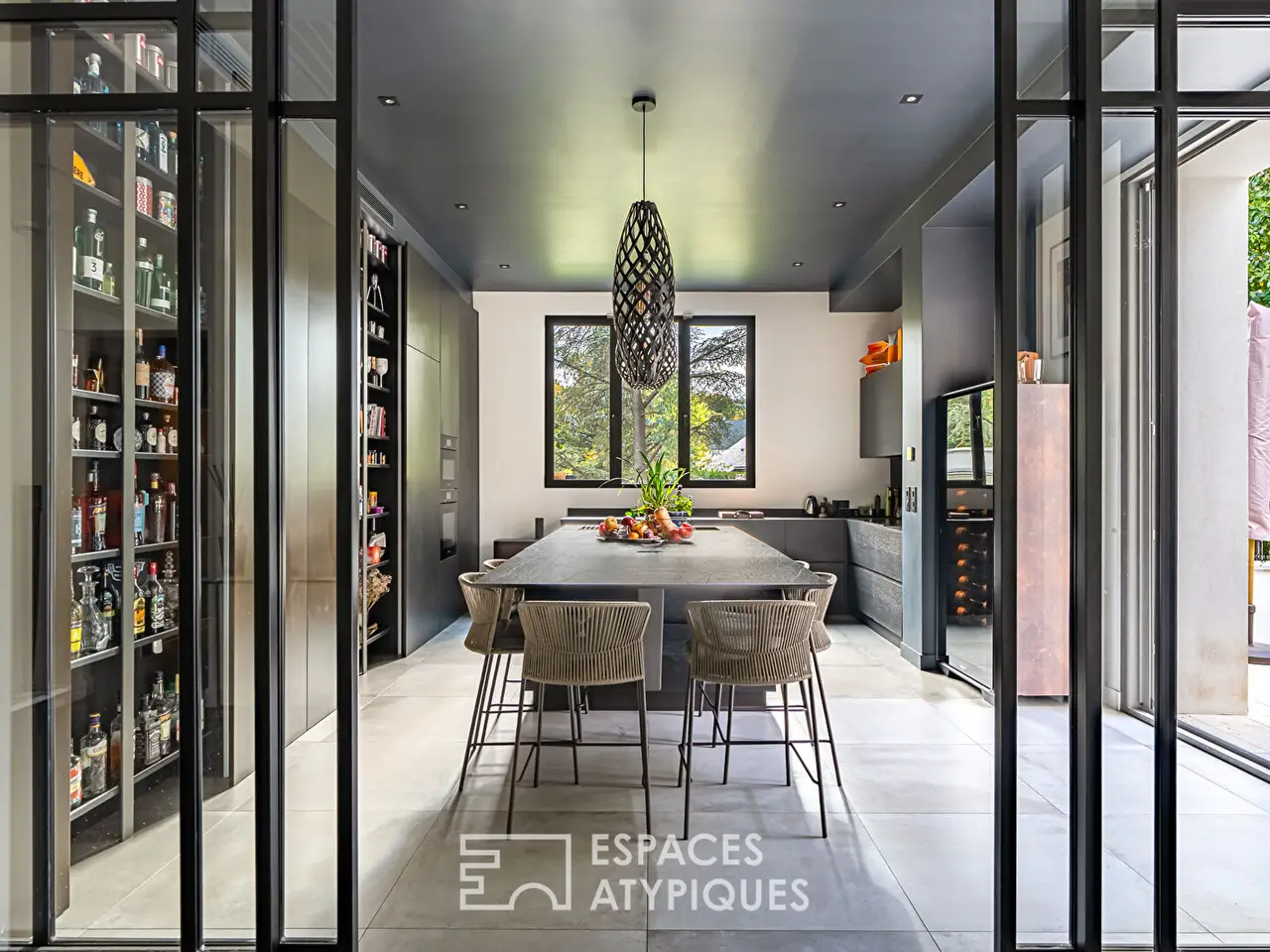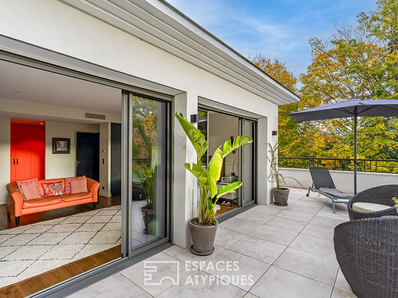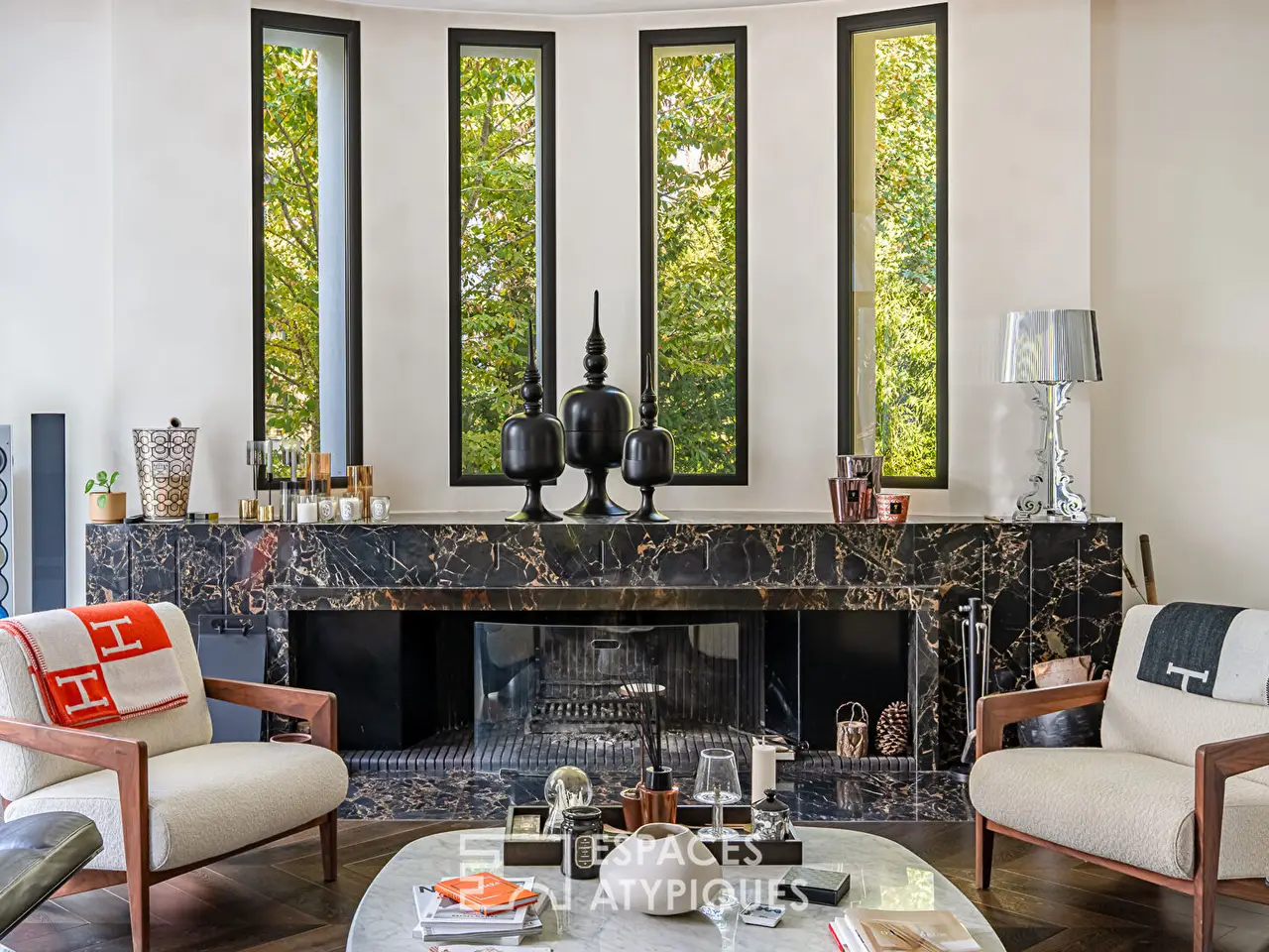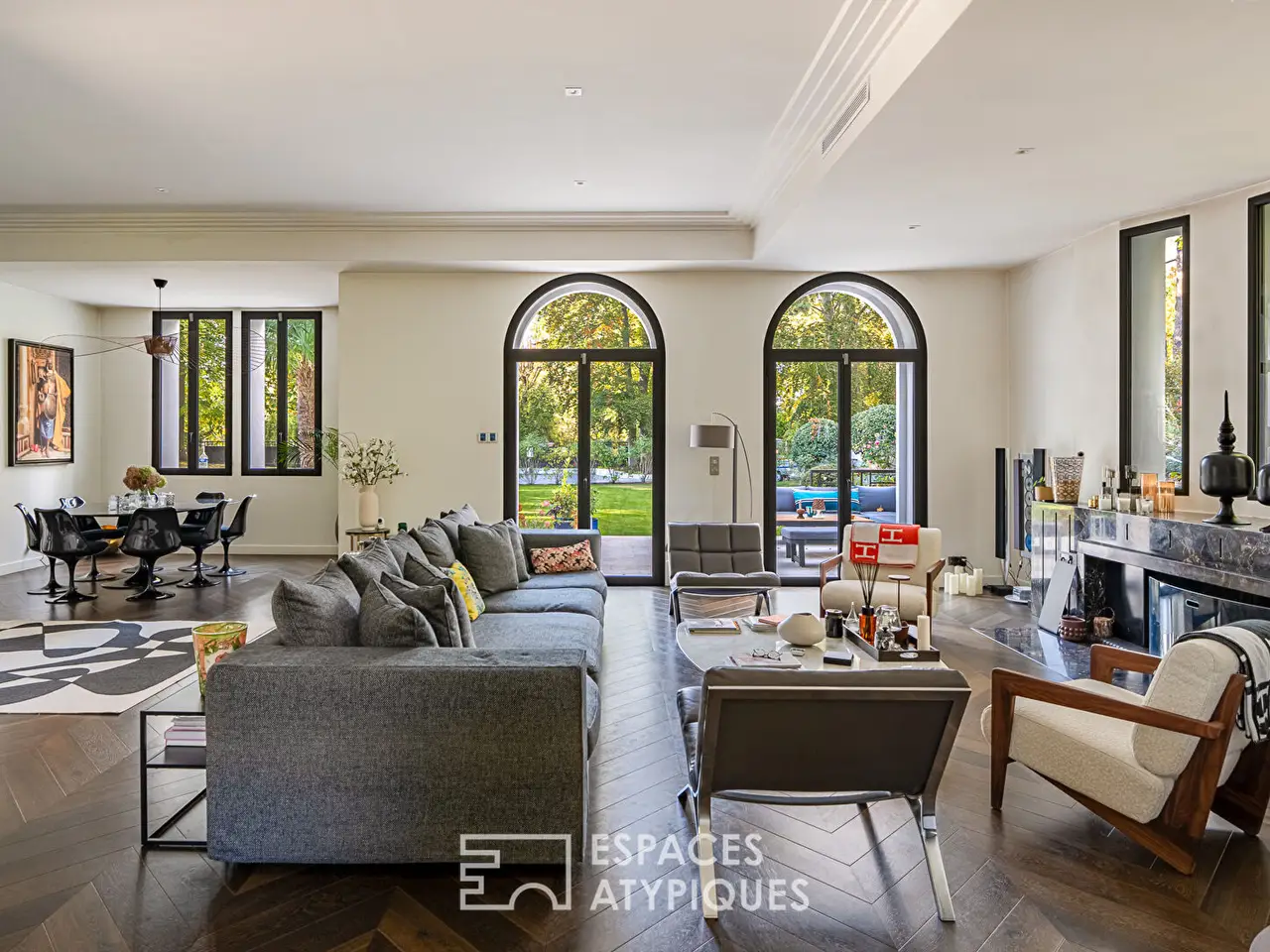 Just minutes from the center of Rueil-Malmaison, nestled in the highly sought-after Hameau de la Jonchere, a private and secure estate bordered by the Saint-Cucufa forest, this exceptional residence offers a rare living experience: that of a contemporary home where refinement blends with the serenity of nature. Behind its discreet gate, the house reveals itself in a refined and contemporary architecture, bathed in light. Its immaculate facades, highlighted by modern lines and generous openings, blend with a verdant garden punctuated by palm trees and mature species. An elegant paved driveway guides the eye to a majestic entrance, while an intimate terrace invites relaxation. The harmony between the building and nature creates an atmosphere of tranquility and rare refinement. Inside, the volumes unfold gracefully. The 80 sqm reception area opens onto large bay windows that let in light and the surrounding nature. The marble fireplace is its vibrant heart, bringing family and friends together in a warm atmosphere. A high-end contemporary 33 sqm kitchen, designed as a living space, where aesthetics and functionality blend in an open, elegant, and welcoming space, while the chosen materials-dekton, wood, and sculptural pendant lights demonstrate the attention to detail and quality of the finishes. A utility room has been designed to combine practicality and discretion. A laundry room, cloakroom, and guest toilet complete this level. Upstairs, the master suite opens onto a private terrace, a custom-made dressing room, and a refined bathroom with a walk-in shower. Two other bedrooms, each with their own shower room or bathroom, one of which has a terrace, make up this intimate level. The garden level, designed for well-being and conviviality, houses a gym, a cinema room, a wellness area with sauna and hammam, a swimming pool with counter-current swimming whose large bay windows open entirely onto the garden to form a single space. An independent apartment of 35 sqm, perfect for receiving or accommodating guests, completes these services. A unique place, where contemporary comfort dialogues with nature, designed for those seeking beauty, calm and fluidity of life. in the immediate vicinity of major roads and the best international schools. Access A86, A13: 3 min EIB de la Jonchere: 5 min walk, Danielou, Passy Buzenval, Lycee International de Saint-Germain-en-Laye. REF. 13376 Additional information * 9 rooms * 5 bedrooms * 2 bathrooms * 3 shower rooms * 1 floor in the building * Outdoor space : 3047 SQM * Parking : 3 parking spaces * Property tax : 5 500 € Energy Performance Certificate Primary energy consumption b : 103 kWh/m2.year High performance housing