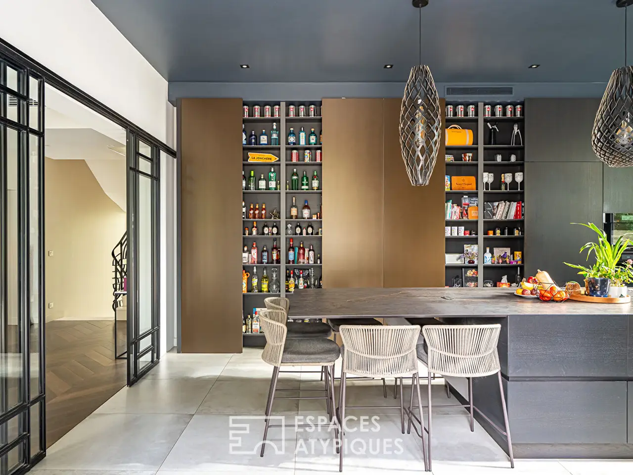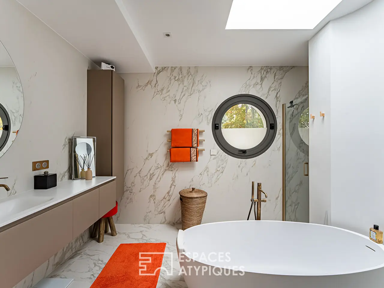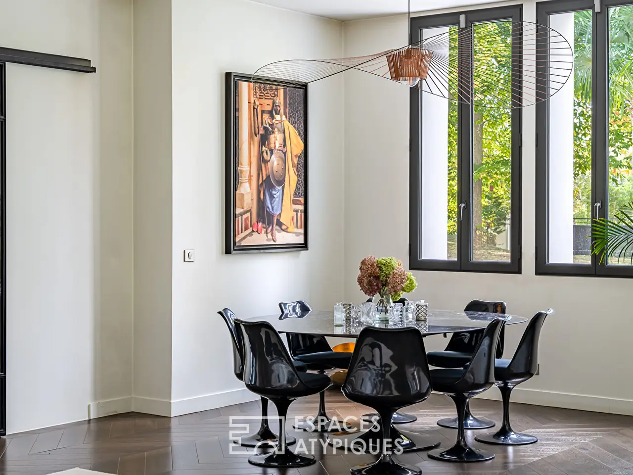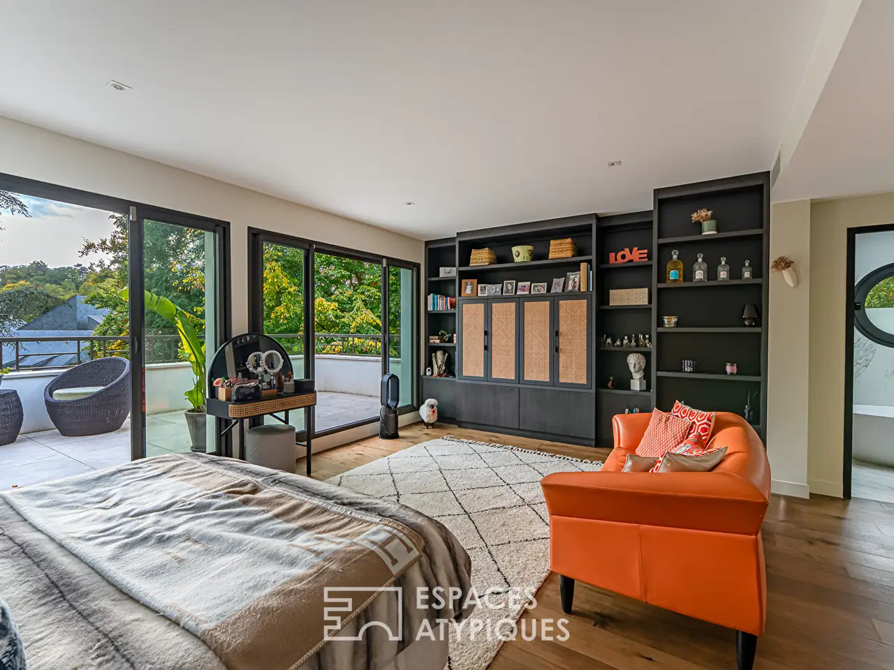 Just minutes from the center of Rueil-Malmaison, nestled in the highly sought-after Hameau de la Jonchere, a private and secure estate bordered by the Saint-Cucufa forest, this exceptional residence offers a rare living experience: that of a contemporary home where refinement blends with the serenity of nature. Behind its discreet gate, the house reveals itself in a refined and contemporary architecture, bathed in light. Its immaculate facades, highlighted by modern lines and generous openings, blend with a verdant garden punctuated by palm trees and mature species. An elegant paved driveway guides the eye to a majestic entrance, while an intimate terrace invites relaxation. The harmony between the building and nature creates an atmosphere of tranquility and rare refinement. Inside, the volumes unfold gracefully. The 80 sqm reception area opens onto large bay windows that let in light and the surrounding nature. The marble fireplace is its vibrant heart, bringing family and friends together in a warm atmosphere. A high-end contemporary 33 sqm kitchen, designed as a living space, where aesthetics and functionality blend in an open, elegant, and welcoming space, while the chosen materials-dekton, wood, and sculptural pendant lights demonstrate the attention to detail and quality of the finishes. A utility room has been designed to combine practicality and discretion. A laundry room, cloakroom, and guest toilet complete this level. Upstairs, the master suite opens onto a private terrace, a custom-made dressing room, and a refined bathroom with a walk-in shower. Two other bedrooms, each with their own shower room or bathroom, one of which has a terrace, make up this intimate level. The garden level, designed for well-being and conviviality, houses a gym, a cinema room, a wellness area with sauna and hammam, a swimming pool with counter-current swimming whose large bay windows open entirely onto the garden to form a single space. An independent apartment of 35 sqm, perfect for receiving or accommodating guests, completes these services. A unique place, where contemporary comfort dialogues with nature, designed for those seeking beauty, calm and fluidity of life. in the immediate vicinity of major roads and the best international schools. Access A86, A13: 3 min EIB de la Jonchere: 5 min walk, Danielou, Passy Buzenval, Lycee International de Saint-Germain-en-Laye. REF. 13376 Additional information * 9 rooms * 5 bedrooms * 2 bathrooms * 3 shower rooms * 1 floor in the building * Outdoor space : 3047 SQM * Parking : 3 parking spaces * Property tax : 5 500 € Energy Performance Certificate Primary energy consumption b : 103 kWh/m2.year High performance housing
