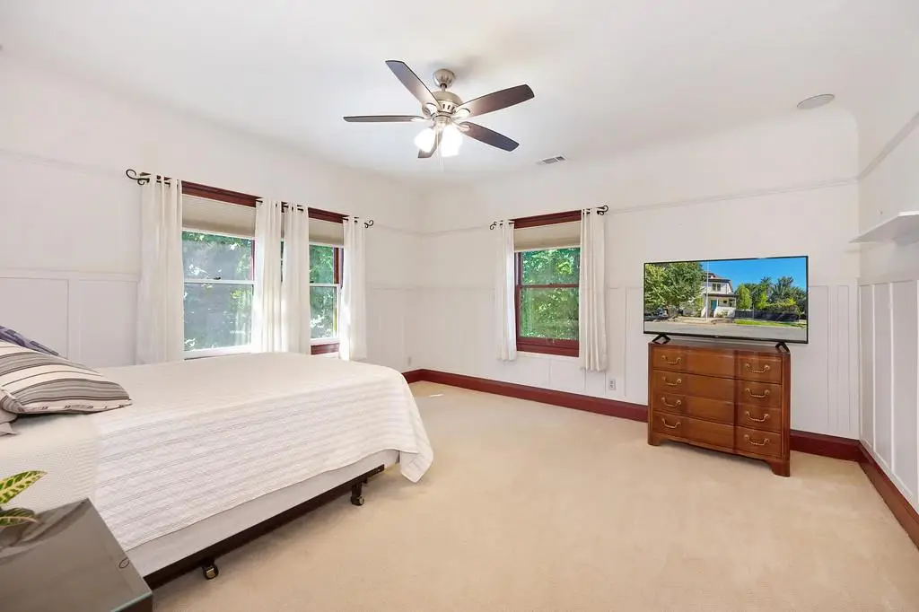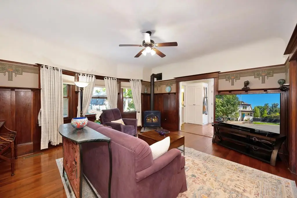 Gorgeous 1912 craftsman home in Mansion Flats w/ period details on huge corner lot updated for modern living. Gracious entry w/ wrap-around porch leads to an open floor plan w/ cove ceilings, Bradbury wallpaper, timeless wainscoting and original wood floors. The front parlor w/ corner window seat opens to a den w/ cozy gas stove and bay window. The formal dining room has wood clad beamed ceilings w/ service window into a stylish chef's kitchen w/ quartz counters, stainless steel appliances, gas range and abundant storage. Off the kitchen is an enormous deck for social gatherings. A grand stairway leads upstairs to the main bedroom w/ remodeled en-suite bath and walk in shower. Two guest bedrooms share an updated guest bath including dual vanity and claw foot tub under stained glass windows. The remodeled lower level provides a large in-law suite w/ private entry. The large side yard is a park-like setting w/ driveway and pedestrian gates, custom iron fence, storage shed, mature orange trees, raised planter bed, flagstone patio and bocce ball court under a grape vine covered pergola. Energy updates include custom dual pane windows, two zone HVAC, and a tankless water heater. Centrally located w/ walking distance to light rail, parks, shopping, restaurants and entertainment.