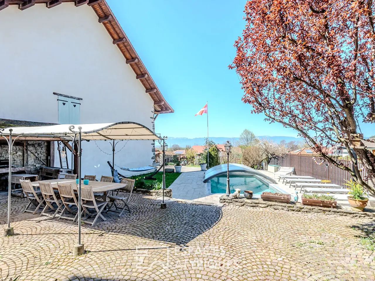 This 12th-century chateau and its many outbuildings are located in Saint-Cergues, less than 30 minutes from the center of Geneva, or 40 minutes by direct train from Machilly station.Its main house offers more than 160 sqm of living space, on a 1325 sqm plot of land with a swimming pool and 2 large paved terraces.2 independent apartments of approximately 50 sqm and 57 sqm respectively, fully renovated in 2023 and 2024, generate annual rental income (1-year furnished leases), and numerous additional outbuildings allow for all possibilities (gross barn of more than 73 sqm on the ground, double garage of more than 50 sqm, tasting cellar, laundry room, pantry, workshop, chicken coop).When the door of the main house opens, it is all the charm of past centuries that makes the eye sparkle. The French ceilings, the walls revealing the period stones, the solid flooring in the upper floors, and of course the medieval fireplace, a majestic witness of past centuries.The kitchen, dining room and living room blend harmoniously in this living room of almost 75 sqm, entirely open and convivial.A bathroom, with a freestanding bathtub and toilet, completes this level.On the 1st floor, in the castle tower, there is a spacious bedroom extended by a private relaxation area fitted out with a sauna. A shower room completes this level.The 2nd floor offers 2 bedrooms and an office room (now converted into a children's playroom around the exposed ridge of the tower).The exteriors are also spacious and fully furnished: 2 large paved terraces allow you to play with the ideal sunshine that the place benefits from.The first is directly accessible from the kitchen and offers a view of the lake and the Jura mountain range; the second is right next to the swimming pool, allowing you to enjoy the conviviality of the place in the summer season.The heated swimming pool, perfectly maintained, is equipped with a shelter for optimized heating and more safety, as well as a solar shower.The adjoining barn, with more than 73 sqm on the ground and a height of approximately 15m at the ridge, allows you to consider all projects: exceptional storage space or for the more daring, an additional outbuilding to meet all desires: private apartments to accommodate family and friends, independent office for the exercise of a liberal activity, gym, relaxation area.A large double garage allowing to accommodate 2 vehicles in a row, a tasting cellar, a workshop, a storeroom, a technical room with laundry room, a garden shed formerly used as a chicken coop, a wood-fired oven complete the list of the many assets that this exceptional property offers.Major works have been carried out to considerably improve the comfort of life and reduce energy costs. These include the roofs and insulation of the main house and the barn, the installation of a heat pump supplying the main house and the 2 apartments, a second heat pump for the swimming pool, the replacement of the skylights, the lime smoothing of the facade of the castle, to name only the most expensive works.Finally, fiber is installed in the house and apartments for optimal comfort.Only 5 minutes from the Renfile customs and less than 30 minutes from the Pont du Mont-Blanc in Geneva, its prime location will appeal to lovers of exceptional properties offering numerous additional development possibilities.Additional photos and complete file available on request.ENERGY CLASS: C / CLIMATE CLASS: A Estimated average amount of annual energy expenditure for standard use, established from energy prices for the years 2021, 2022 and 2023: between 1460 Euros and 2020 Euros.Information on the risks to which this property is exposed is available on the Georisques website: www.georisques.gouv.fr.REF. 1957EAAdditional information* 10 rooms* 6 bedrooms* 1 bathroom