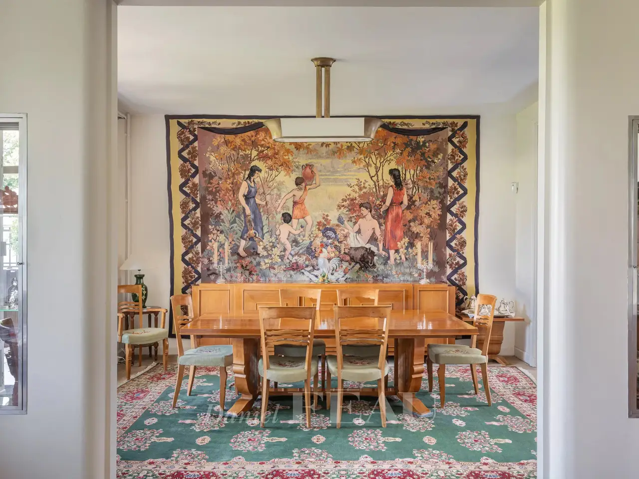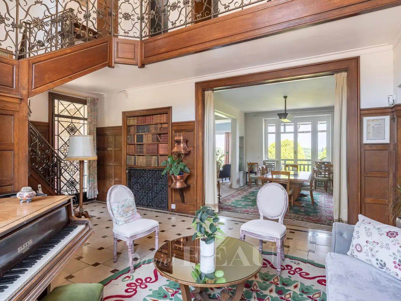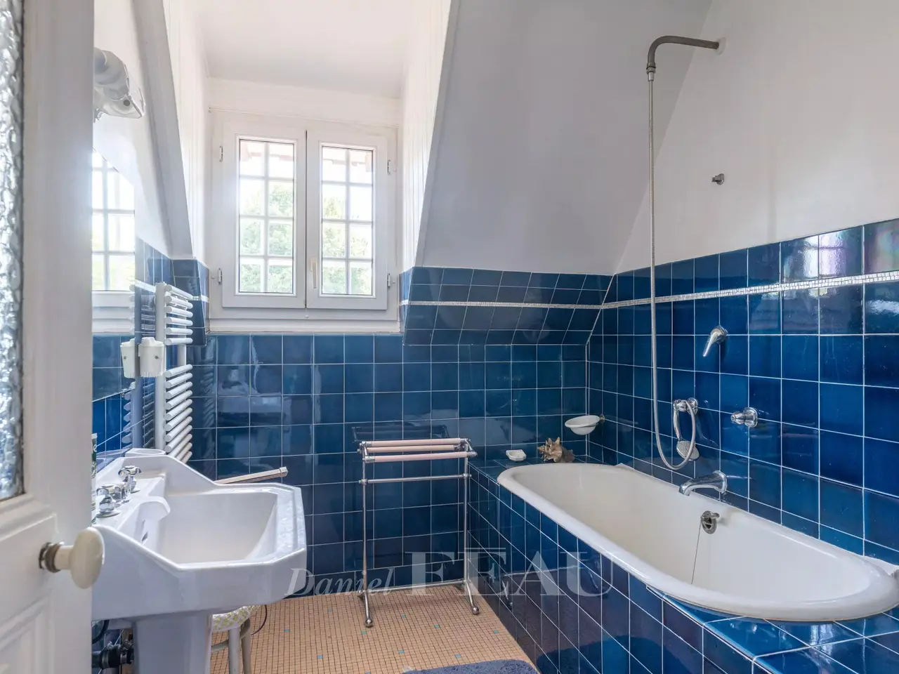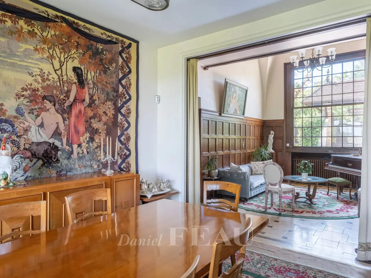 Val d’Or neighbourhood. This early 20th century Anglo-Norman style property is in one of Saint-Cloud’s most sought-after streets a stone’s throw from the station. Entirely decorated by renowned interior decorator Jules Leleu, it includes a spacious entrance hall, a triple living/reception room bathed in sunshine and overlooking the landscaped garden benefiting from an open view of the Bois de Boulogne and the Eiffel Tower, a spacious kitchen, a study, and a bedroom with a bathroom. Upstairs are three further bedrooms (two opening onto a balcony), and two bathrooms. On a basement with a self-contained 31 sqm studio apartment. With a near 100 sqm annex comprising a 3-room apartment, a 35 sqm recreation room and a double garage.