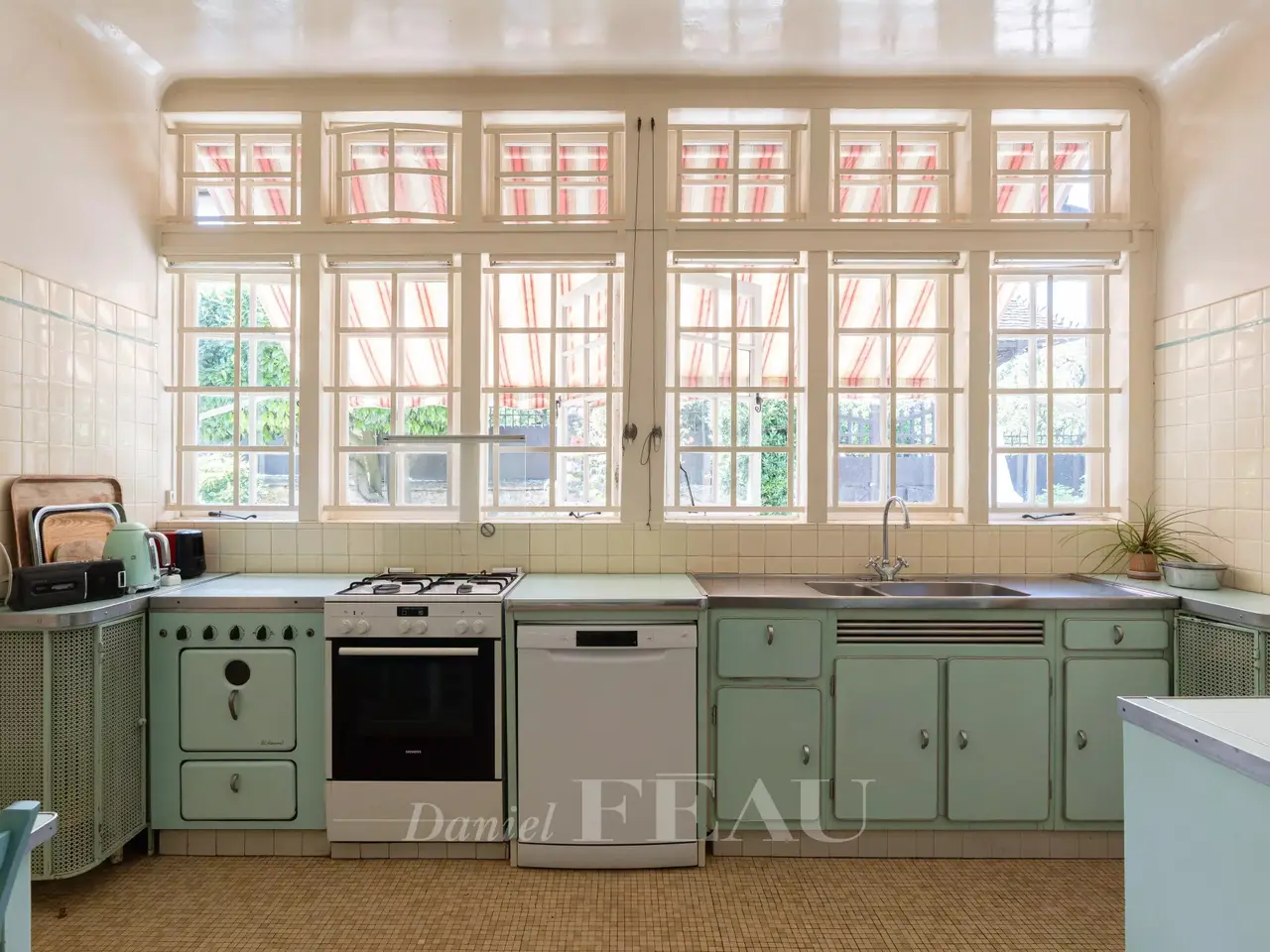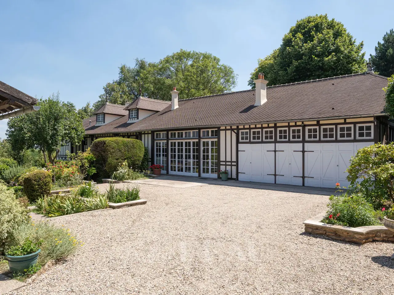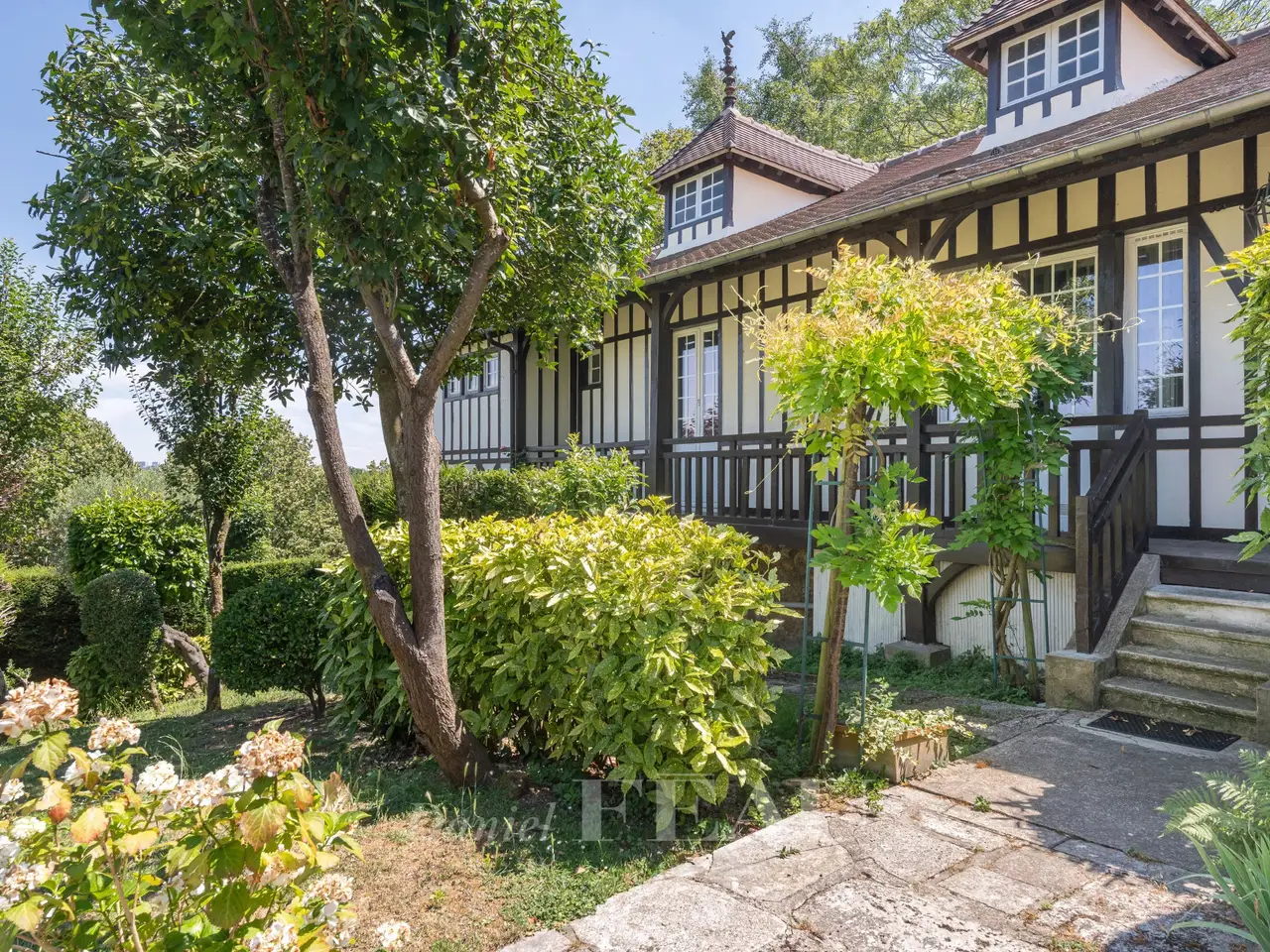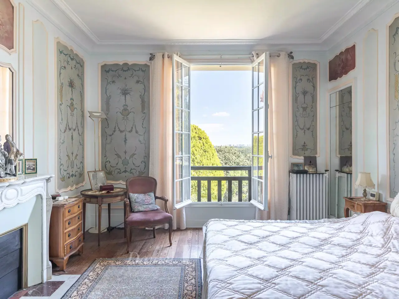 Val d’Or neighbourhood. This early 20th century Anglo-Norman style property is in one of Saint-Cloud’s most sought-after streets a stone’s throw from the station. Entirely decorated by renowned interior decorator Jules Leleu, it includes a spacious entrance hall, a triple living/reception room bathed in sunshine and overlooking the landscaped garden benefiting from an open view of the Bois de Boulogne and the Eiffel Tower, a spacious kitchen, a study, and a bedroom with a bathroom. Upstairs are three further bedrooms (two opening onto a balcony), and two bathrooms. On a basement with a self-contained 31 sqm studio apartment. With a near 100 sqm annex comprising a 3-room apartment, a 35 sqm recreation room and a double garage.