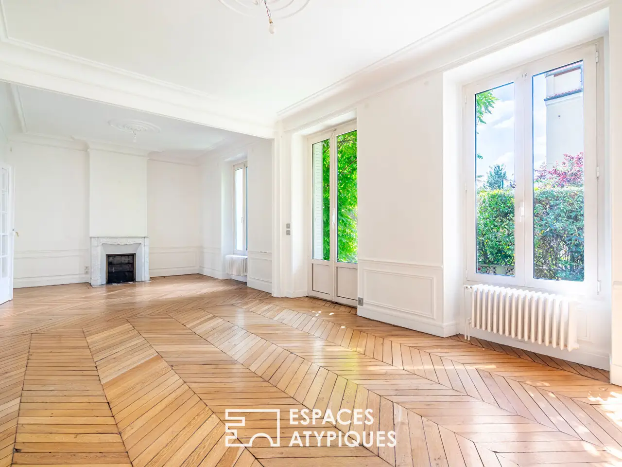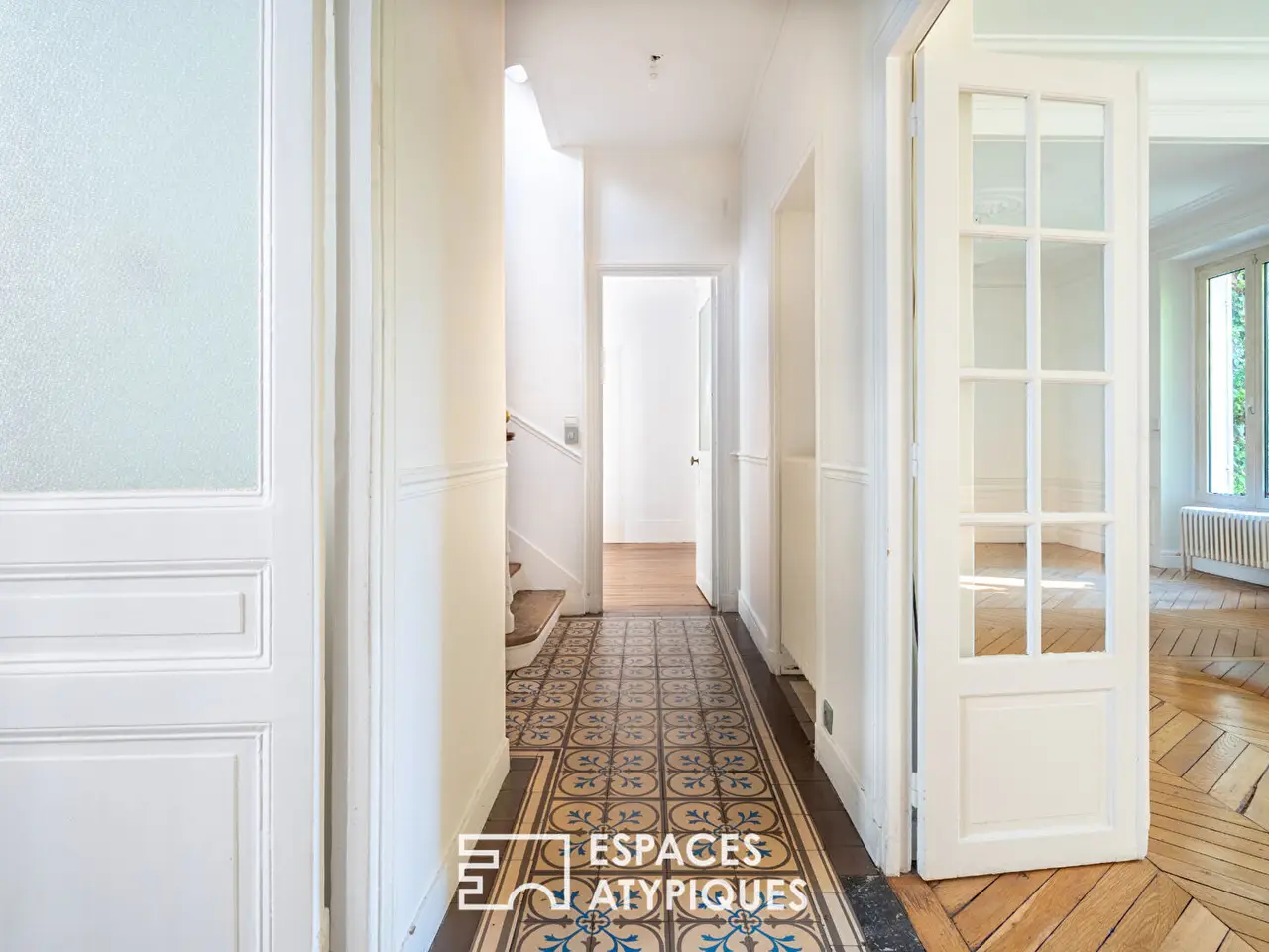 Nestled in the heart of Saint-Mande, in one of its most pristine corners, is this discreet residence, hidden from view. Accessed via a porch shared with only one other house, it is part of a small, confidential, almost family-oriented, almost secretive condominium where peace and quiet seem to be suspended. Behind the front door, from the very first steps, the charm of the old is evident. The period tiles tell a story, that of a house of character where every detail counts. On the left, the perfectly laid-out and independent kitchen combines functionality and simplicity. A vast living room bathed in light, where the herringbone parquet flooring, elegant moldings, and antique fireplace create a warm and cozy atmosphere. A few steps further down, a 74 sqm garden extends the living room. A green setting, rare in these places, where time seems to slow down. The dining room, adjoining the living room and also accessible from the entrance hall, completes this living space of approximately 50 sqm. Here, the volumes interact with the light, the noble materials with intimacy. A first toilet completes this level. The period staircase, in wood patinated by the years, leads to the first floor. Three bedrooms are located there, including a sumptuous master suite. The latter has its own balcony, a generously equipped bathroom (bathtub, shower, double sink) and a very special atmosphere, where serenity reigns. An additional room, ideal for an office, a baby's room or a custom-made dressing room, completes this floor, accompanied by a separate shower room and a toilet. Under the roof, the top floor accommodates two attic bedrooms with generous volumes, bathed in light, as well as a third bathroom with toilet. A space full of potential, where one can easily imagine a space dedicated to teenagers, friends or creation. Finally, a basement of approximately 60 sqm accommodates a laundry room, a boiler room, a launderette and a workshop. So many additional spaces that intelligently meet everyday needs. Unique and rare, this house gracefully combines the elegance of the old, modern comfort and a rare tranquility at the gates of Paris. A village life with Haussmannian accents, a timeless interlude just a stone's throw from the capital. Saint-Mande metro station: 15 minutes on foot Shops: 4 minutes on foot Notre Dame de Saint Mande school: 3 minutes on foot REF. 11268 Additional information * 7 rooms * 6 bedrooms * 2 floors in the building * Outdoor space : 74 SQM * 2 co-ownership lots * Property tax : 4 175 € * Proceeding : Non Energy Performance Certificate Primary energy consumption e : 309 kWh/m2.year High performance housing
