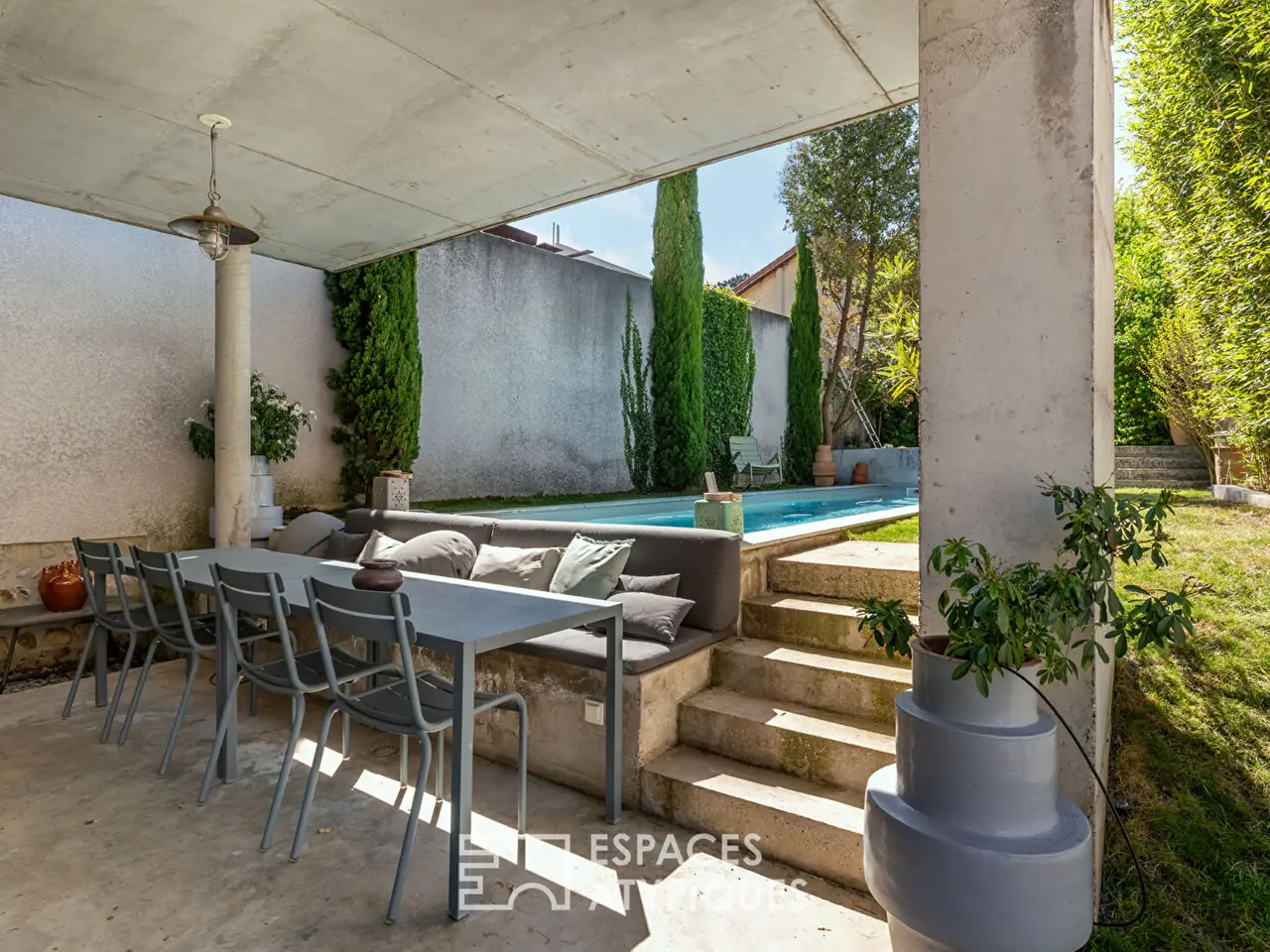 Nestled in the sought-after hypercenter of Sainte-Foy, a stone's throw from all amenities and just minutes from Lyon, this approximately 200sqm townhouse has undergone a complete and meticulous renovation by an architect. Behind a discreet facade hides a true haven of light and design. From the entrance, the charm works: the living room, designed as a contemporary extension, generously opens to the exterior thanks to large openings that bathe the space in natural light at all hours of the day. The raw and graphic concrete formwork ceiling gives the whole a resolutely modern and elegant signature. The separate kitchen with dining area adheres to the same high standards of quality and aesthetics. Designed with practicality and functionality in mind, the house offers a distinct sleeping area. Comprised of a master suite with bathroom, as well as two spacious bedrooms with shower rooms. A pleasant reading room, TV, games room completes this level according to your desires. Also, on the ground floor is a fourth independent bedroom with shower room, to meet everyone's needs. Outside, the garden extends the experience: a terrace area for sunny days, and a sublime swimming lane pool invite you to relax, in absolute calm. A laundry room as well as a garage complete this property, ideal for storage, bicycles and two-wheelers. A unique, rare and sought-after property, combining exceptional location and high-end services. ENERGY CLASS: C / CLIMATE CLASS: C Estimated average amount of annual energy expenditure for standard use, established from 2021 energy prices: between EUR910 and EUR1300 Contact: Nina 06 63 64 85 63 REF. 10630 Additional information * 6 rooms * 4 bedrooms * 3 shower rooms * Outdoor space : 170 SQM * Property tax : 2 437 € Energy Performance Certificate Primary energy consumption c : 101 kWh/m2.year High performance housing