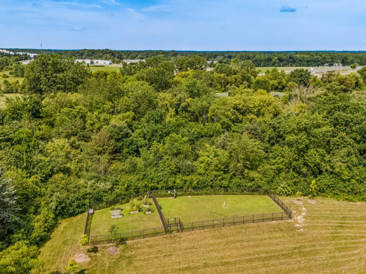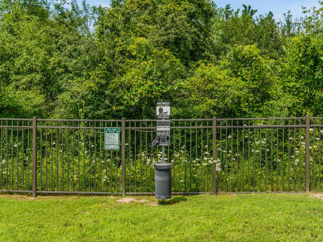 Dog play areas with fenced enclosure.