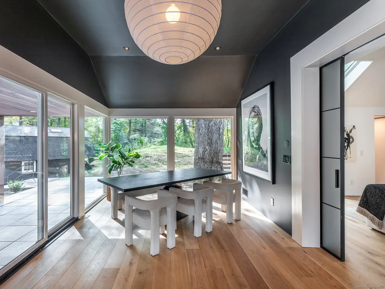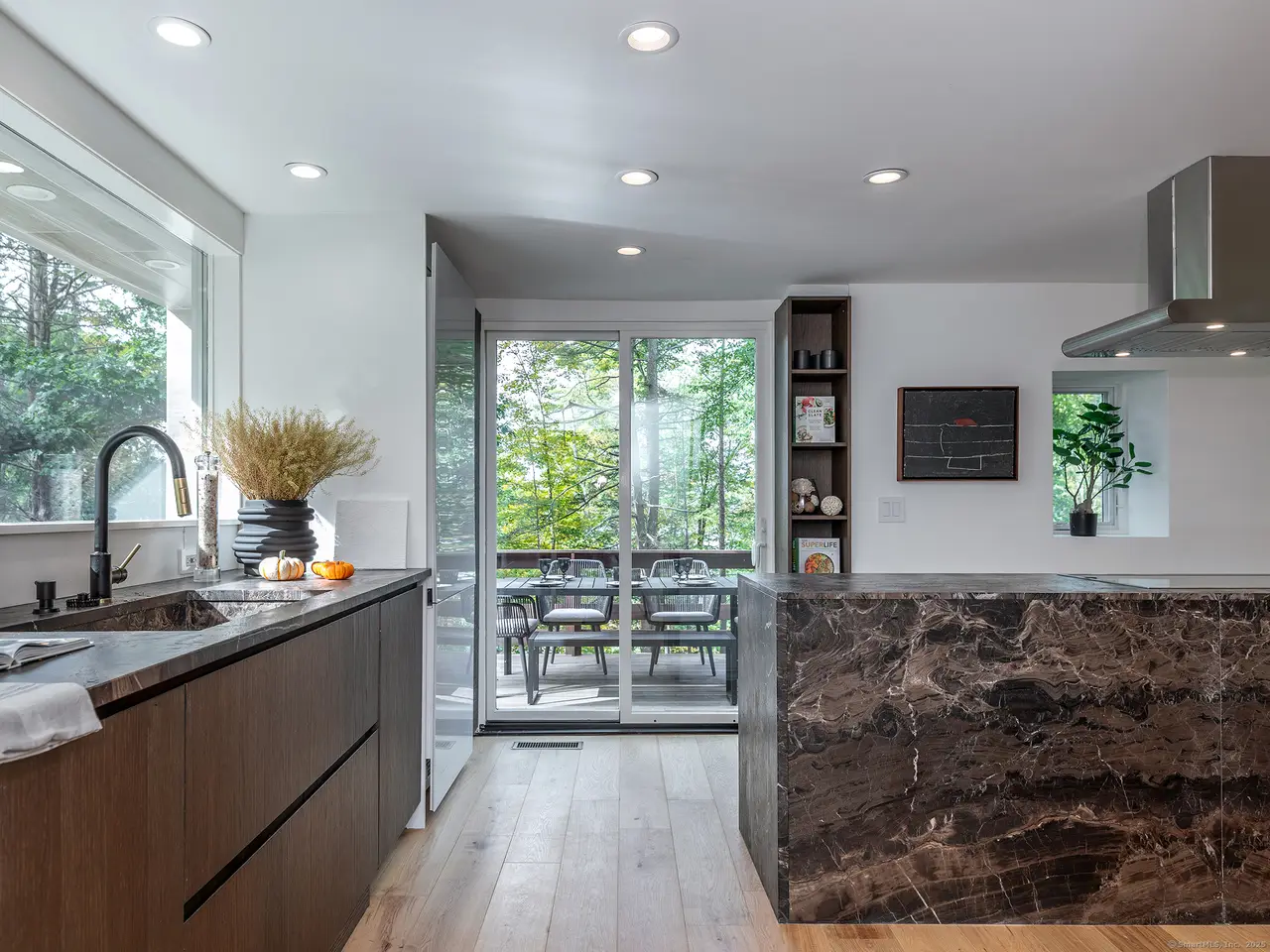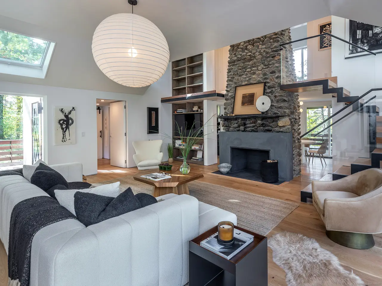 Modern Lakeside Retreat with Guest Cottage and Rooftop Terrace. Where modern European design meets the soul of New England living - welcome to this stunning, fully renovated lakeside property, composed of a sophisticated main residence, a stylish guest cottage, and a three-car garage with a rooftop garden terrace ideal for entertaining. Designed by a visionary European team, the main house features distinctive tile siding-both weather- and time-resistant-and a warm, modern aesthetic. Inside, expansive glass panels and oversized windows flood the space with light and frame views of nature from every room. At the heart of the home is the grand living room, where a soaring double-height river stone fireplace and custom oak bookcase create a breathtaking focal point. Just before the living room, an all-glass sunroom-connected by an elegant glass pocket door-offers the perfect flexible space for dining, a home office, or peaceful meditation. The modern-designed kitchen features glass and stone finishes and top-tier Gaggenau appliances.. Step outside to enjoy the wraparound deck and series of patios, all thoughtfully positioned to connect the home to its natural setting and maximize indoor-outdoor living. A sitting room reveals a beautiful private terrace overlooking the lake Wononscopomuc. The fully renovated guest cottage offers a bright open floor plan, a very large kitchen, and a spacious bedroom. Car enthusiasts will appreciate the five-car garage, while the grassy rooftop terrace above provides a stunning setting for outdoor gatherings, yoga, or sunset cocktails. Nestled in nature, yet just a short walk from downtown Lakeville, the town beach, and local restaurants.