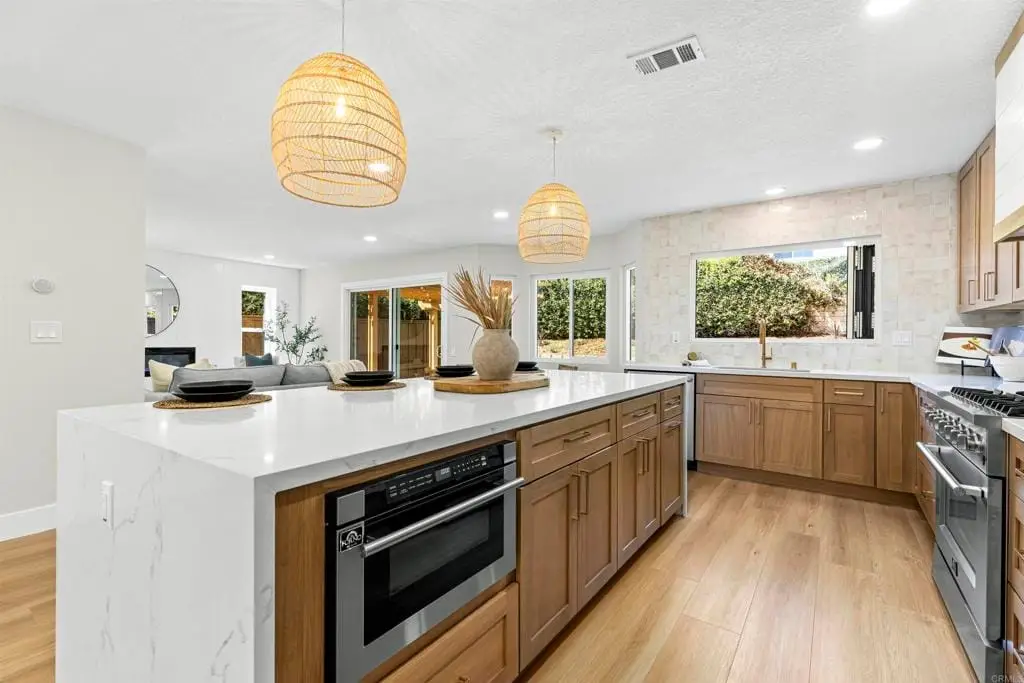Welcome to this beautifully remodeled family home, ideally situated in a quiet cul-de-sac just steps from Torrey Pines High School, ranked among the best high schools in the United States. Located in one of San Diegos most sought-after neighborhoods, this residence offers the perfect blend of luxury, convenience, and lifestyle. Enjoy unparalleled access to Del Mar Highlands Town Center, Sky Deck, One Paseo, and world-class dining at Steak 48all within walking distance. Beaches, shopping, and major freeways are just minutes away, making it effortless to reach anywhere in San Diego. Inside, no detail has been overlooked in this top-to-bottom high-end remodel. The open-concept floor plan features cantina style doors that seamlessly connect indoor and outdoor living spaces, perfect for entertaining or relaxing in the coastal breeze. The chefs kitchen boasts a cantina style pass through window, Forno high-end stainless steel appliances, a massive quartz island with waterfall edges, and custom white oak cabinetry. The spacious primary suite includes vaulted ceiling, a walk-in closet and a spa-inspired bathroom. Every room has been thoughtfully upgraded with modern finishes, bringing style and comfort to every corner of the home. This home truly defines the San Diego lifestyleluxurious, convenient, and coastal. Dont miss this rare opportunity!