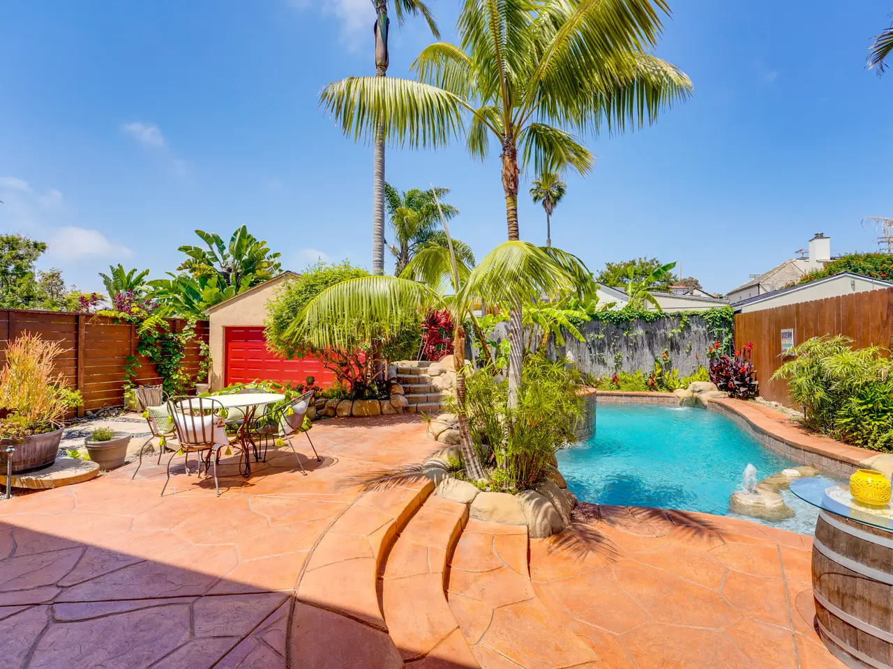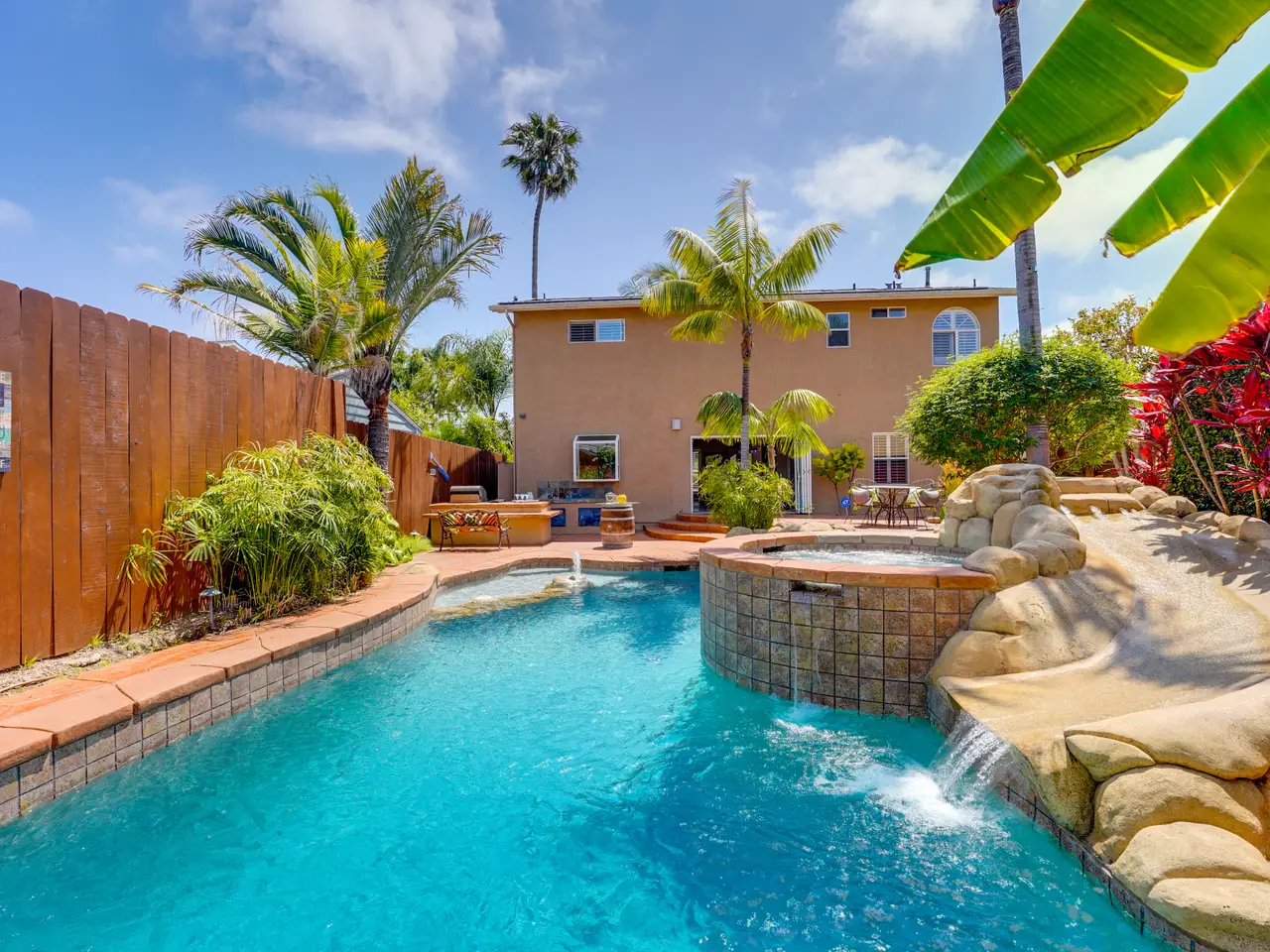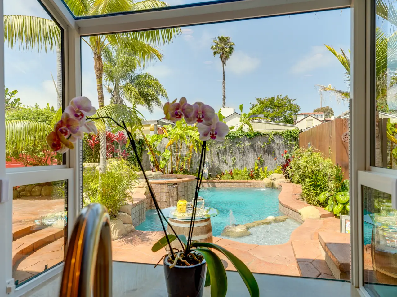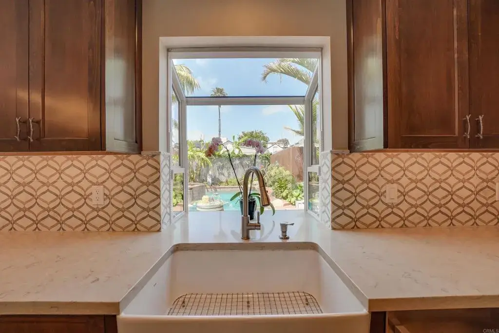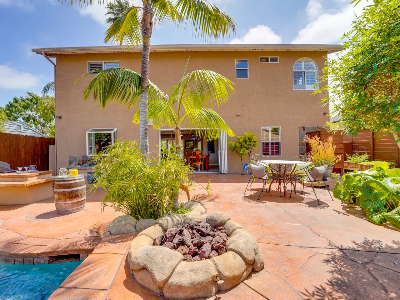 Set in one of Point Loma’s most sought-after neighborhoods, this thoughtfully remodeled Loma Portal residence blends timeless coastal style with elevated indoor-outdoor living. A versatile layout includes four bedrooms and three full bathrooms, with two bedrooms and a full bath conveniently located on the main level—perfect for guests, multigenerational living, or a dedicated home office. The heart of the home is an open, light-filled floor plan featuring rich wood flooring, large windows, and a beautifully renovated chef’s kitchen. Custom wood cabinetry, quartz countertops, a gas cooktop, and full-size double electric ovens create a gourmet experience, while a wine bar with wine refrigerator and designer lighting adds a refined touch to the adjacent dining area. The living space flows effortlessly to the backyard through expansive La Cantina folding glass doors, creating a seamless connection between indoors and out. The resort-style backyard is designed for both relaxation and entertainment, inspired by South Pacific ambiance. A sparkling pool with slide and fountains, spa, outdoor kitchen with built-in BBQ, gas burner, sink, and shower make it a true retreat. Lush tropical landscaping, swaying palms, raised garden beds, and a hand-placed stone zen garden complete the tranquil oasis. Upstairs, the serene primary suite offers a luxurious escape, complete with a striking three-sided fireplace, retreat area, and access to a private balcony shared with the third upstairs bedroom—perfect for enjoying morning coffee, ocean breezes, and evening sunsets. The spa-inspired ensuite bath includes a deep soaking tub, walk-in shower, and dual vanities. Additional highlights include an owned solar system for energy efficiency, a finished two-car garage, manicured front lawn, and a location that places you just minutes from Liberty Station, Rosecrans shops and dining, downtown, and area beaches via Chatsworth. This exceptional home captures the very best of Point Loma living—comfort, style, and convenience in one thoughtfully designed package.