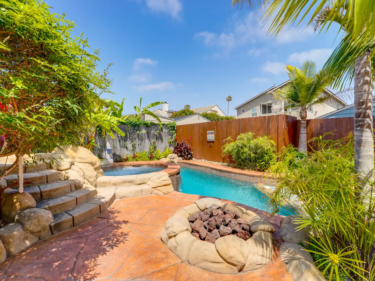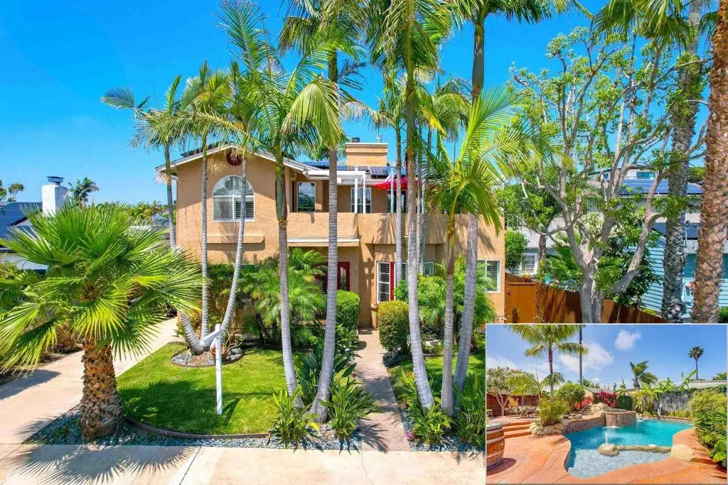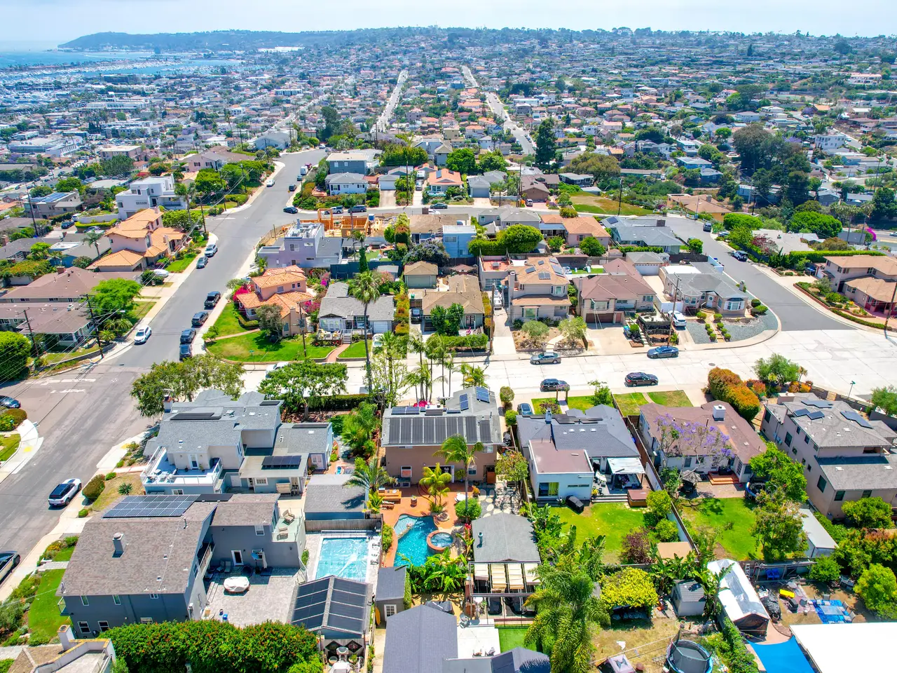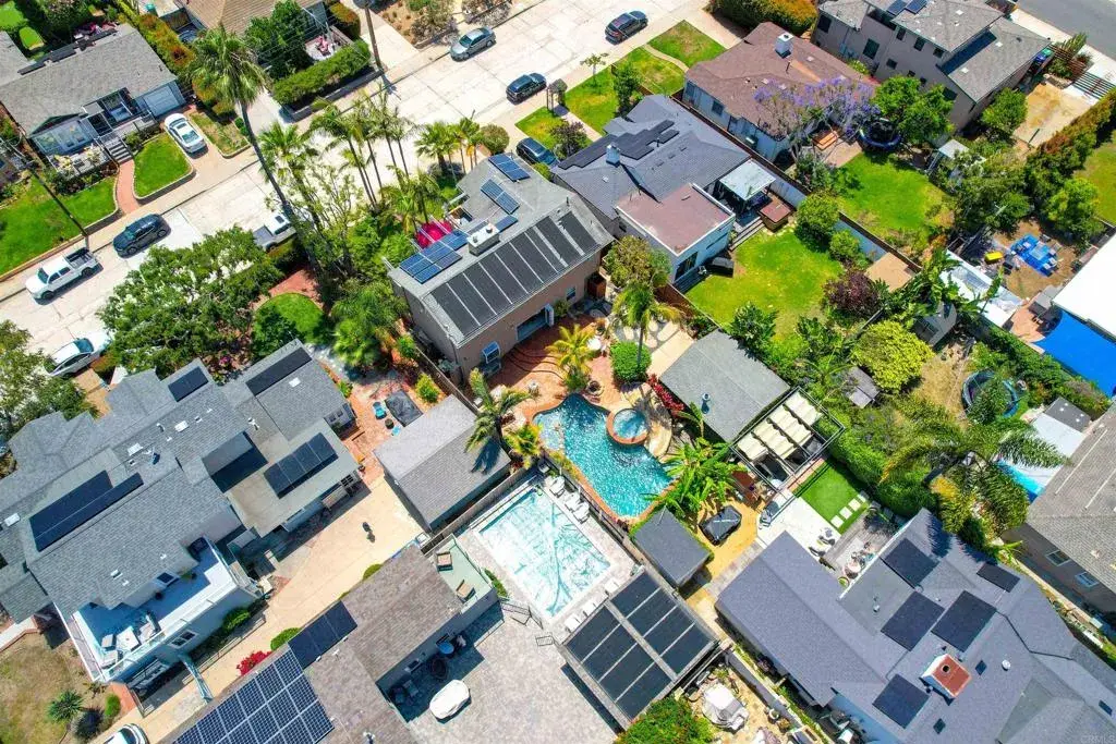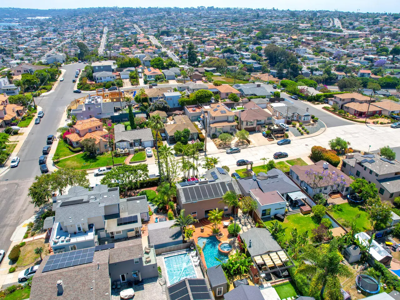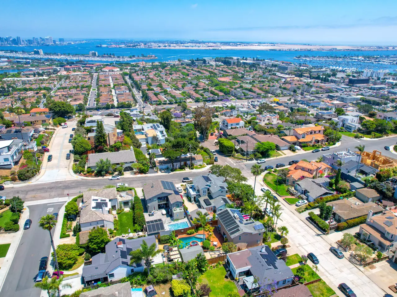 Set in one of Point Loma’s most sought-after neighborhoods, this thoughtfully remodeled Loma Portal residence blends timeless coastal style with elevated indoor-outdoor living. A versatile layout includes four bedrooms and three full bathrooms, with two bedrooms and a full bath conveniently located on the main level—perfect for guests, multigenerational living, or a dedicated home office. The heart of the home is an open, light-filled floor plan featuring rich wood flooring, large windows, and a beautifully renovated chef’s kitchen. Custom wood cabinetry, quartz countertops, a gas cooktop, and full-size double electric ovens create a gourmet experience, while a wine bar with wine refrigerator and designer lighting adds a refined touch to the adjacent dining area. The living space flows effortlessly to the backyard through expansive La Cantina folding glass doors, creating a seamless connection between indoors and out. The resort-style backyard is designed for both relaxation and entertainment, inspired by South Pacific ambiance. A sparkling pool with slide and fountains, spa, outdoor kitchen with built-in BBQ, gas burner, sink, and shower make it a true retreat. Lush tropical landscaping, swaying palms, raised garden beds, and a hand-placed stone zen garden complete the tranquil oasis. Upstairs, the serene primary suite offers a luxurious escape, complete with a striking three-sided fireplace, retreat area, and access to a private balcony shared with the third upstairs bedroom—perfect for enjoying morning coffee, ocean breezes, and evening sunsets. The spa-inspired ensuite bath includes a deep soaking tub, walk-in shower, and dual vanities. Additional highlights include an owned solar system for energy efficiency, a finished two-car garage, manicured front lawn, and a location that places you just minutes from Liberty Station, Rosecrans shops and dining, downtown, and area beaches via Chatsworth. This exceptional home captures the very best of Point Loma living—comfort, style, and convenience in one thoughtfully designed package.