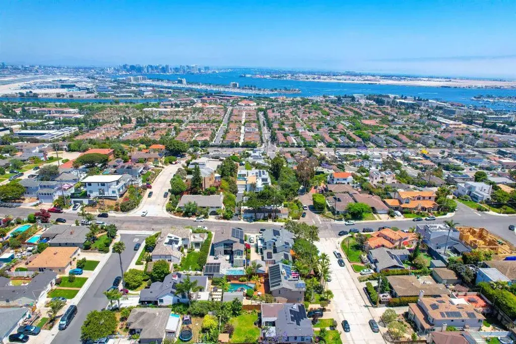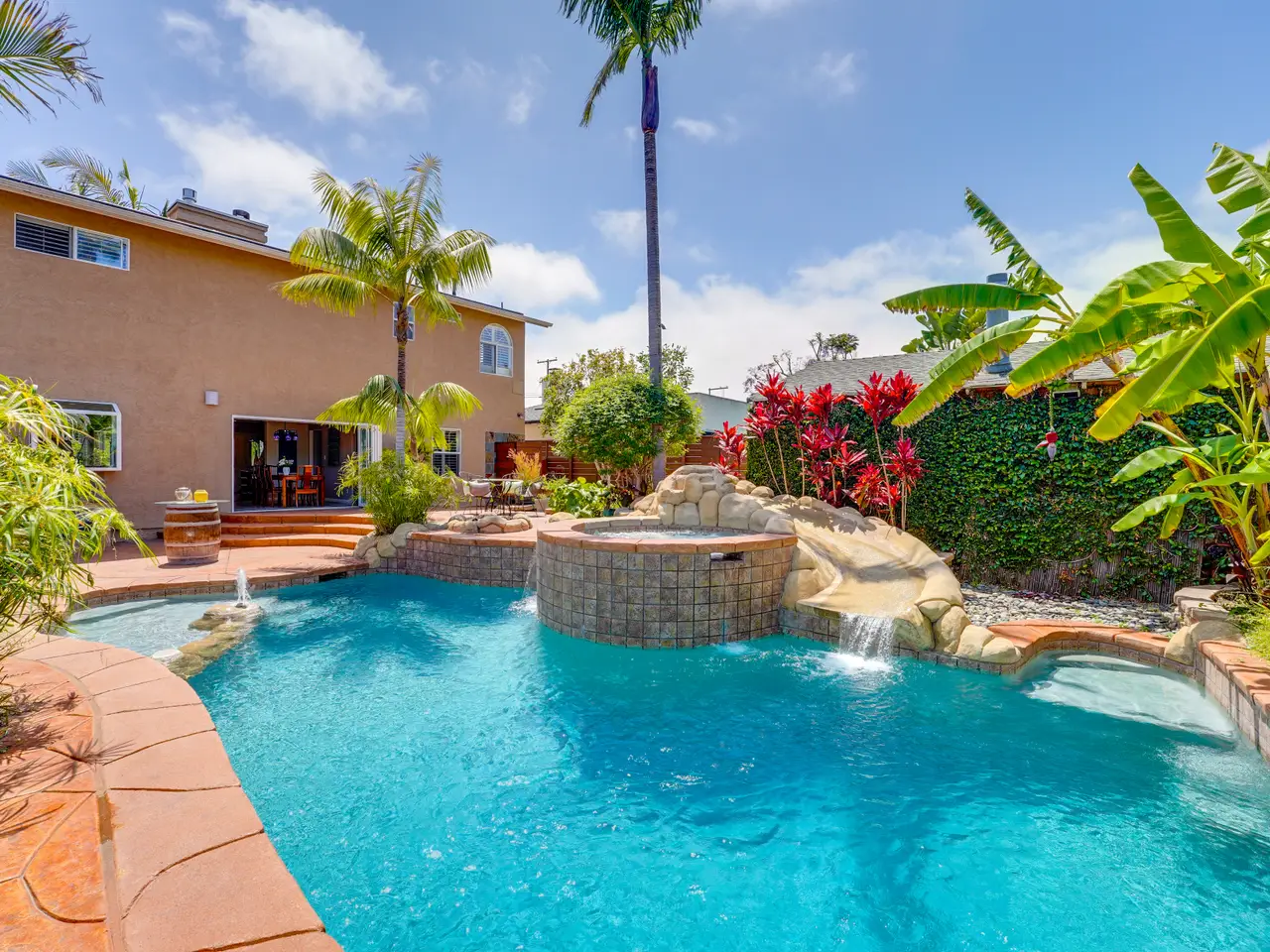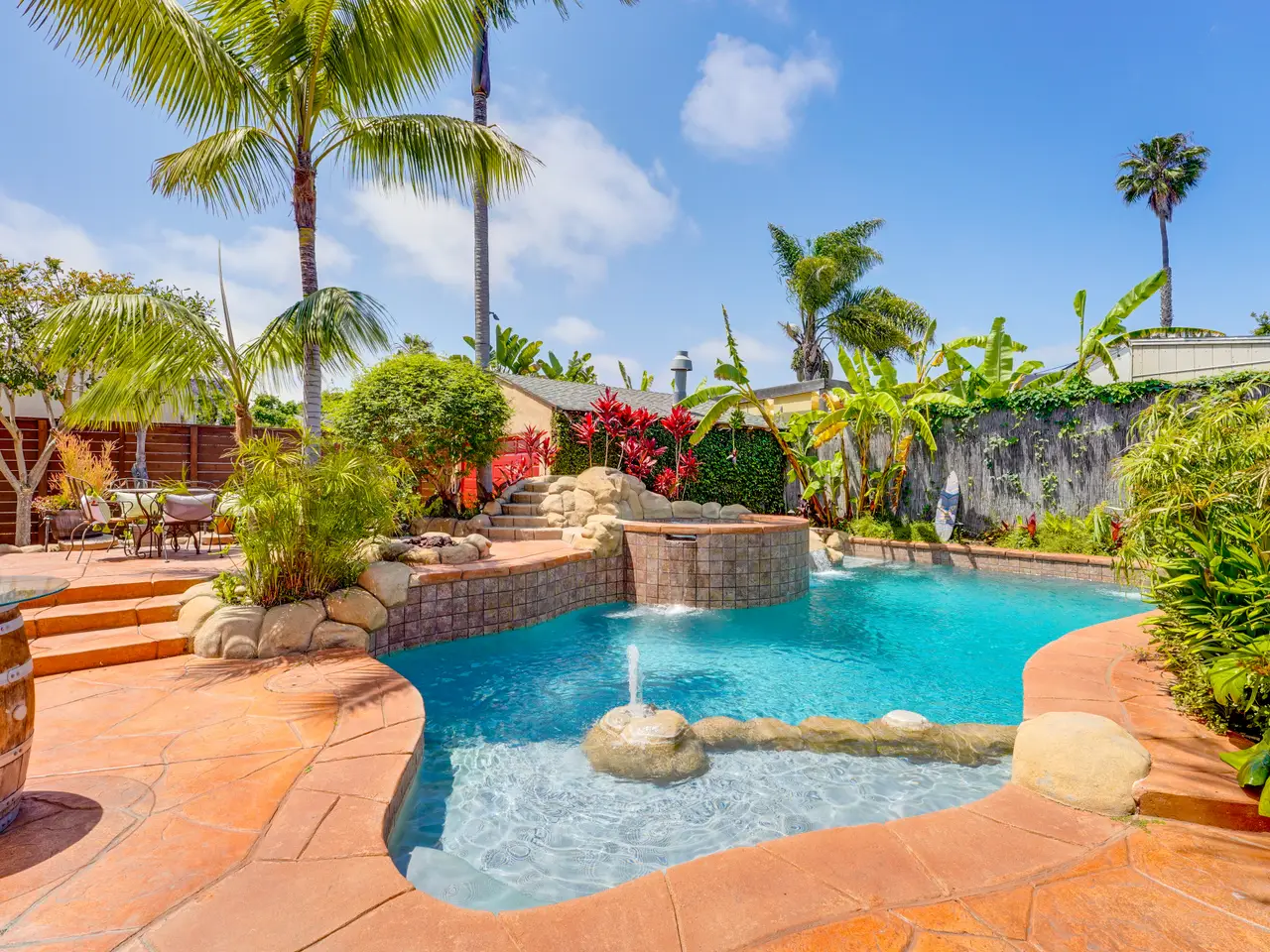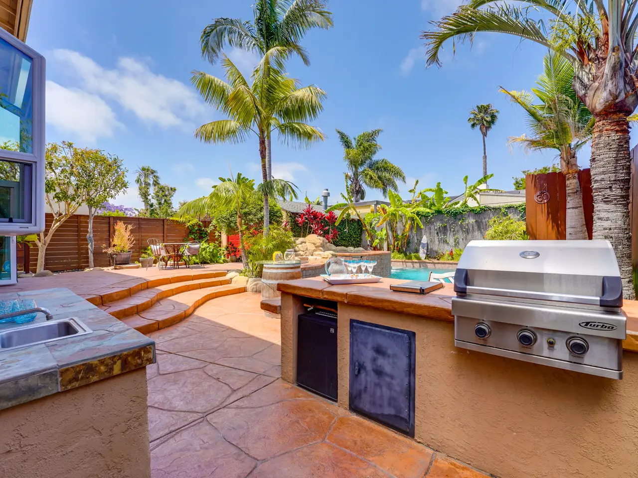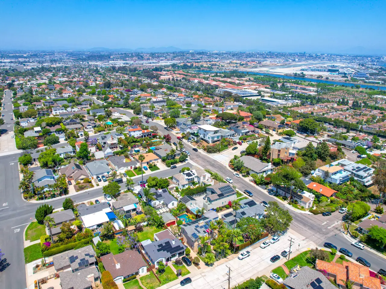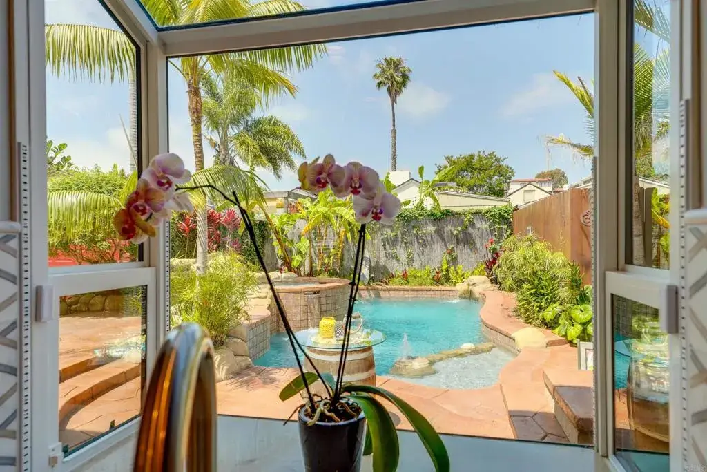 Set in one of Point Loma’s most sought-after neighborhoods, this thoughtfully remodeled Loma Portal residence blends timeless coastal style with elevated indoor-outdoor living. A versatile layout includes four bedrooms and three full bathrooms, with two bedrooms and a full bath conveniently located on the main level—perfect for guests, multigenerational living, or a dedicated home office. The heart of the home is an open, light-filled floor plan featuring rich wood flooring, large windows, and a beautifully renovated chef’s kitchen. Custom wood cabinetry, quartz countertops, a gas cooktop, and full-size double electric ovens create a gourmet experience, while a wine bar with wine refrigerator and designer lighting adds a refined touch to the adjacent dining area. The living space flows effortlessly to the backyard through expansive La Cantina folding glass doors, creating a seamless connection between indoors and out. The resort-style backyard is designed for both relaxation and entertainment, inspired by South Pacific ambiance. A sparkling pool with slide and fountains, spa, outdoor kitchen with built-in BBQ, gas burner, sink, and shower make it a true retreat. Lush tropical landscaping, swaying palms, raised garden beds, and a hand-placed stone zen garden complete the tranquil oasis. Upstairs, the serene primary suite offers a luxurious escape, complete with a striking three-sided fireplace, retreat area, and access to a private balcony shared with the third upstairs bedroom—perfect for enjoying morning coffee, ocean breezes, and evening sunsets. The spa-inspired ensuite bath includes a deep soaking tub, walk-in shower, and dual vanities. Additional highlights include an owned solar system for energy efficiency, a finished two-car garage, manicured front lawn, and a location that places you just minutes from Liberty Station, Rosecrans shops and dining, downtown, and area beaches via Chatsworth. This exceptional home captures the very best of Point Loma living—comfort, style, and convenience in one thoughtfully designed package.