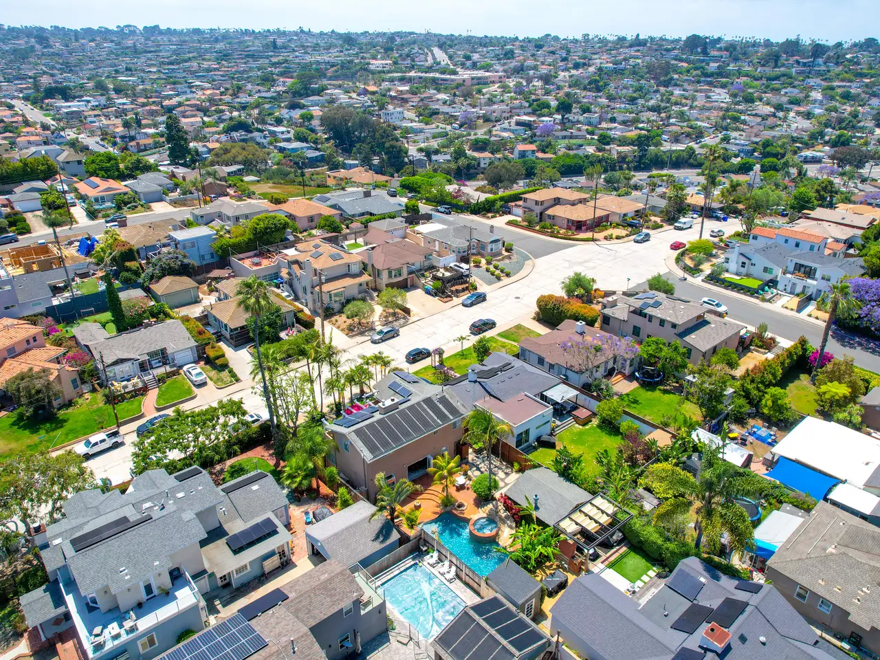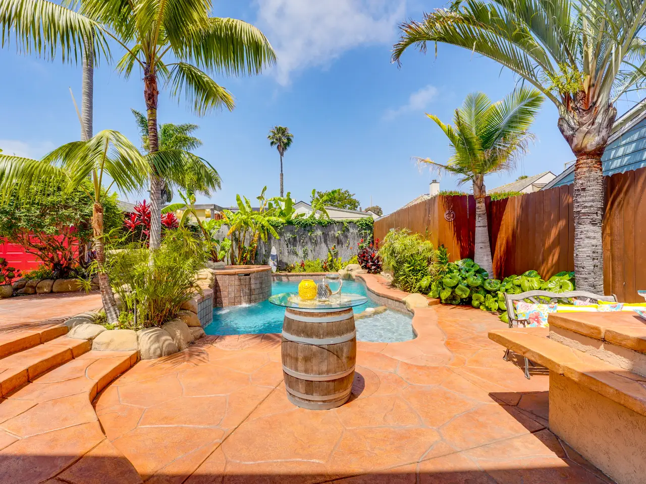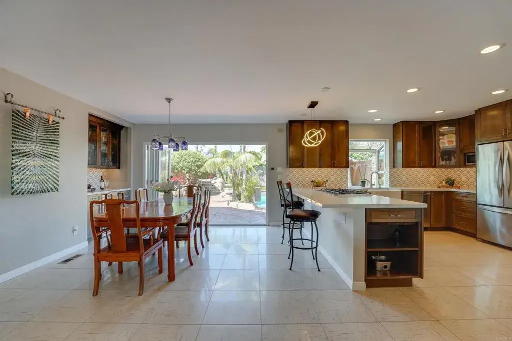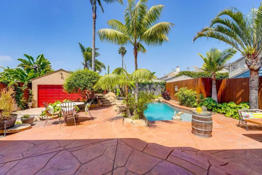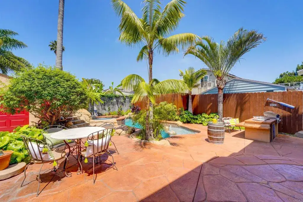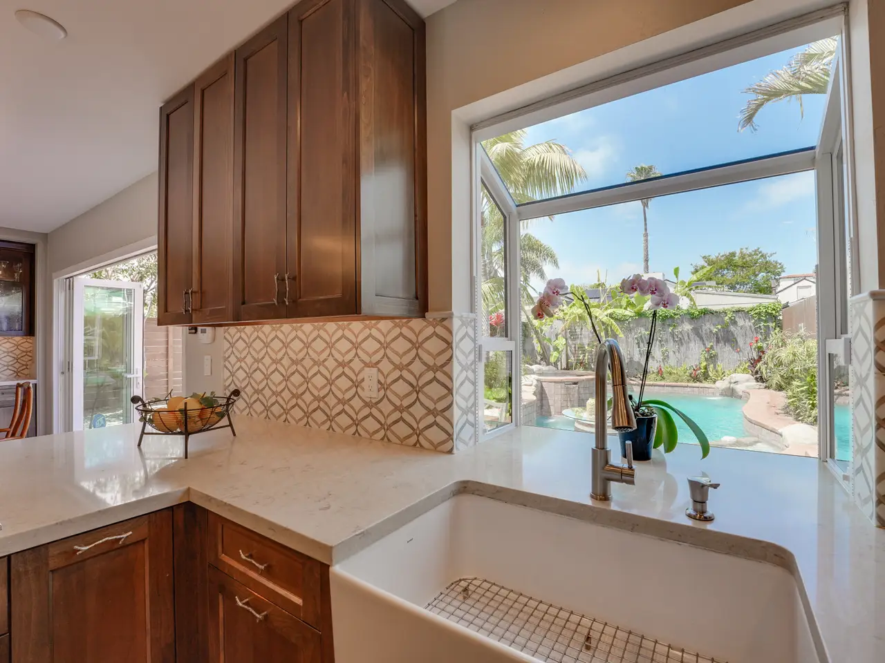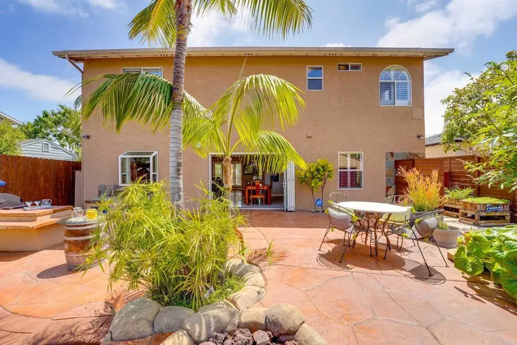 Set in one of Point Loma’s most sought-after neighborhoods, this thoughtfully remodeled Loma Portal residence blends timeless coastal style with elevated indoor-outdoor living. A versatile layout includes four bedrooms and three full bathrooms, with two bedrooms and a full bath conveniently located on the main level—perfect for guests, multigenerational living, or a dedicated home office. The heart of the home is an open, light-filled floor plan featuring rich wood flooring, large windows, and a beautifully renovated chef’s kitchen. Custom wood cabinetry, quartz countertops, a gas cooktop, and full-size double electric ovens create a gourmet experience, while a wine bar with wine refrigerator and designer lighting adds a refined touch to the adjacent dining area. The living space flows effortlessly to the backyard through expansive La Cantina folding glass doors, creating a seamless connection between indoors and out. The resort-style backyard is designed for both relaxation and entertainment, inspired by South Pacific ambiance. A sparkling pool with slide and fountains, spa, outdoor kitchen with built-in BBQ, gas burner, sink, and shower make it a true retreat. Lush tropical landscaping, swaying palms, raised garden beds, and a hand-placed stone zen garden complete the tranquil oasis. Upstairs, the serene primary suite offers a luxurious escape, complete with a striking three-sided fireplace, retreat area, and access to a private balcony shared with the third upstairs bedroom—perfect for enjoying morning coffee, ocean breezes, and evening sunsets. The spa-inspired ensuite bath includes a deep soaking tub, walk-in shower, and dual vanities. Additional highlights include an owned solar system for energy efficiency, a finished two-car garage, manicured front lawn, and a location that places you just minutes from Liberty Station, Rosecrans shops and dining, downtown, and area beaches via Chatsworth. This exceptional home captures the very best of Point Loma living—comfort, style, and convenience in one thoughtfully designed package.