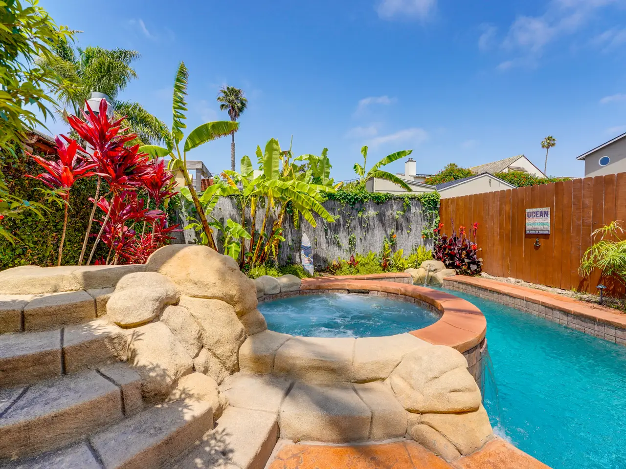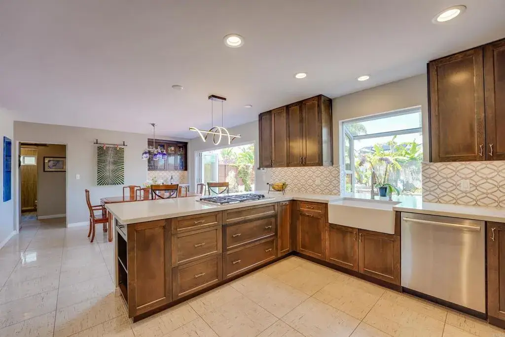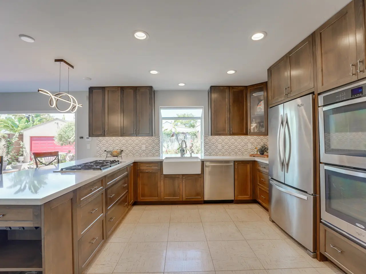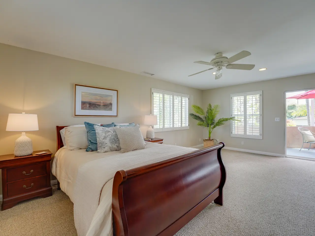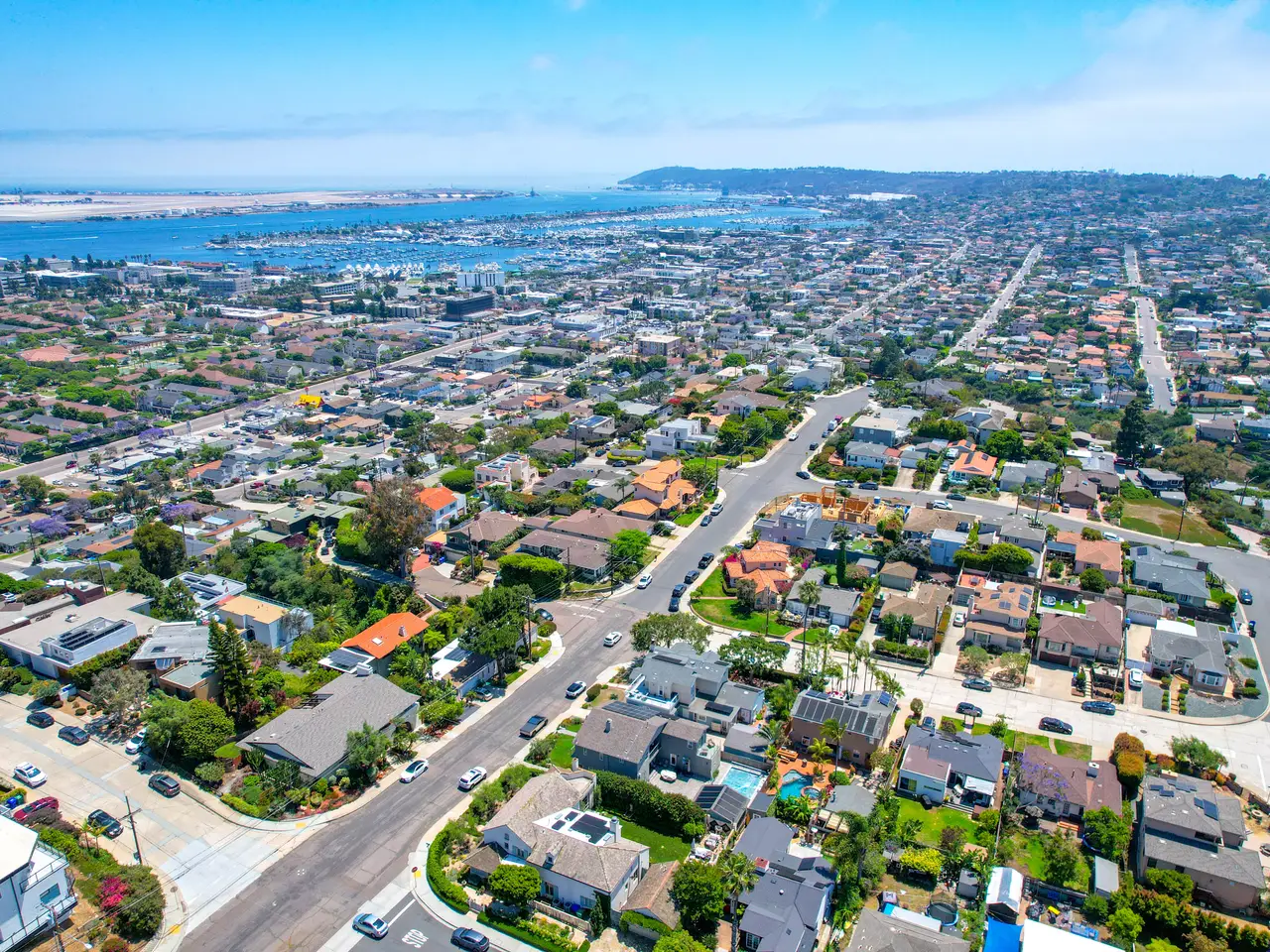 Set in one of Point Loma’s most sought-after neighborhoods, this thoughtfully remodeled Loma Portal residence blends timeless coastal style with elevated indoor-outdoor living. A versatile layout includes four bedrooms and three full bathrooms, with two bedrooms and a full bath conveniently located on the main level—perfect for guests, multigenerational living, or a dedicated home office. The heart of the home is an open, light-filled floor plan featuring rich wood flooring, large windows, and a beautifully renovated chef’s kitchen. Custom wood cabinetry, quartz countertops, a gas cooktop, and full-size double electric ovens create a gourmet experience, while a wine bar with wine refrigerator and designer lighting adds a refined touch to the adjacent dining area. The living space flows effortlessly to the backyard through expansive La Cantina folding glass doors, creating a seamless connection between indoors and out. The resort-style backyard is designed for both relaxation and entertainment, inspired by South Pacific ambiance. A sparkling pool with slide and fountains, spa, outdoor kitchen with built-in BBQ, gas burner, sink, and shower make it a true retreat. Lush tropical landscaping, swaying palms, raised garden beds, and a hand-placed stone zen garden complete the tranquil oasis. Upstairs, the serene primary suite offers a luxurious escape, complete with a striking three-sided fireplace, retreat area, and access to a private balcony shared with the third upstairs bedroom—perfect for enjoying morning coffee, ocean breezes, and evening sunsets. The spa-inspired ensuite bath includes a deep soaking tub, walk-in shower, and dual vanities. Additional highlights include an owned solar system for energy efficiency, a finished two-car garage, manicured front lawn, and a location that places you just minutes from Liberty Station, Rosecrans shops and dining, downtown, and area beaches via Chatsworth. This exceptional home captures the very best of Point Loma living—comfort, style, and convenience in one thoughtfully designed package.